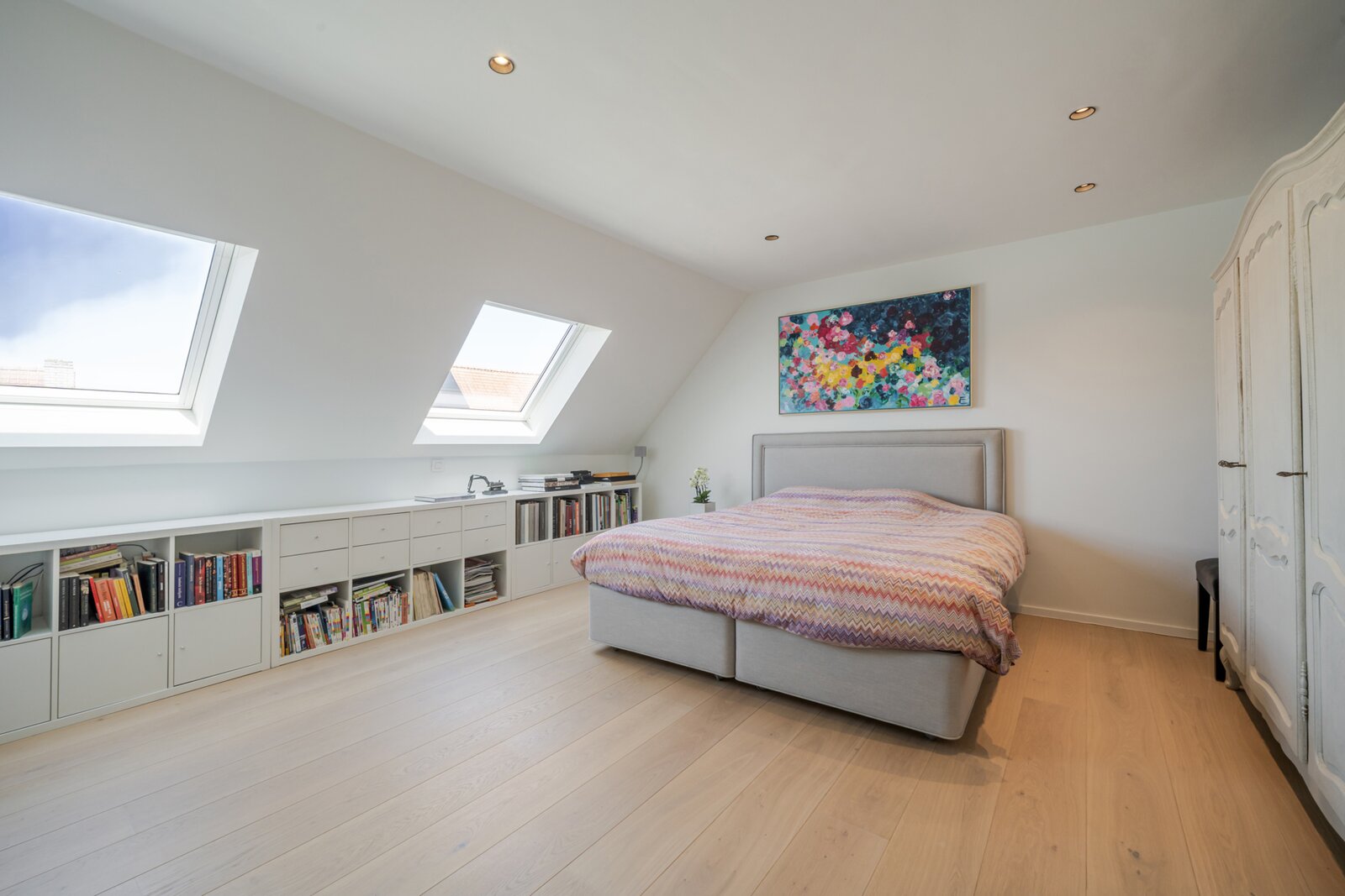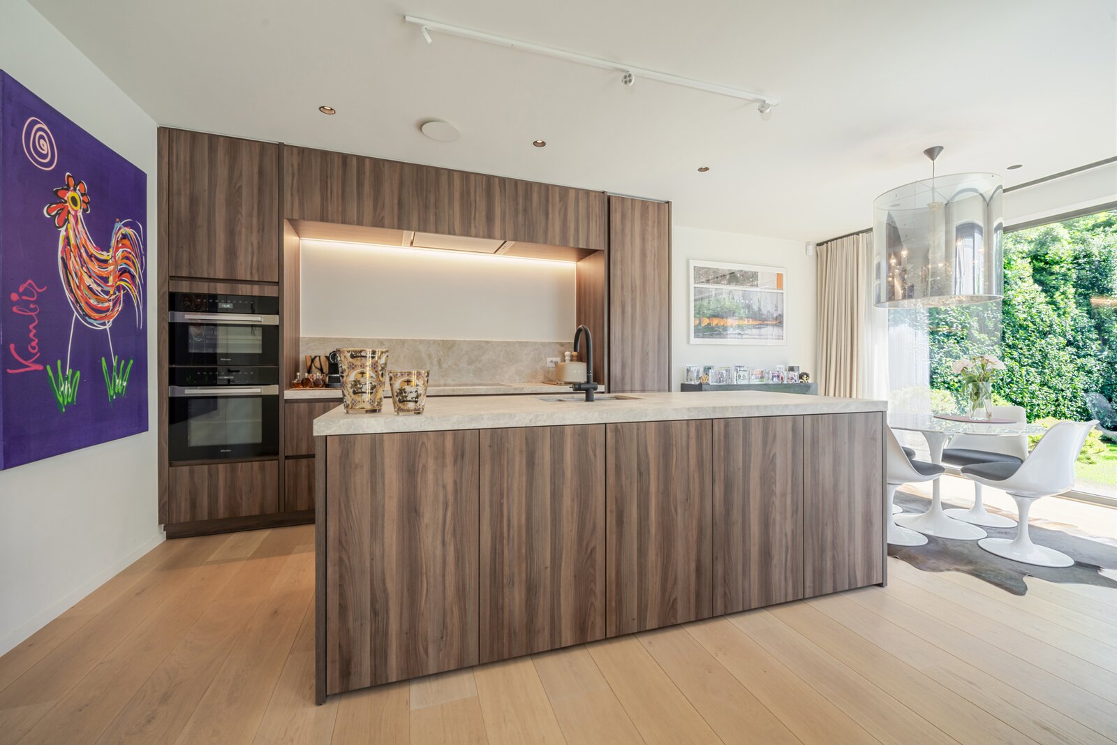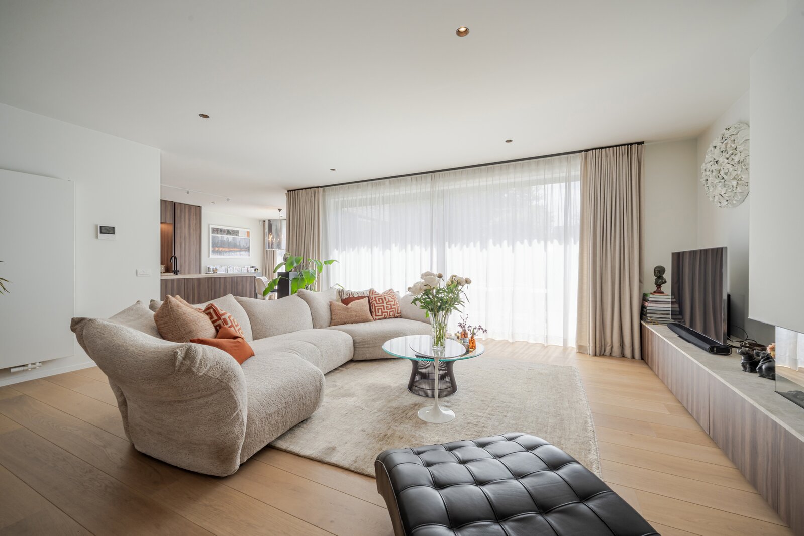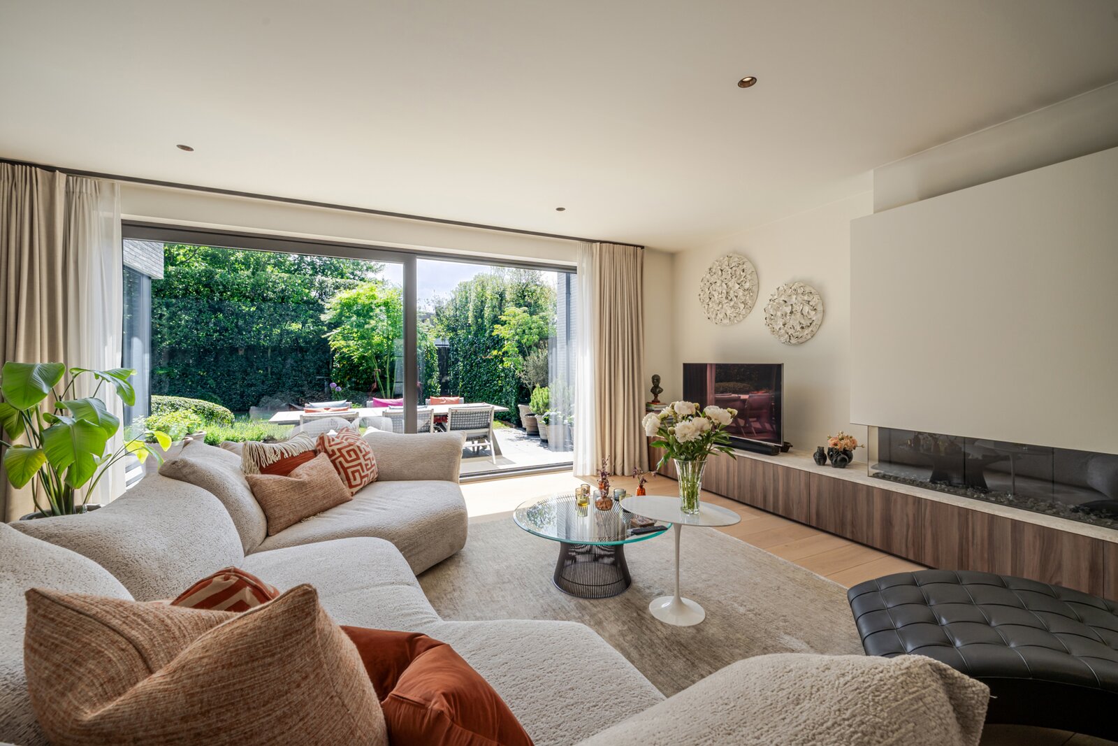 La maison comprend un hall d’entrée avec vestiaire et toilette invités, un bureau avec placards sur mesure et un séjour lumineux avec feu au gaz. La cuisine ouverte, équipée d’appareils Miele et d’un coin petit-déjeuner, donne accès à la terrasse ensoleillée et au jardin orienté sud. Buanderie pratique.