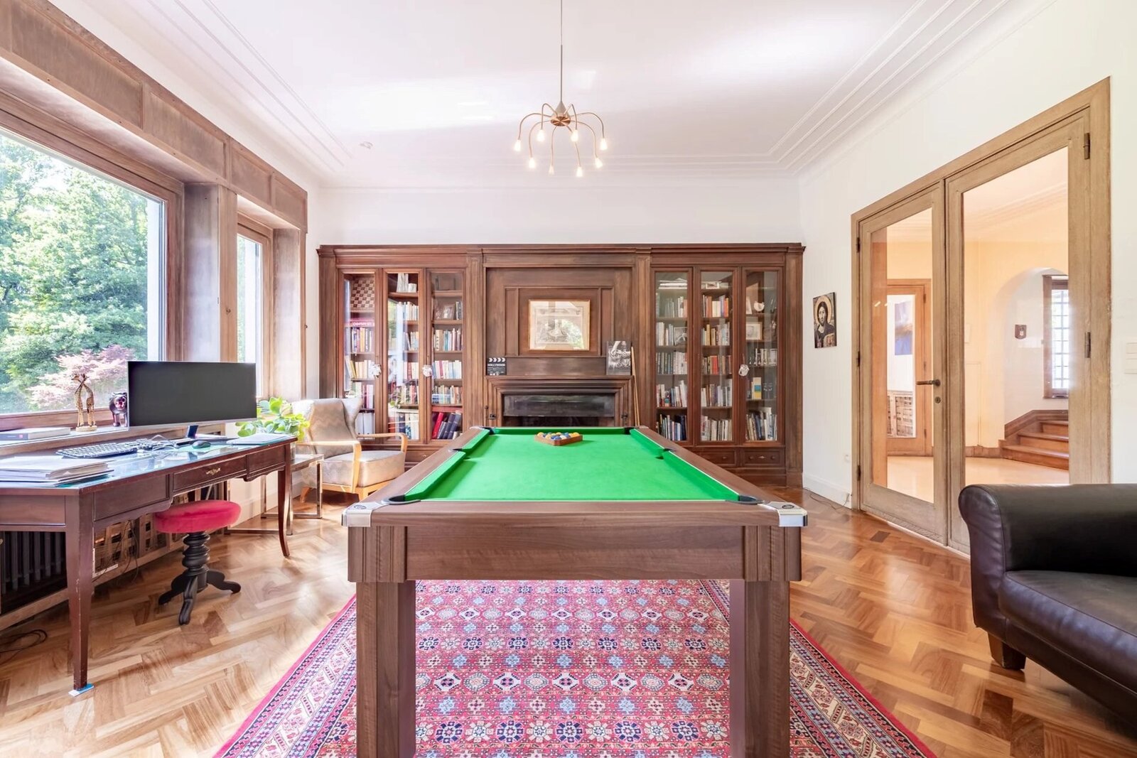 Le rez-de-chaussée accueille un vaste hall d’entrée avec feu ouvert, vestiaire et toilettes invités, une bibliothèque, un salon agrémenté d’une seconde cheminée, une cuisine ouverte entièrement équipée avec coin à déjeuner, une arrière-cuisine, un garage pour trois véhicules, une entrée de service, trois bureaux, une cuisine de service et des sanitaires additionnels.
