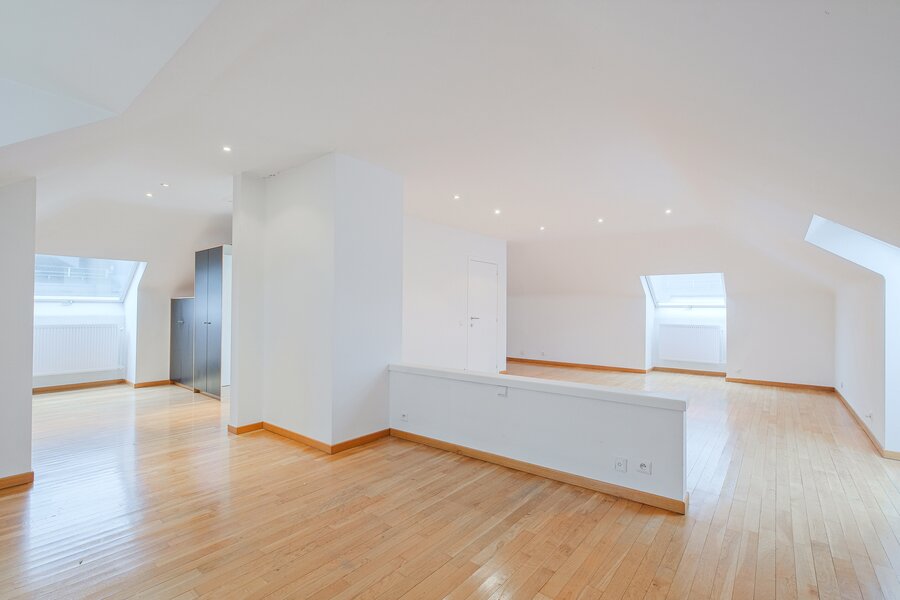 Au deuxième étage (107m²) : grande chambre de ± 46 m² pouvant être divisée en deux, dressing et salle de douche.