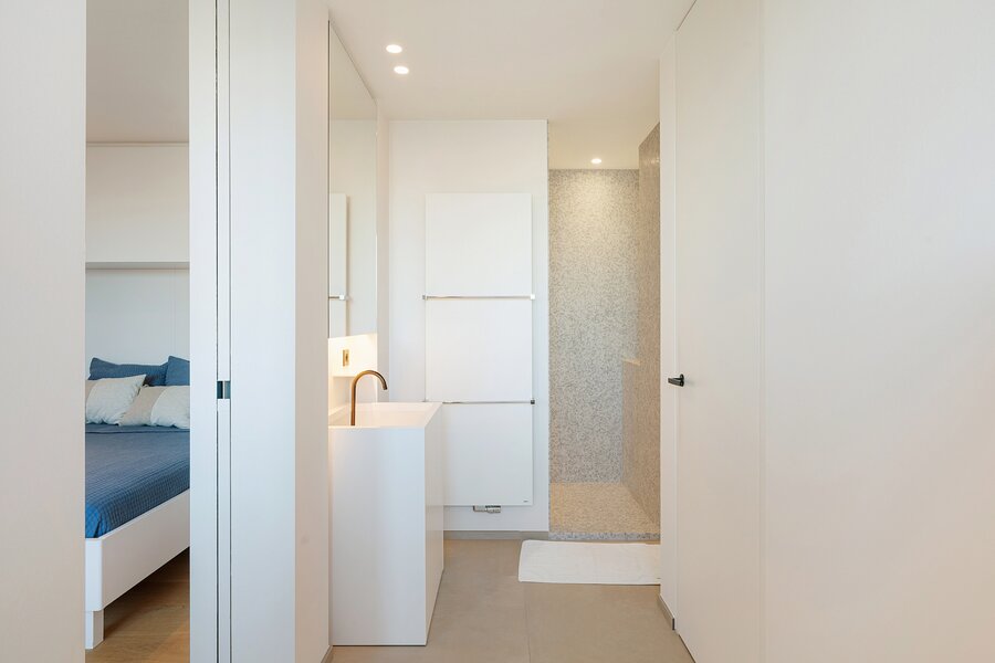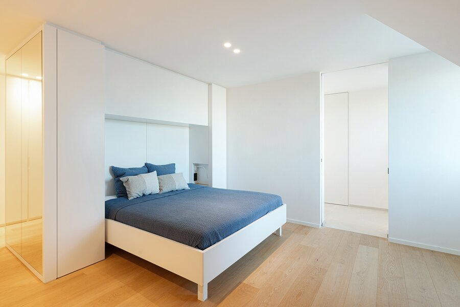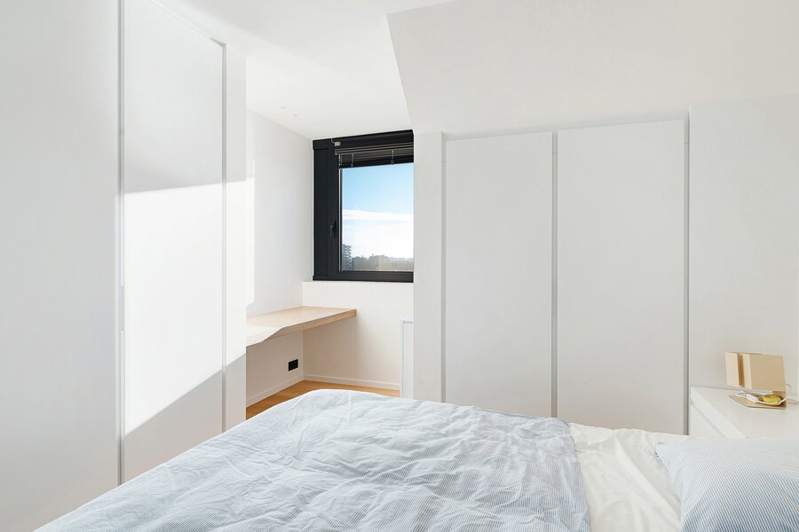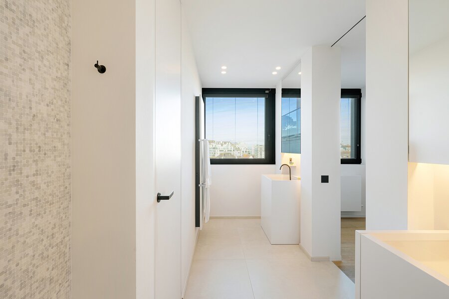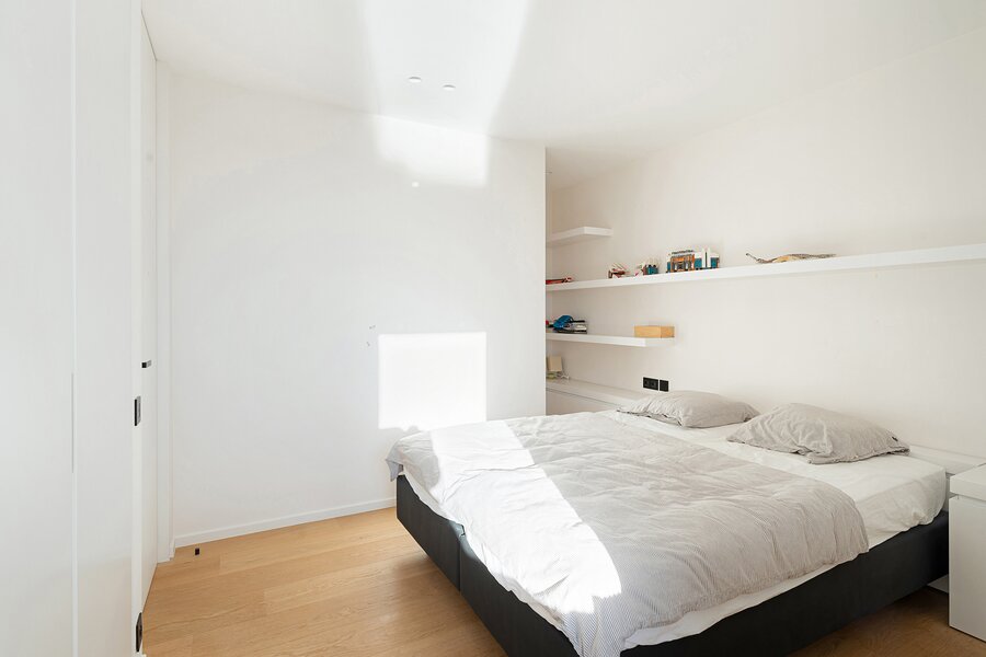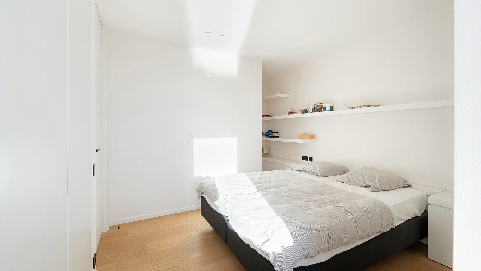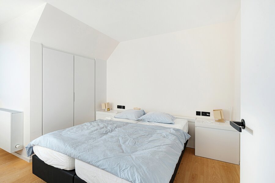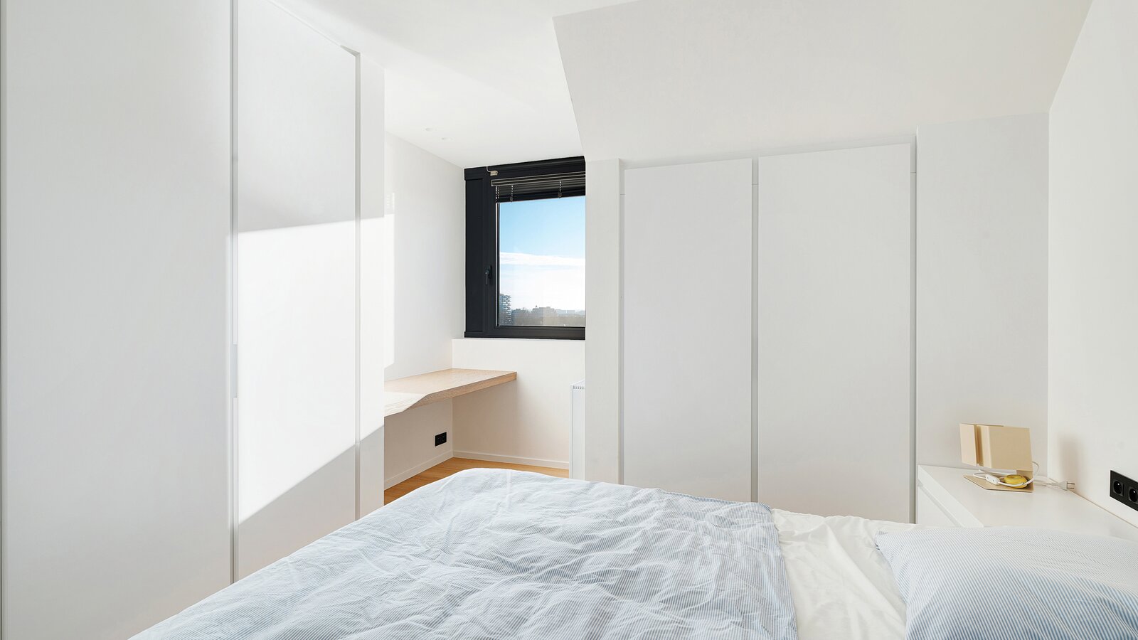 L’appartement dispose de quatre chambres et de trois salles de bains. La chambre principale comprend un dressing attenant et une salle de bains spacieuse. Les deux autres chambres sont aménagées avec un lit double, un bureau et des placards intégrés. À l’étage, se trouvent également une salle de douche séparée et un espace de vie supplémentaire.