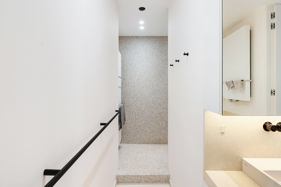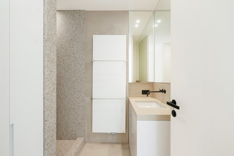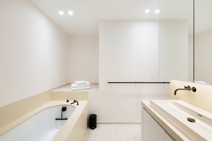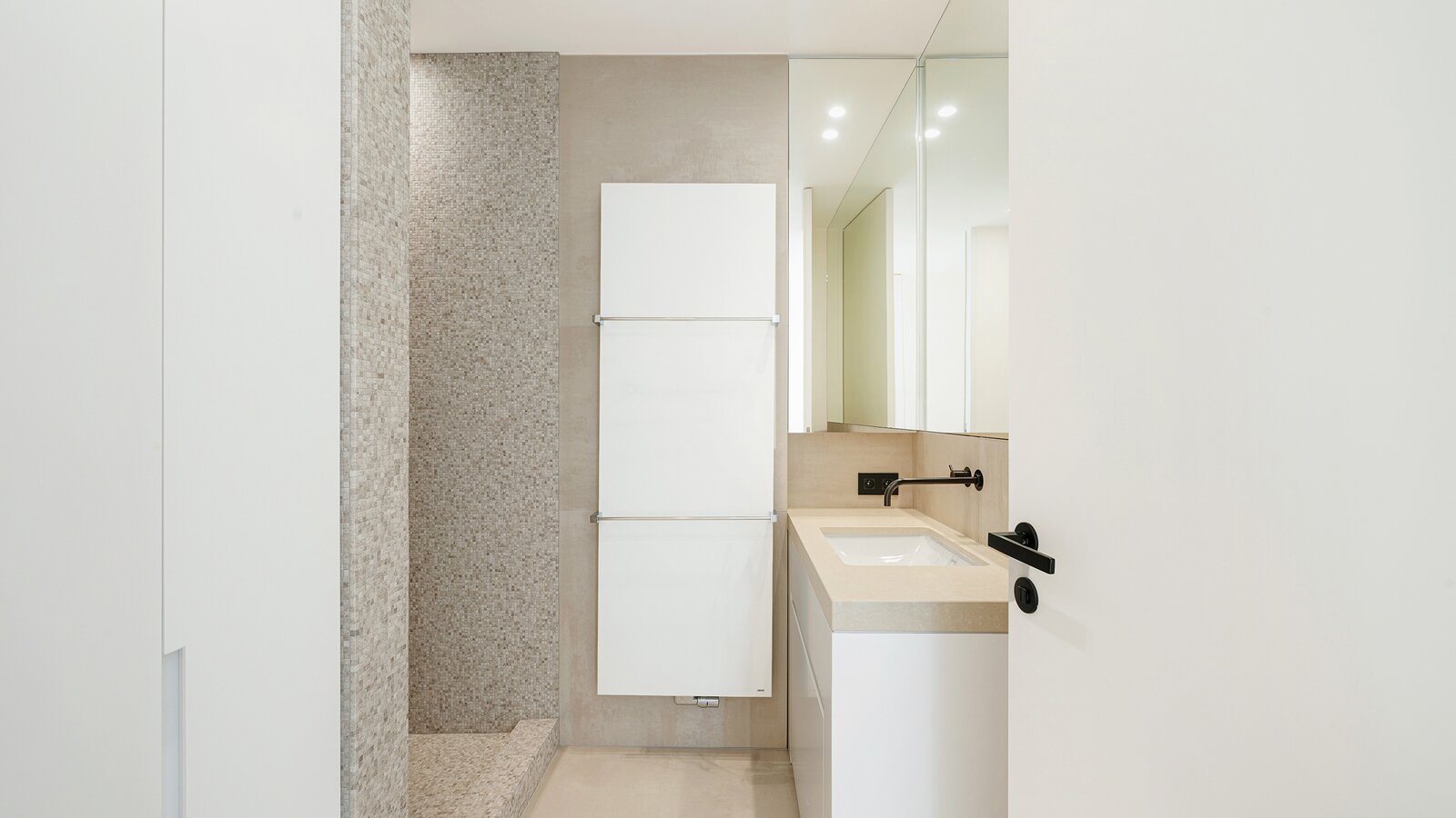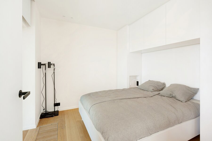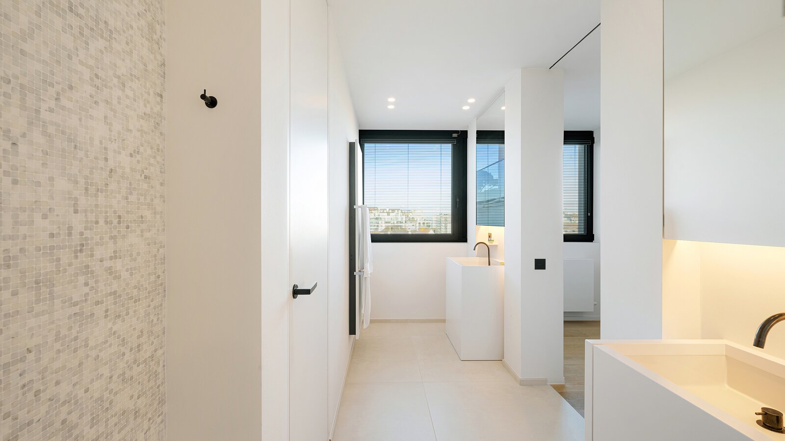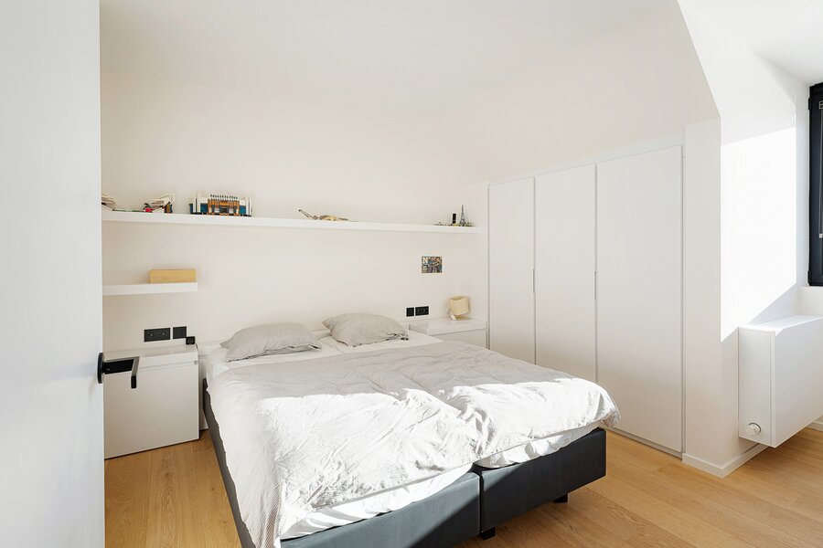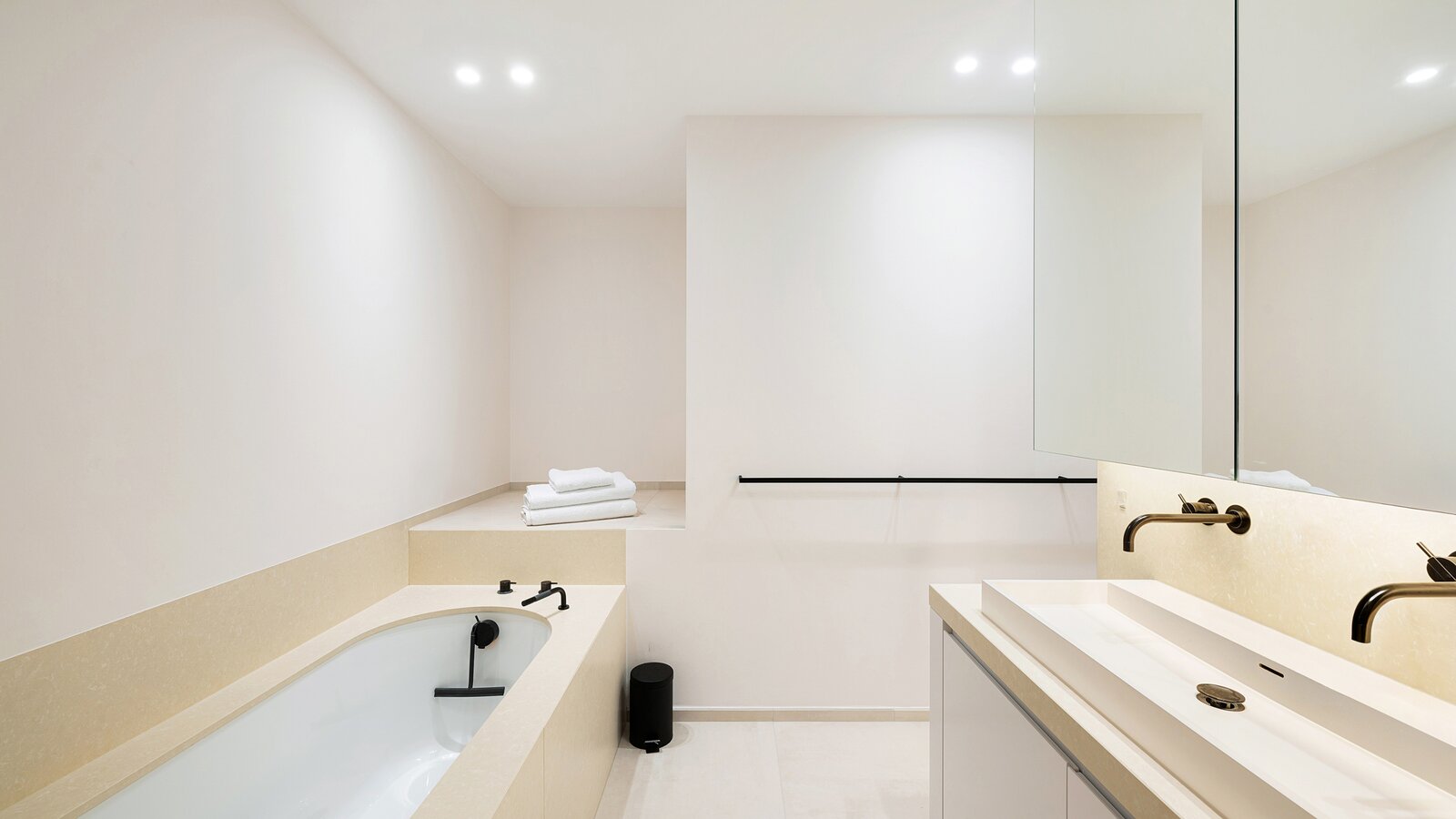 L’appartement dispose de quatre chambres et de trois salles de bains. La chambre principale comprend un dressing attenant et une salle de bains spacieuse. Les deux autres chambres sont aménagées avec un lit double, un bureau et des placards intégrés. À l’étage, se trouvent également une salle de douche séparée et un espace de vie supplémentaire.