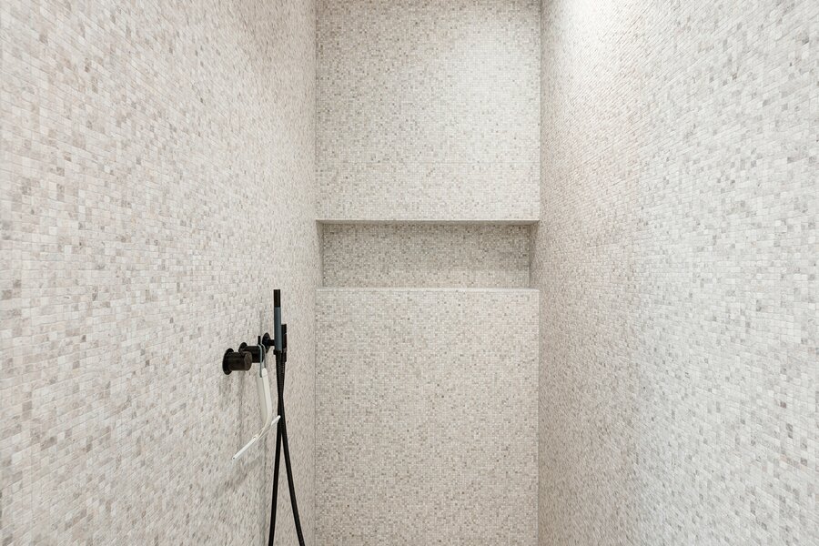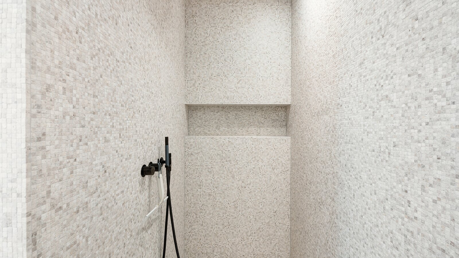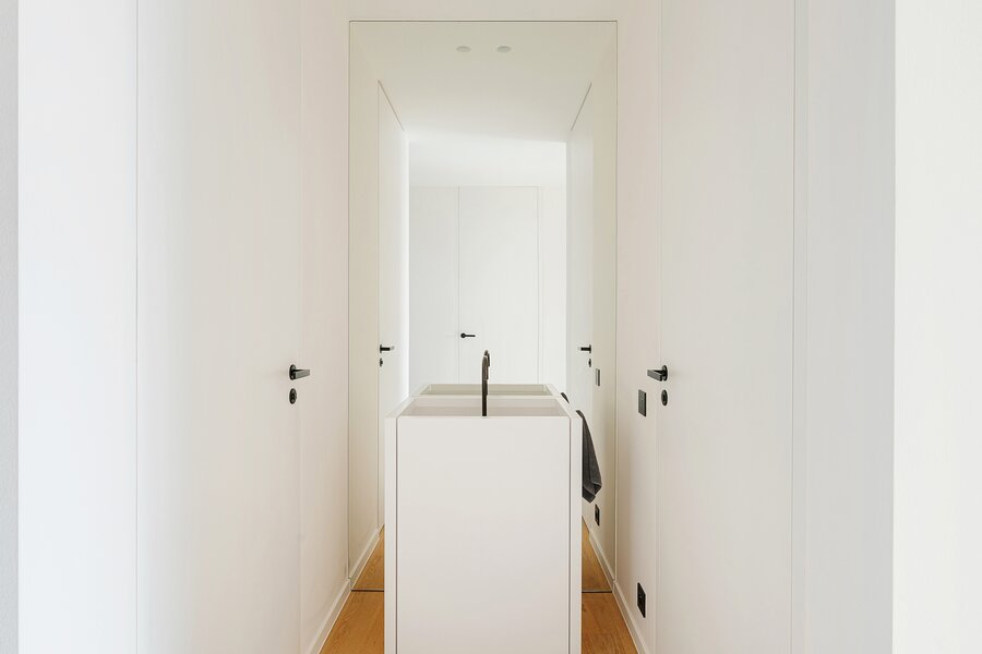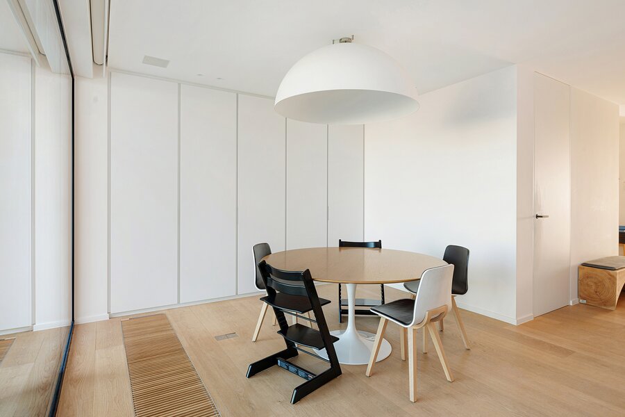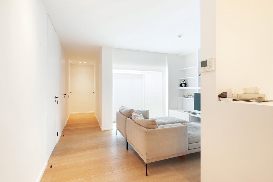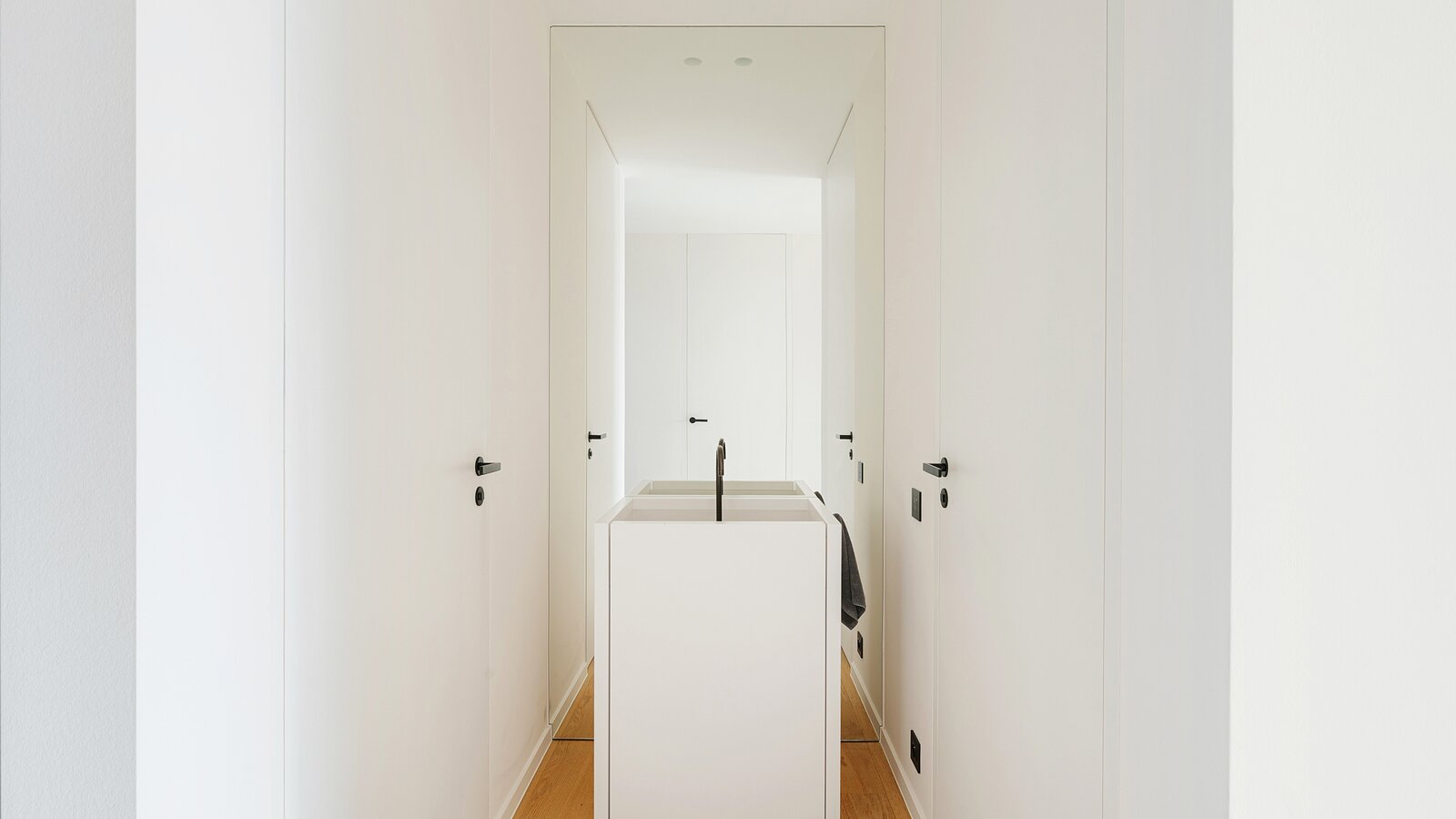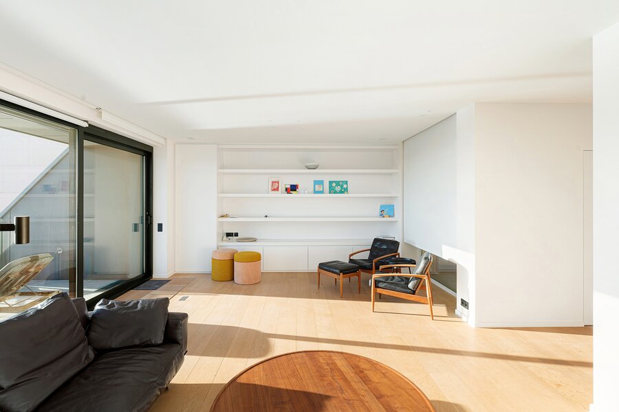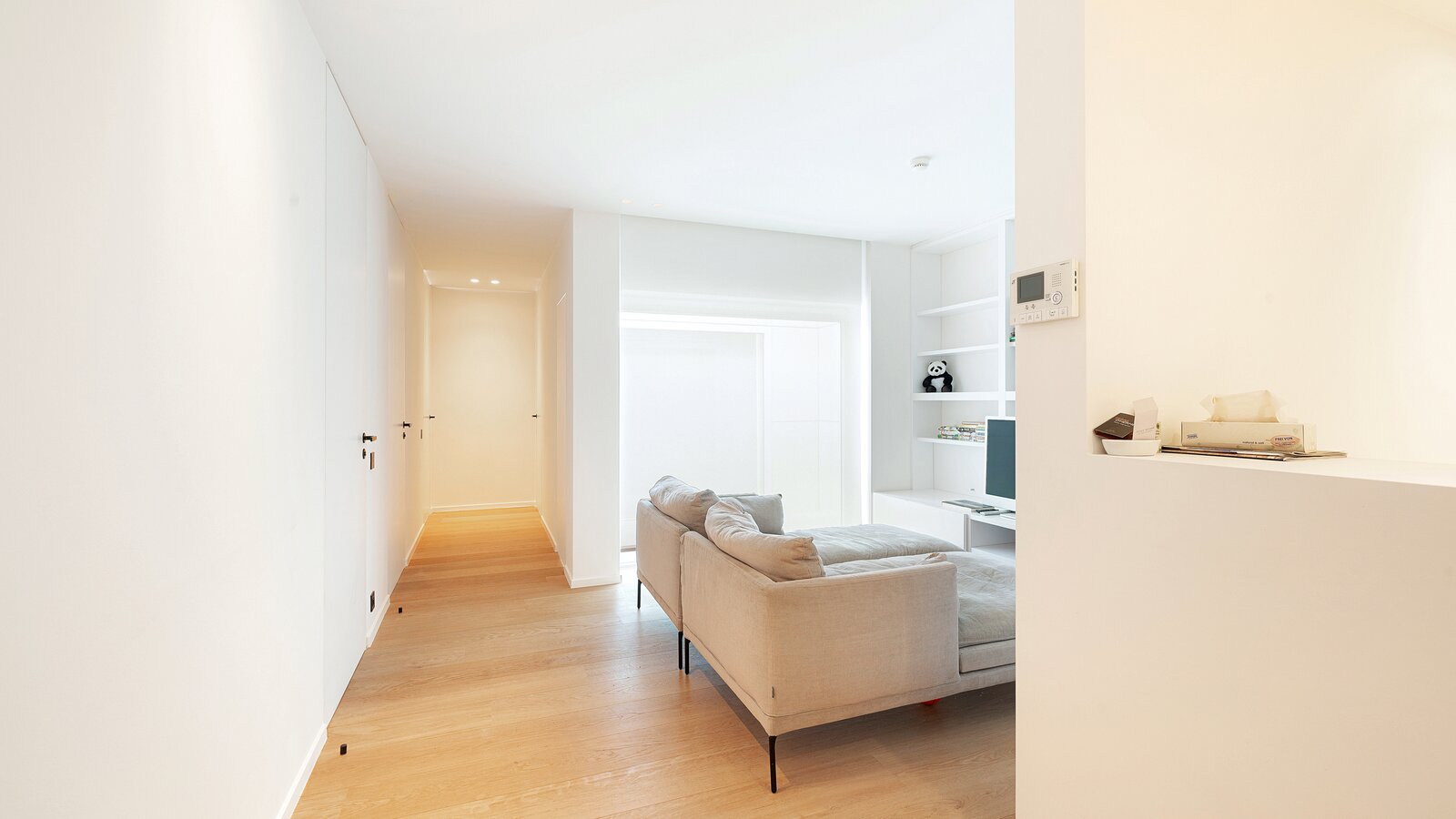 L’appartement dispose de quatre chambres et de trois salles de bains. La chambre principale comprend un dressing attenant et une salle de bains spacieuse. Les deux autres chambres sont aménagées avec un lit double, un bureau et des placards intégrés. À l’étage, se trouvent également une salle de douche séparée et un espace de vie supplémentaire.