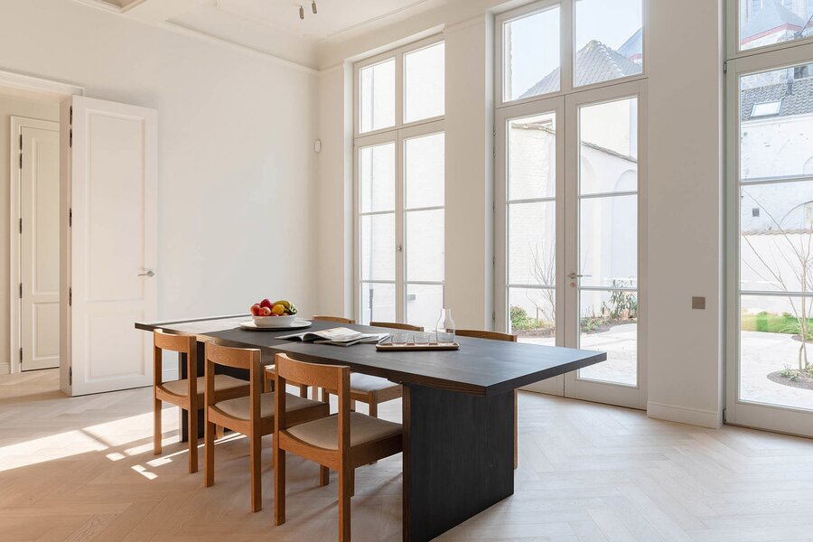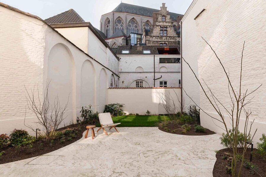 Appartement exclusif de plain-pied d'une superficie ca. 220 m² avec un jardin orienté sud ca. 97 m² offrant une vue panoramique sur la cathédrale Saint-Bavon, en plein cœur historique de Gand.