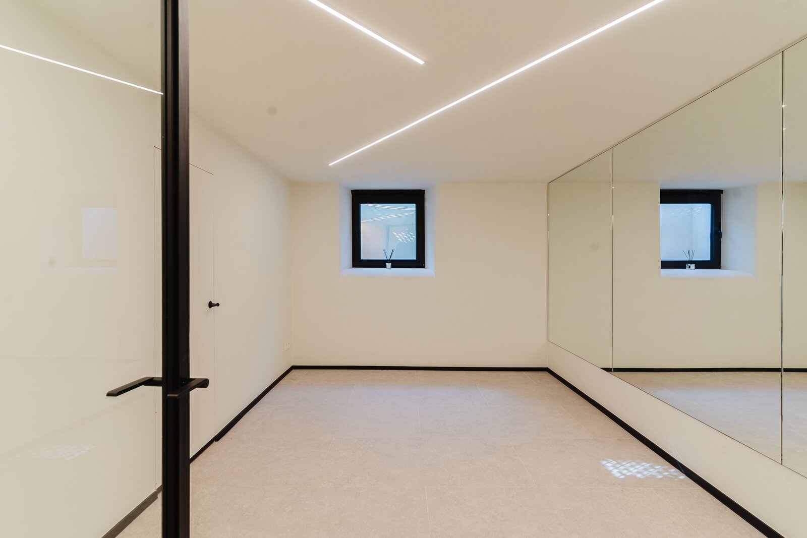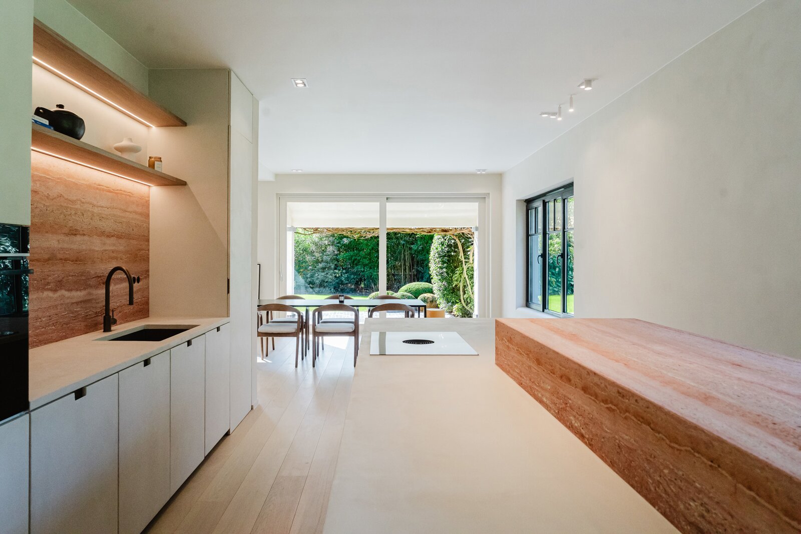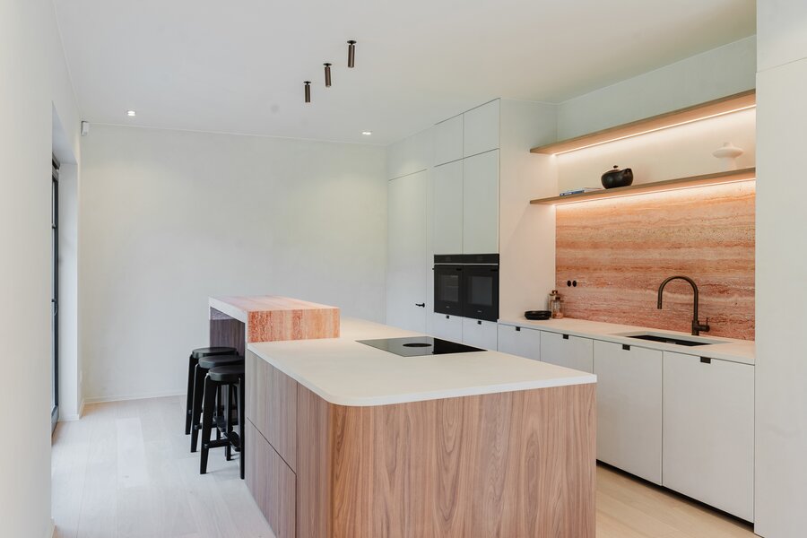 Le rez-de-chaussée se compose d'un hall d'entrée spacieux avec un escalier ouvert, d'un garage séparé, de toilettes pour invités, d'un salon lumineux donnant accès à la terrasse couverte, d'une cuisine ouverte entièrement équipée avec des matériaux haut de gamme (Mortex, noyer, travertin) qui donne accès à la deuxième terrasse ainsi qu'au débarras. La porte arrière permet d'accéder directement au sous-sol et à la cuisine. Le rez-de-chaussée a bénéficié de finitions haut de gamme et offre de nombreuses possibilités (cave à vin/espace bien-être/salle de sport/buanderie/bureau à domicile).
