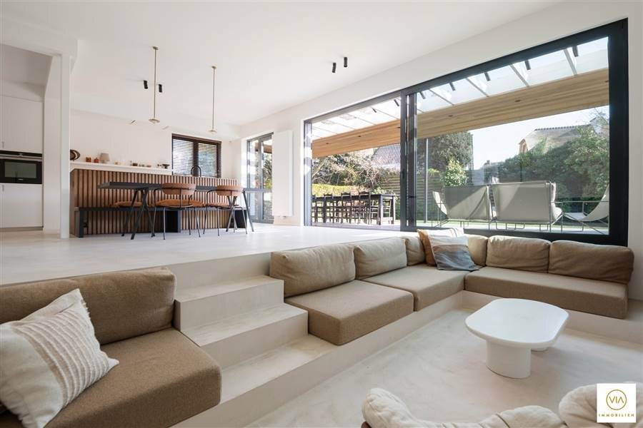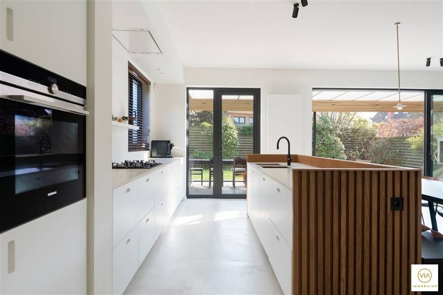 INTERIEUR EN INDELING: Het interieur kenmerkt zich door een magnifiek open woonconcept met hoge plafonds en veel natuurlijk licht. Het hart van de woning wordt gevormd door een moderne keuken met minimalistische witte kasten, natuurlijke houten accenten en een opvallend kookeiland Hoogwaardige roestvrijstalen apparaten, waaronder ingebouwde ovens en een gaskookplaat, zorgen voor modern comfort en stijl. De verfijnde keuken loopt naadloos over in de ruime eet- en woonkamer met aansluitend een zitput.