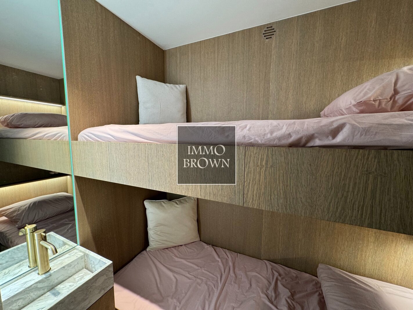 3 chambres à coucher, dont une avec un lit superposé intégré. La chambre principale dispose d'une salle de d'eau privée avec lavabo, douche et toilettes. Salle d'eau commune avec douche et lavabo dans le hall de nuit pour les 2 autres chambres.