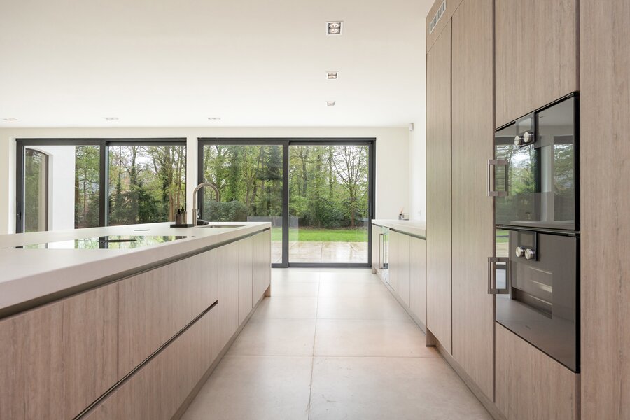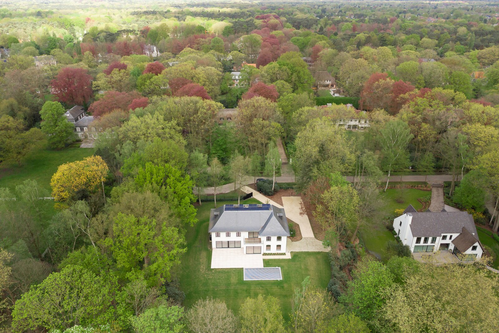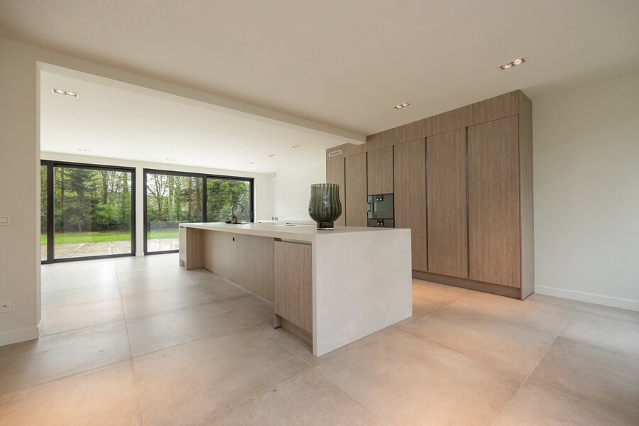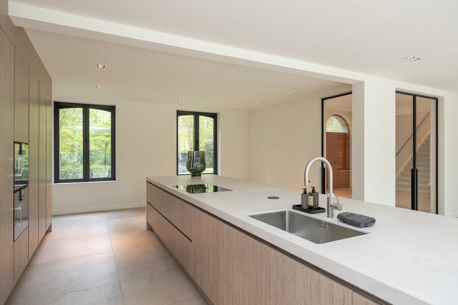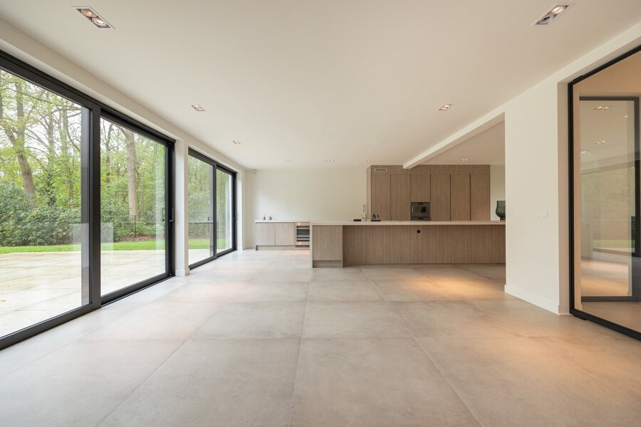 De woonkamer, uitkijkend op de tuin, heeft een parketvloer en een gezellige open haard. Aangrenzend bevindt zich de riante leefkeuken met bijzonder veel lichtinval, een grote eetgelegenheid en directe toegang tot de terrassen. De keuken is voorzien van hoogwaardige inbouwapparatuur, van Miele en Gaggenau, een Quooker-kraan en een Gaggenau wijnkoelkast. Zachte natuurlijke tinten van materialen harmonieus gecombineerd.