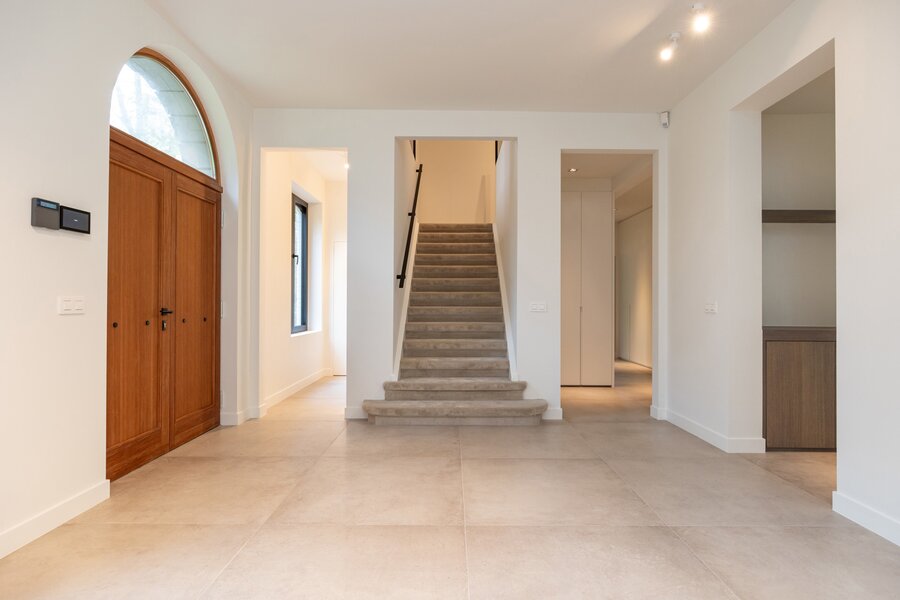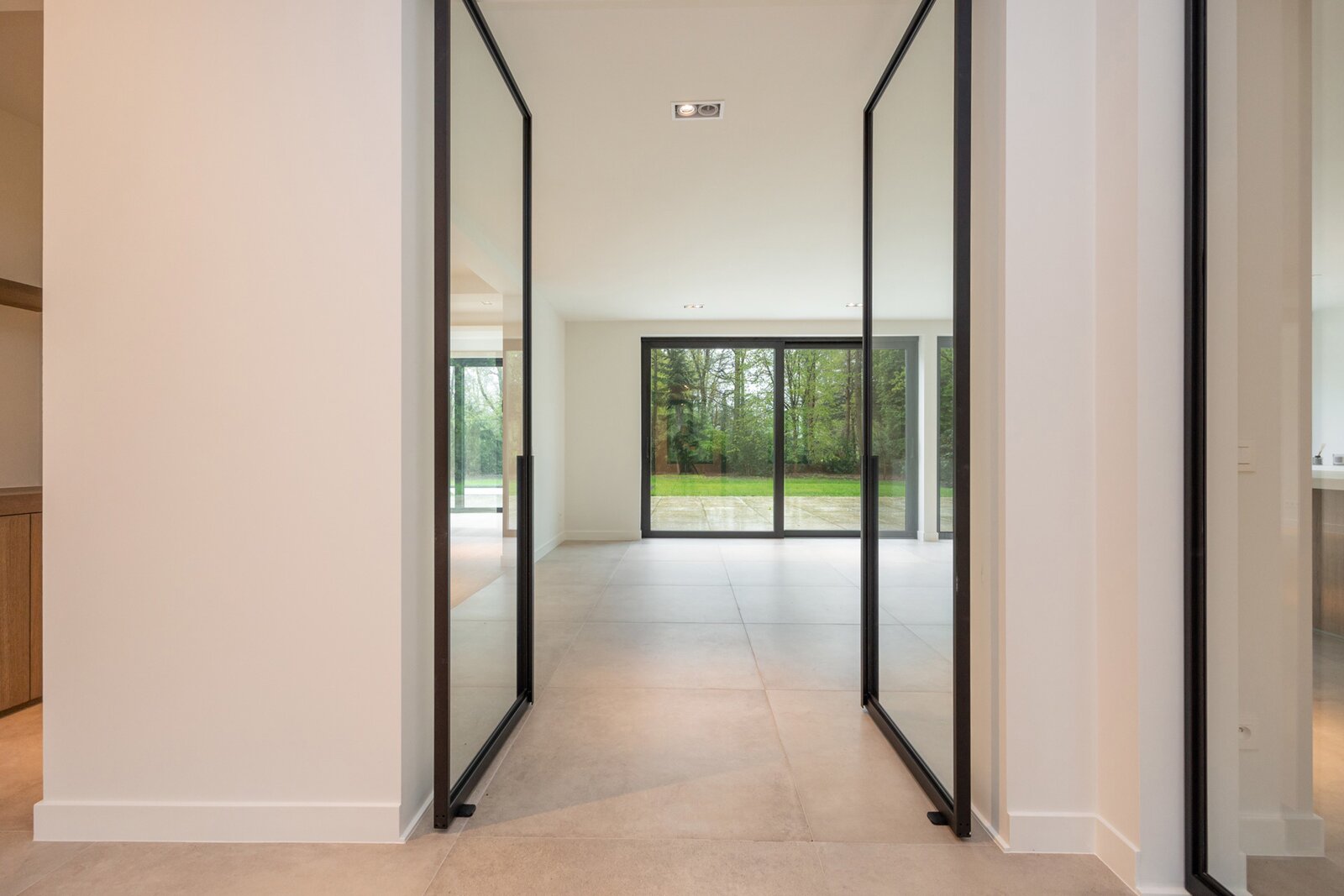 Een riante centrale hal met vestiaire en gastentoilet, met diverse glazen deuren leiden naar de leefruimten.