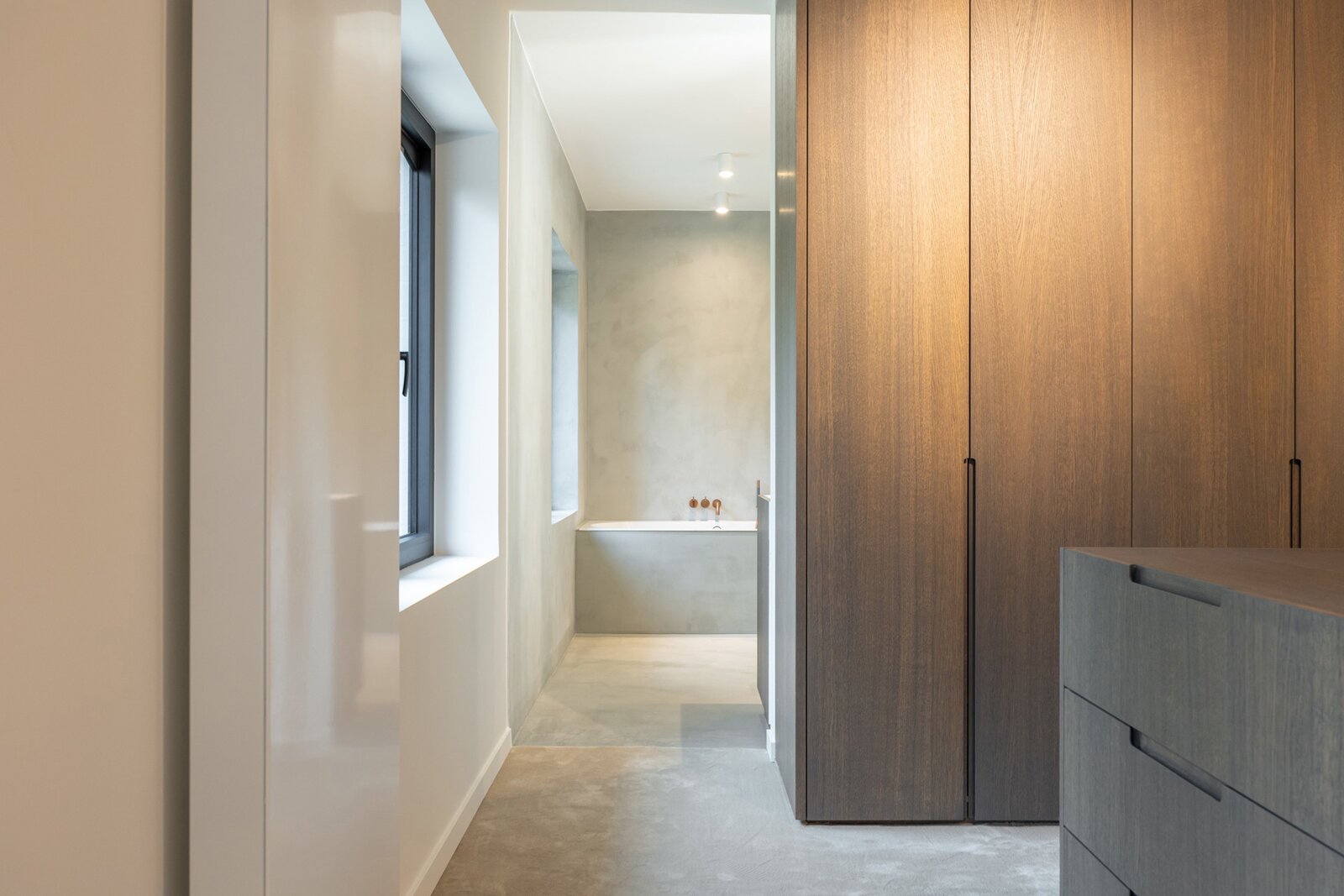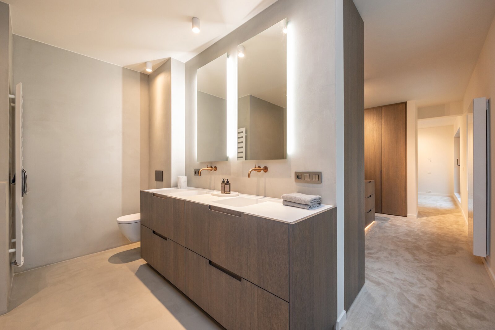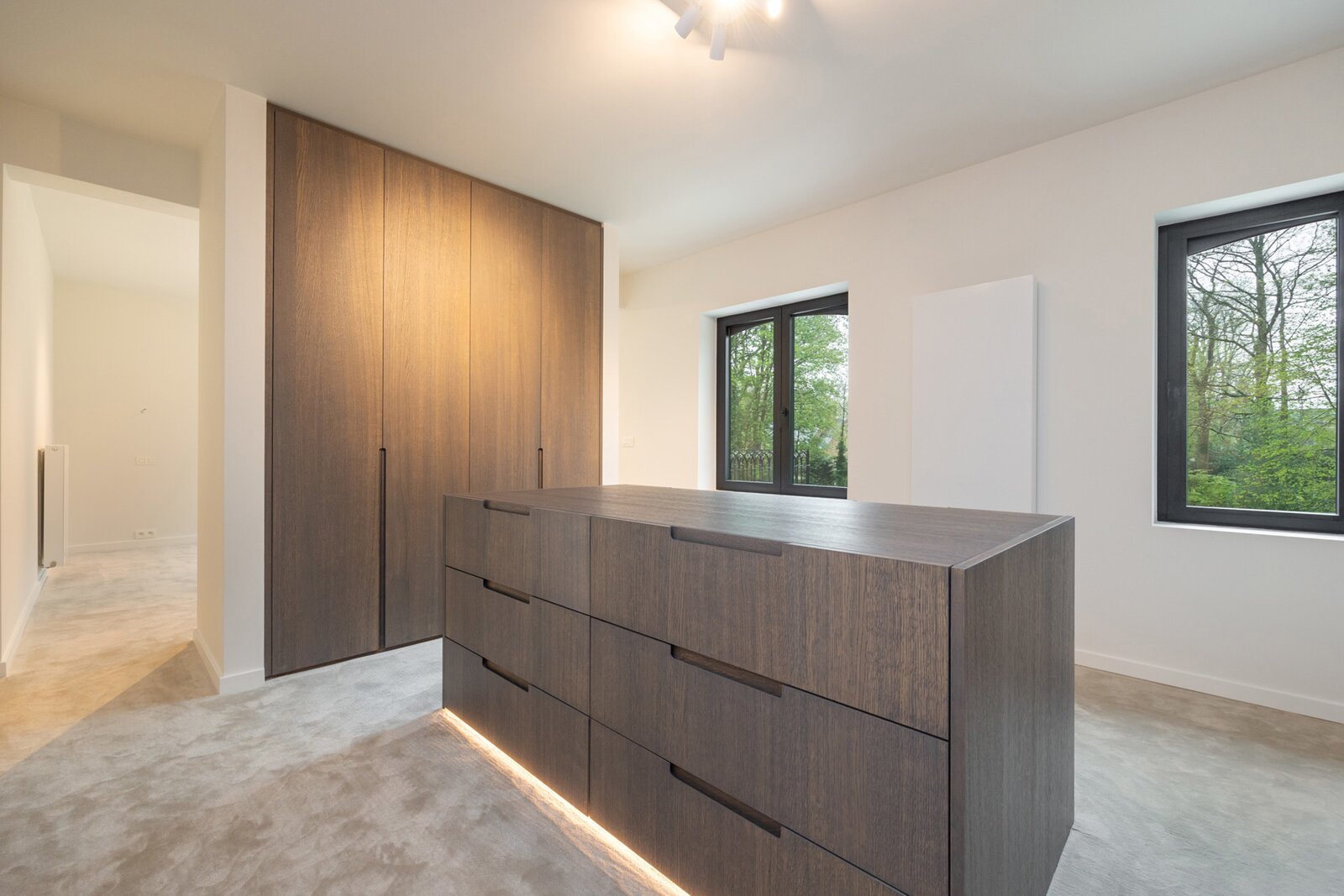 Op de eerste verdieping een ruime overloop met ingebouwde kastenwand en een nachttoilet. Twee slaapkamers met parketvloeren, ingebouwde kasten en ieder een eigen doucheruimte. De grote hoofdslaapkamer heeft een en suite dressing, een schuifpui naar het dakterras en een luxueuze badkamer met ligbad, douche, dubbele wastafel en een toilet. Ook is er een vierde slaapkamer met eigen doucheruimte en een praktische waskamer met wasmachine- en drogemachine aansluitingen en een spoelbak.