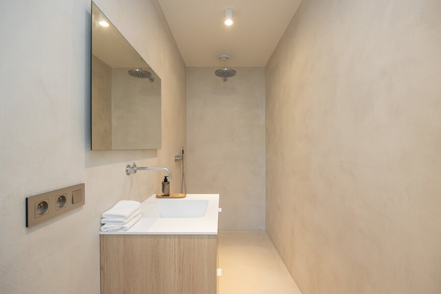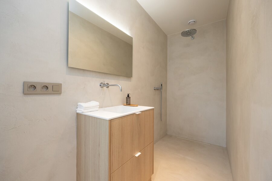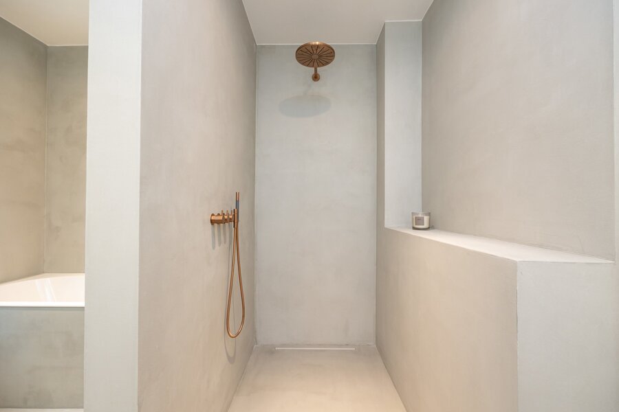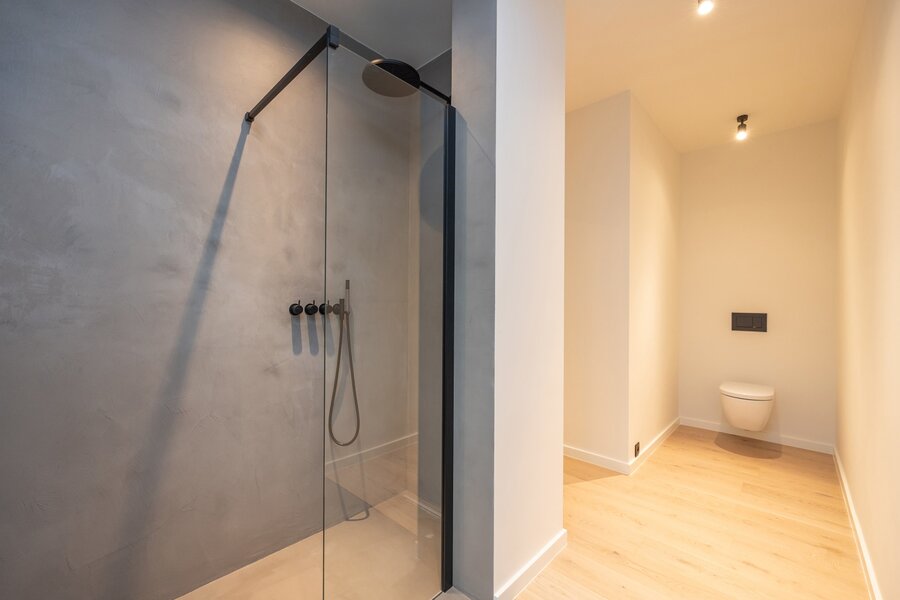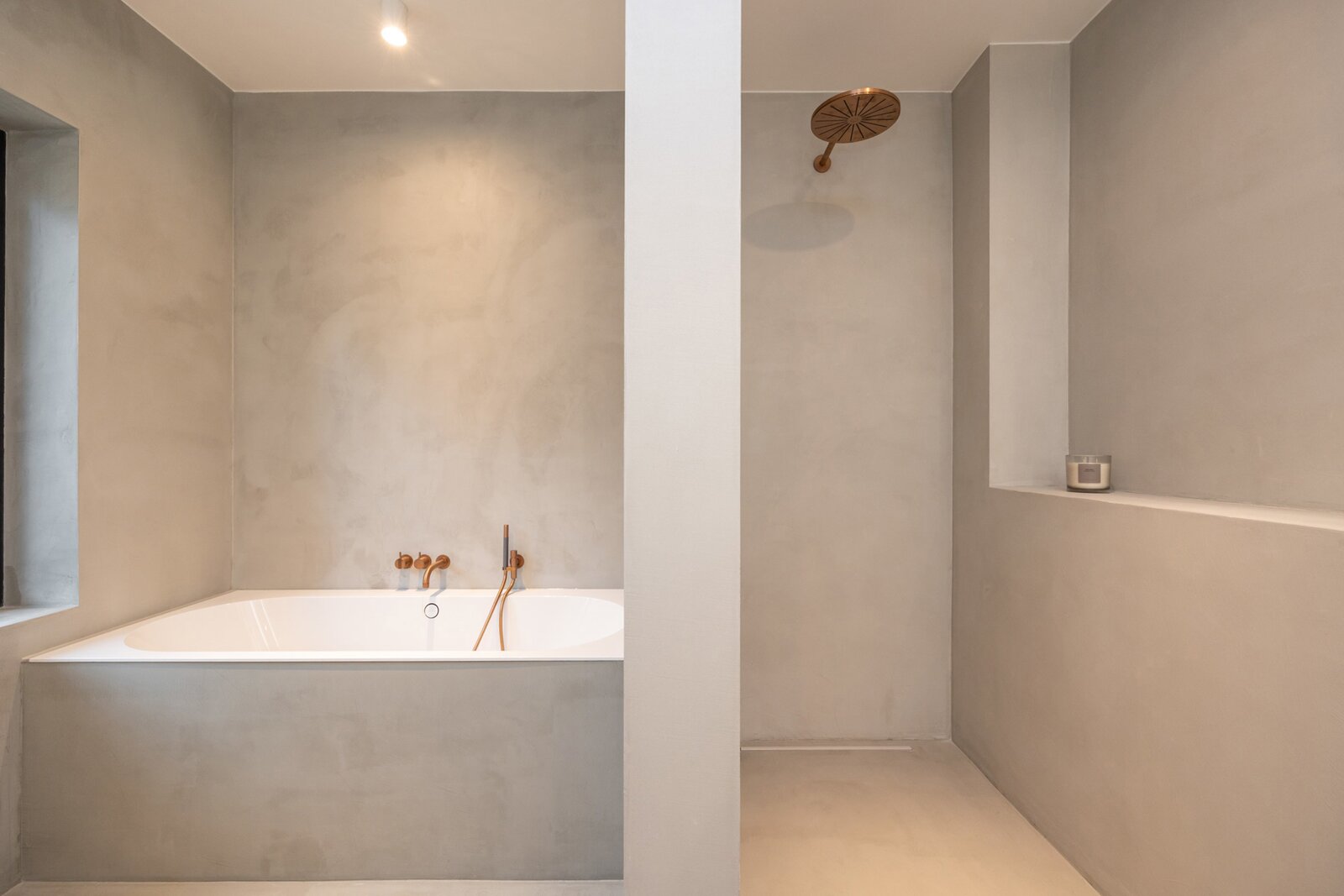 Op de eerste verdieping een ruime overloop met ingebouwde kastenwand en een nachttoilet. Twee slaapkamers met parketvloeren, ingebouwde kasten en ieder een eigen doucheruimte. De grote hoofdslaapkamer heeft een en suite dressing, een schuifpui naar het dakterras en een luxueuze badkamer met ligbad, douche, dubbele wastafel en een toilet. Ook is er een vierde slaapkamer met eigen doucheruimte en een praktische waskamer met wasmachine- en drogemachine aansluitingen en een spoelbak.