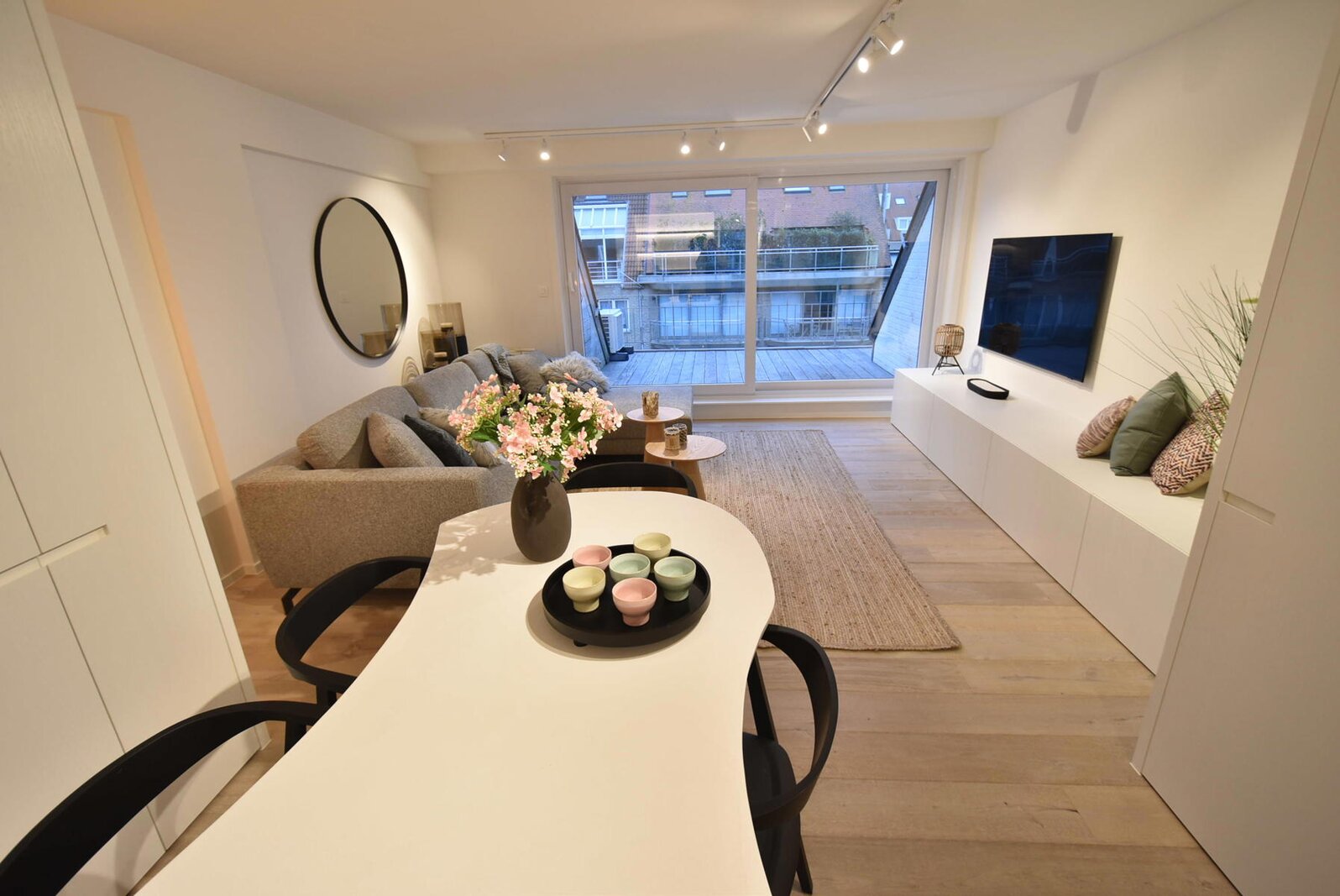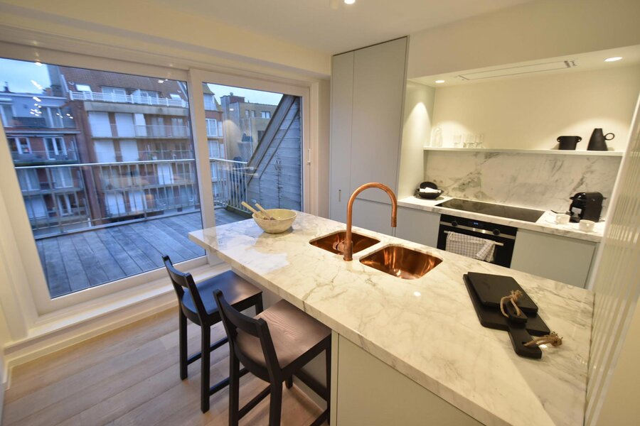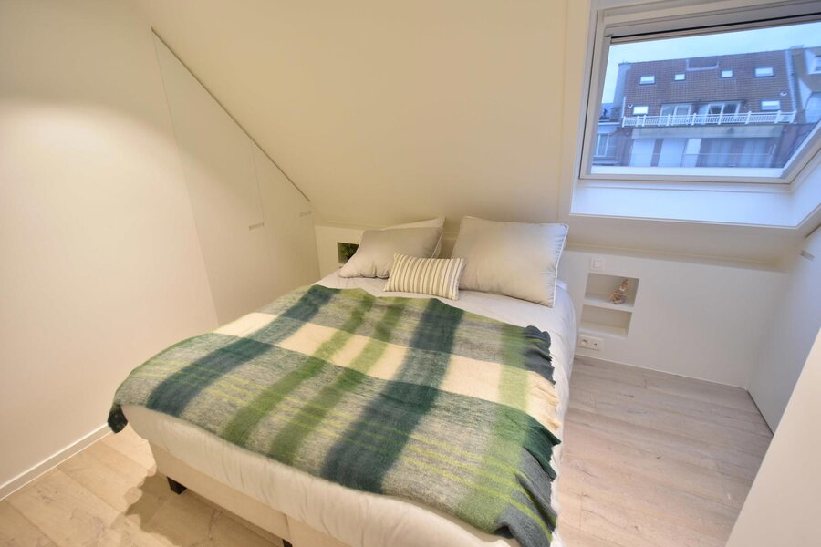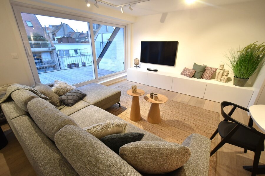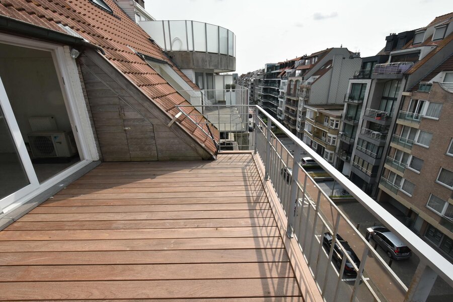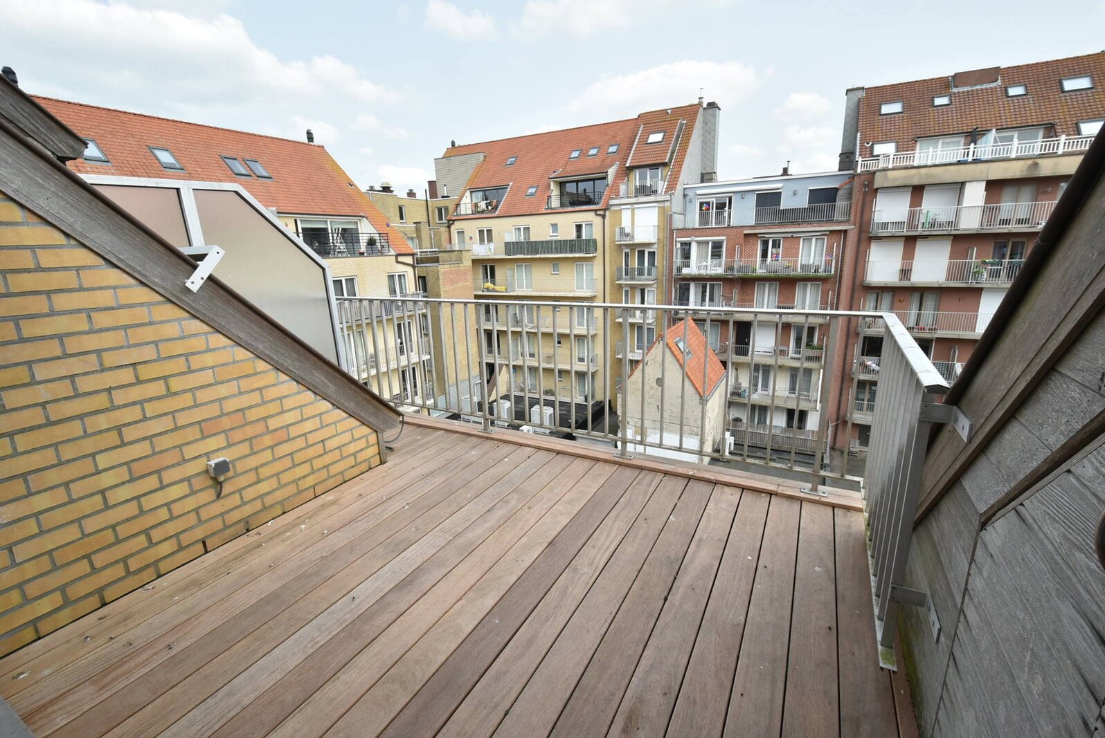 APPARTEMENT DUPLEX ENSOLEILLÉ, LUXUEUSEMENT FINI ET ENTIÈREMENT MEUBLÉ SITUÉ À QUELQUES PAS DE LA MER ET DE L'AVENUE LIPPENS. Composition : hall d'entrée avec vestiaire et toilette, séjour avec bureau donnant sur une belle terrasse ensoleillée, coin petit déjeuner donnant sur la terrasse arrière, cuisine équipée et débarras - à l'étage : toilette, 2 ch à c complètes, 1 ch à c pour un lit superposée et 2 salles de douche. Cave et local à vélos. Possibilité d'acheter un parking dans le bâtiment adjacent.