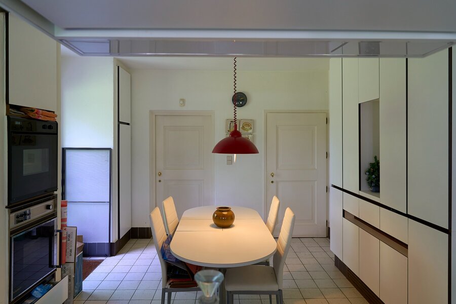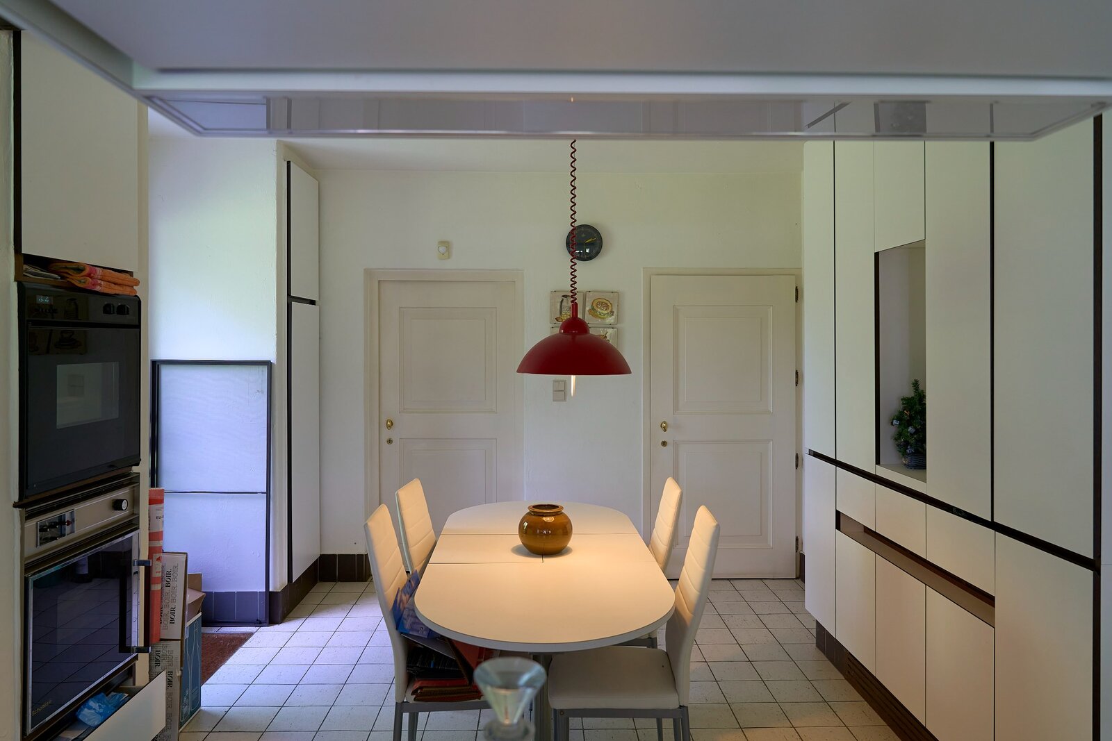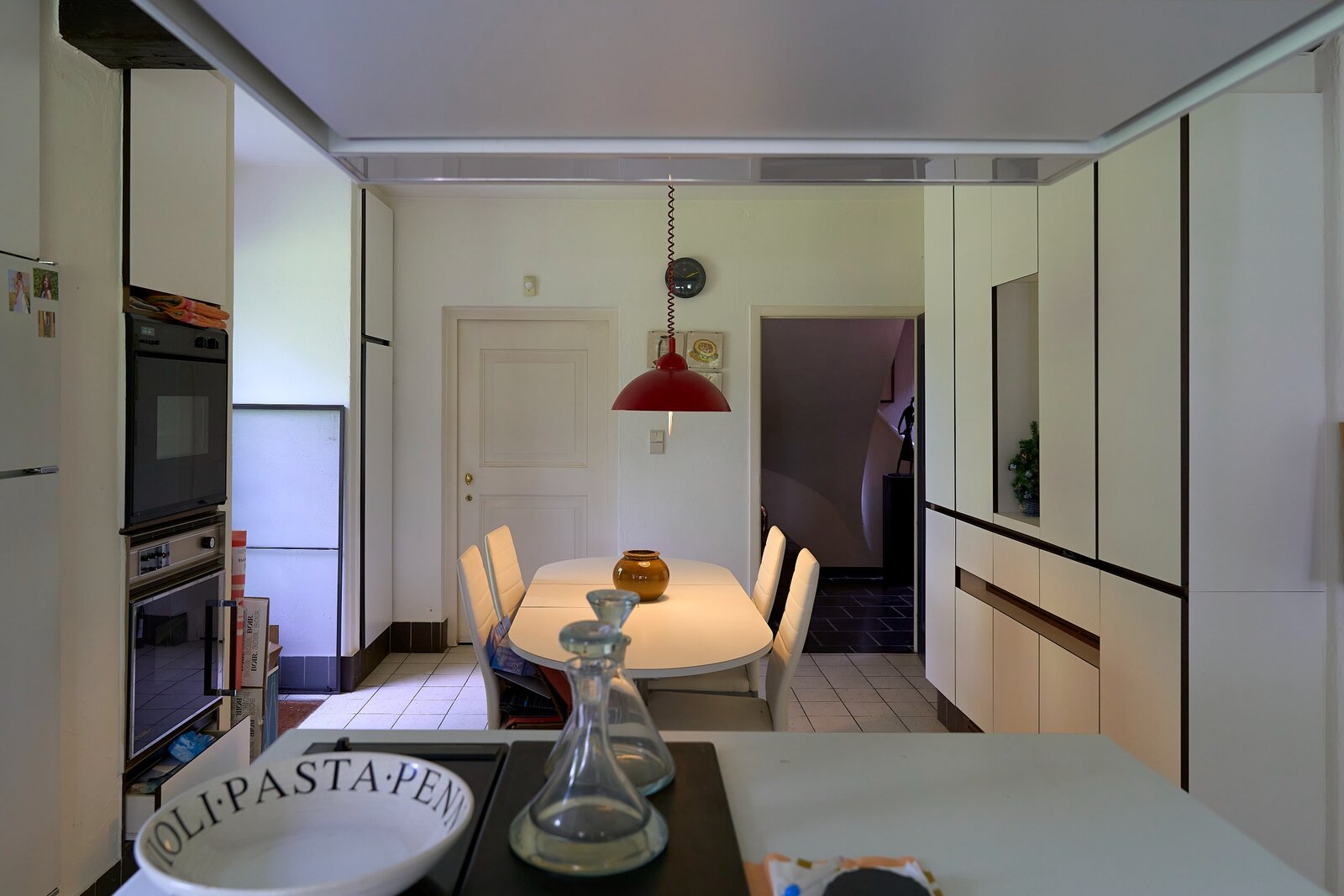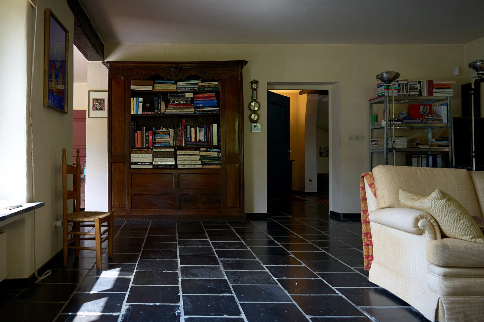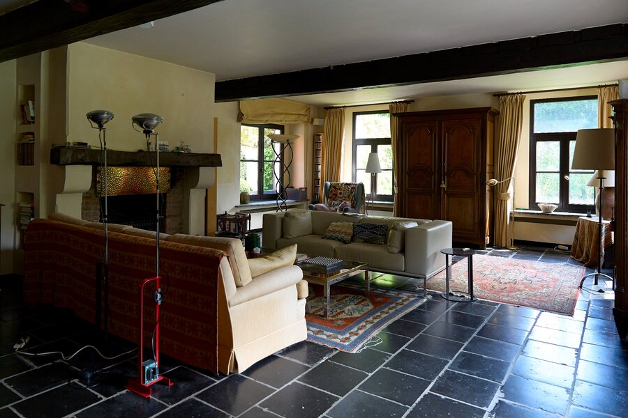 Indeling gelijkvloers: riante hall met vestiaire en gastentoilet, ruime lving met houtgestookte open haard en een prachtige natuurstenen vloer, aparte ruime eetkamer met zicht op de tuin, ruime leefkeuken, berging, apart bureel met douchekamer en technische ruimte (voordien garage), groot overdekt terras met open haard naast de keuken.