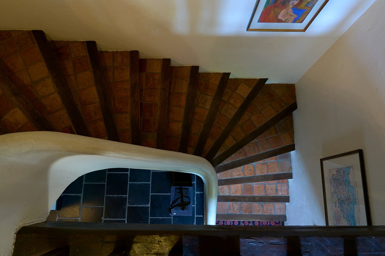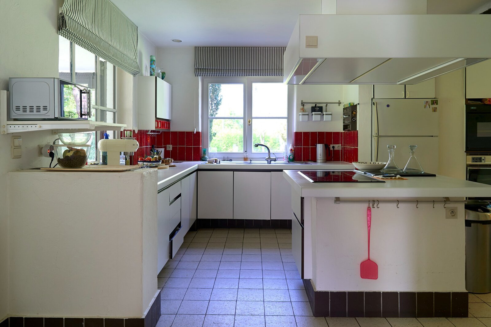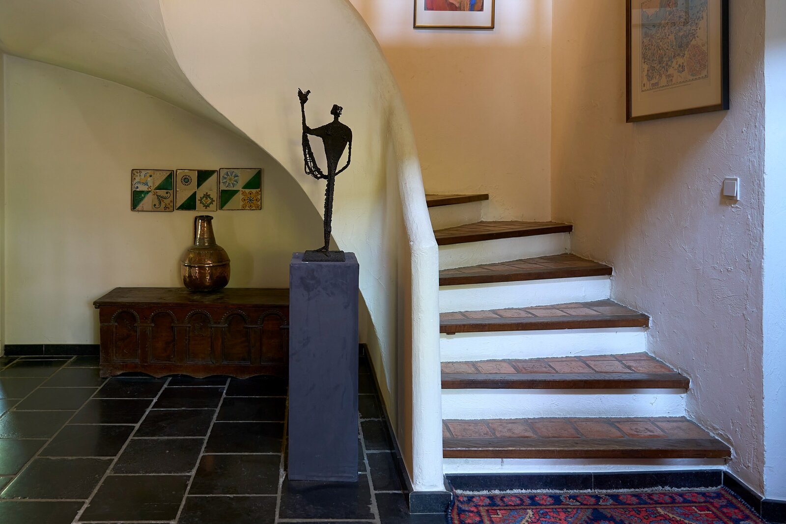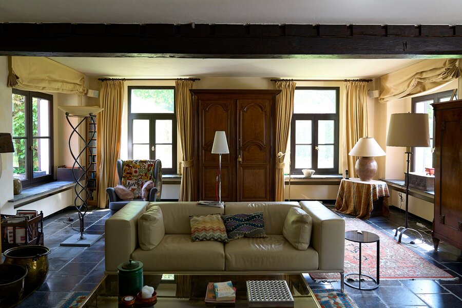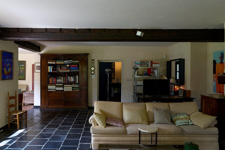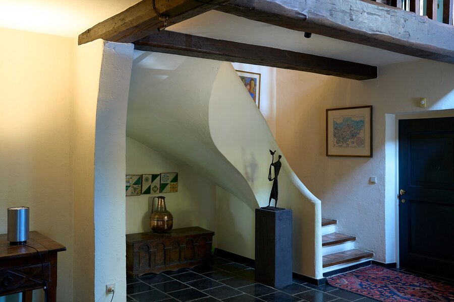 Indeling gelijkvloers: riante hall met vestiaire en gastentoilet, ruime lving met houtgestookte open haard en een prachtige natuurstenen vloer, aparte ruime eetkamer met zicht op de tuin, ruime leefkeuken, berging, apart bureel met douchekamer en technische ruimte (voordien garage), groot overdekt terras met open haard naast de keuken.