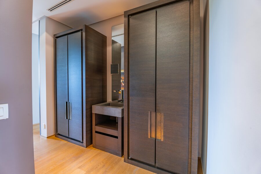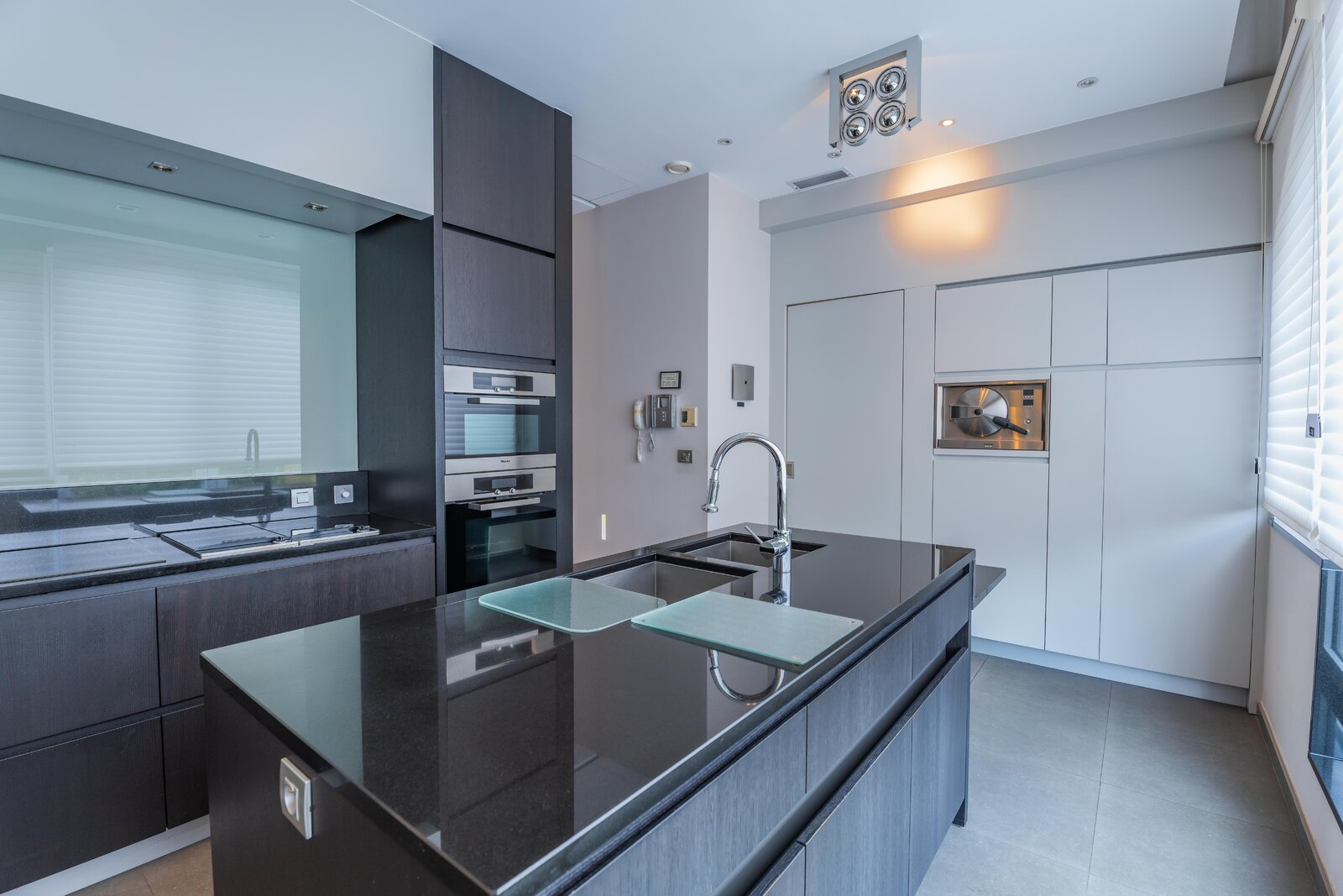 De penthouse is luxueus afgewerkt met maatmeubilair , parket , airco , ingewerkt stofzuigerinstallatie , zonnetenten .