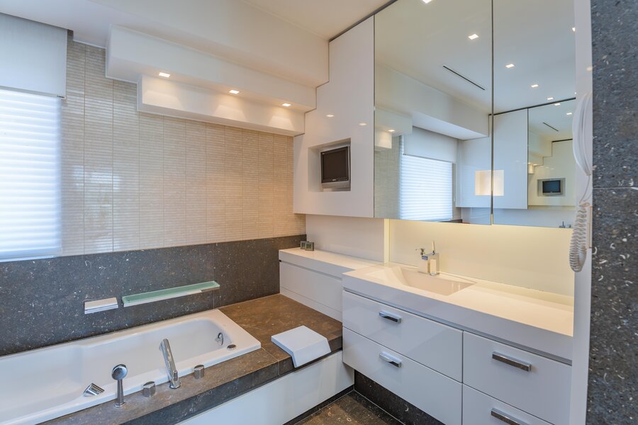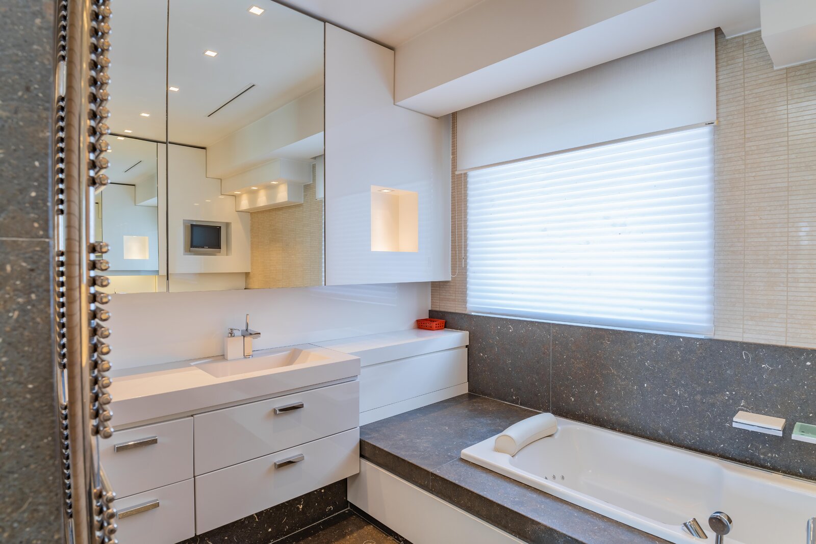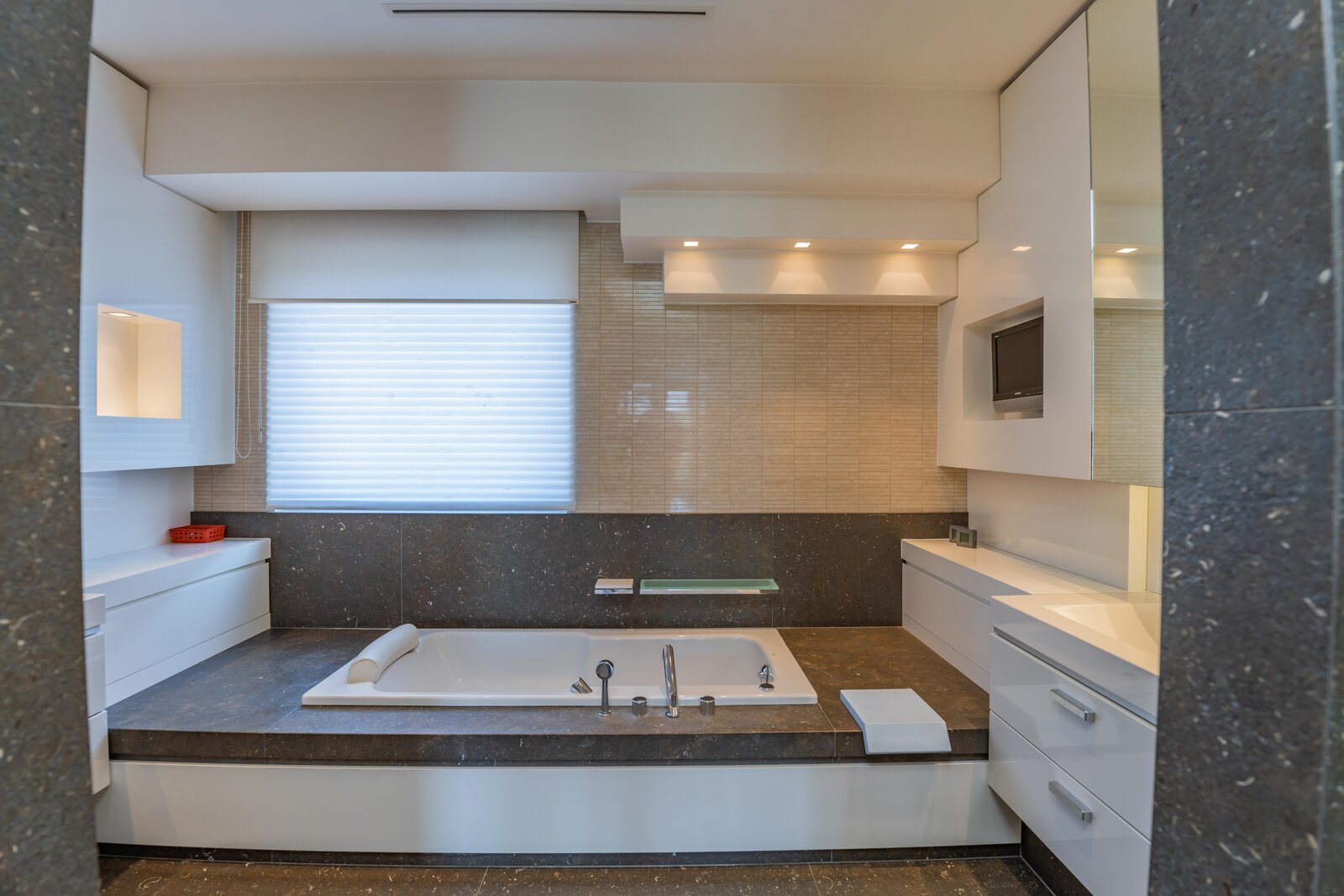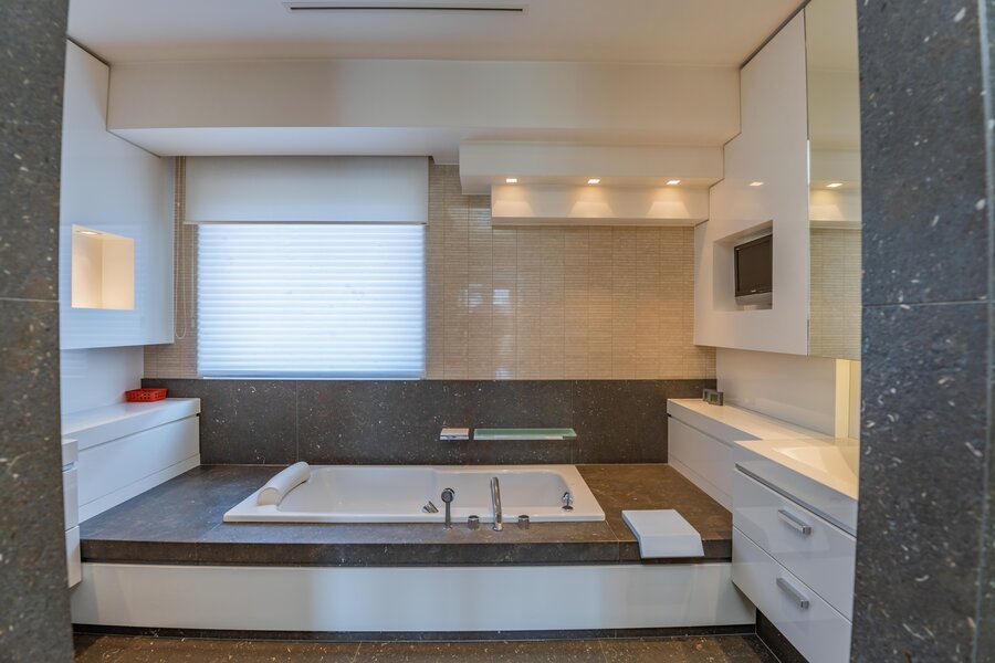 Masterslaapkamer met inloopdressing en aansluitend een grote badkamer .