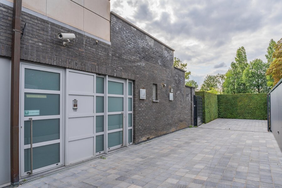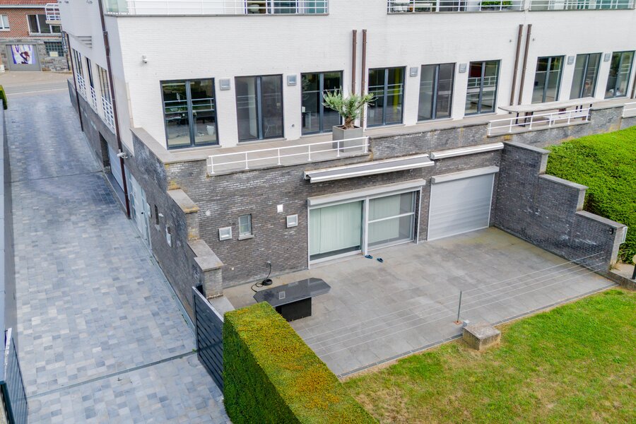 Extra bureauruimte ( 77 m2 ) op het gelijkvloers uitkijkend op de tuin met terras ( 35 m2 ) en buitenparking achter gesloten poort .