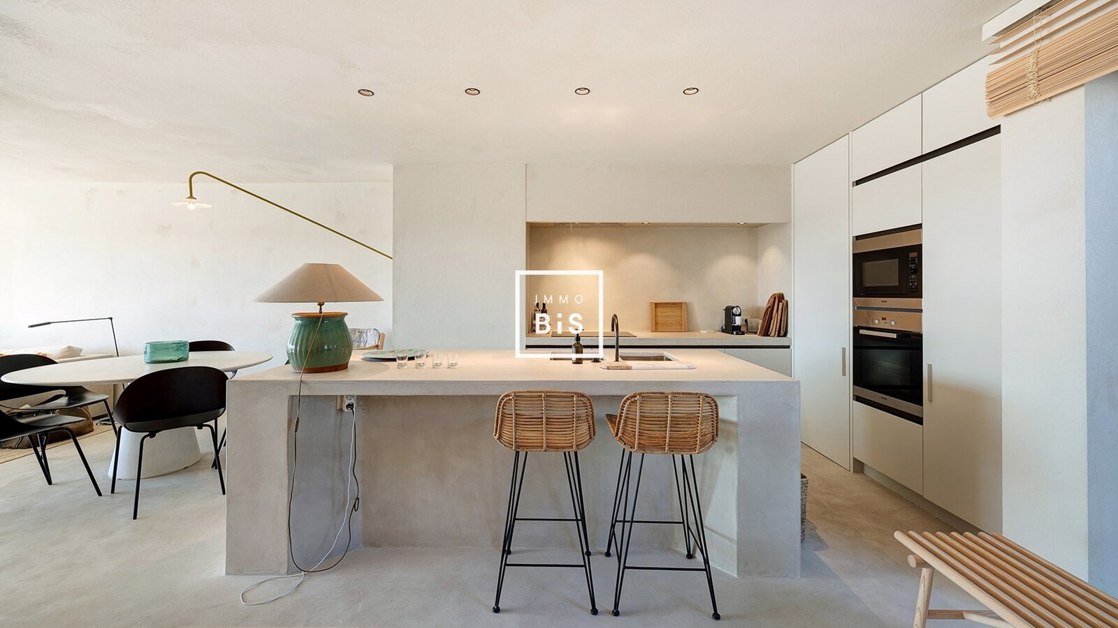 Un salon lumineux donnant sur la spacieuse terrasse, vous permettant de profiter du soleil et de la magnifique vue sur les environs. Que vous souhaitiez vous détendre au soleil ou dîner sous les étoiles, cette terrasse offre le cadre parfait pour chaque occasion.