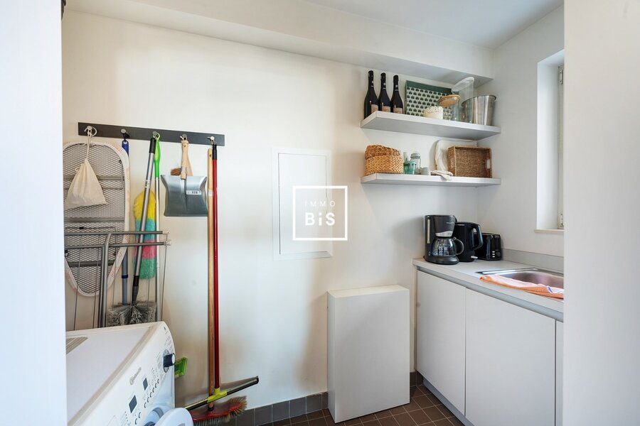Une cuisine ouverte entièrement équipée avec coin petit-déjeuner et une salle à manger attenante. Une buanderie pratique.