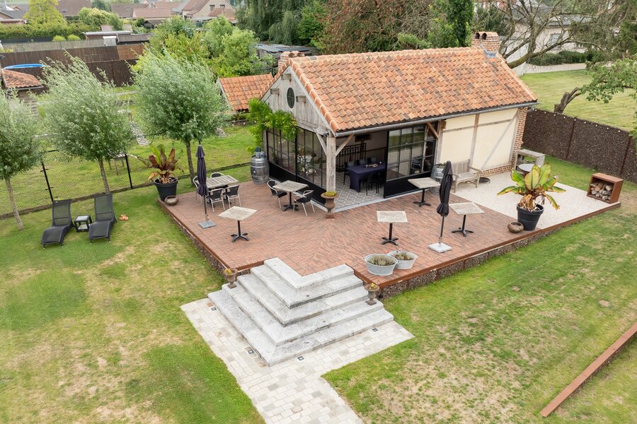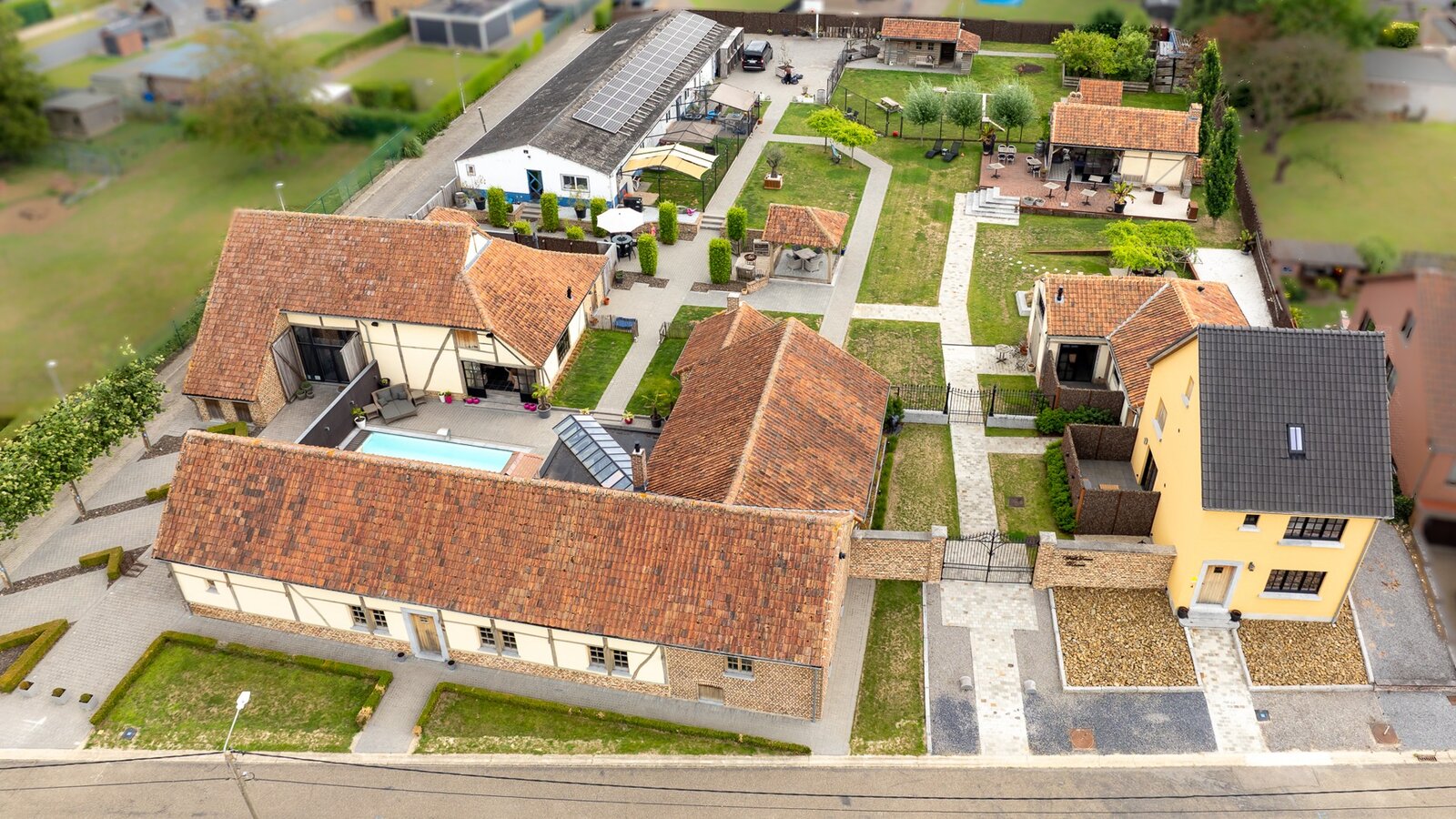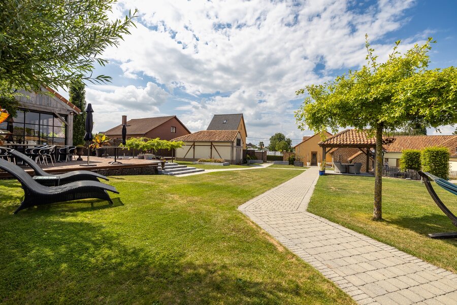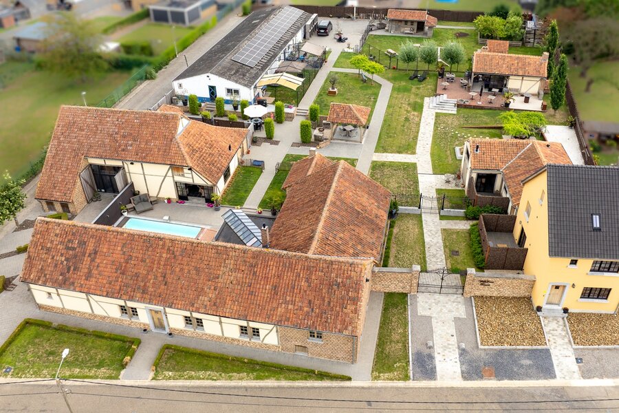 Via de centrale Poort aan de voorzijde betreden we het domein met een oppervlakte van maar liefst 41 are. Aan de linkerzijde van het perceel vinden we een ruime hoevewoning met achterliggend een wellnessgedeelte met ruime buitenkeuken terug.