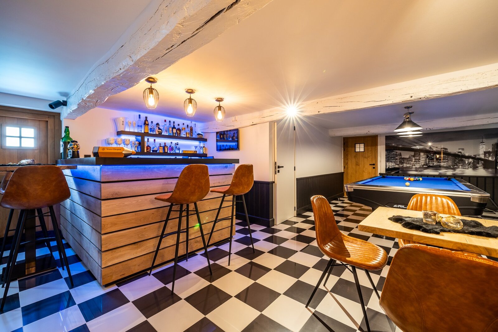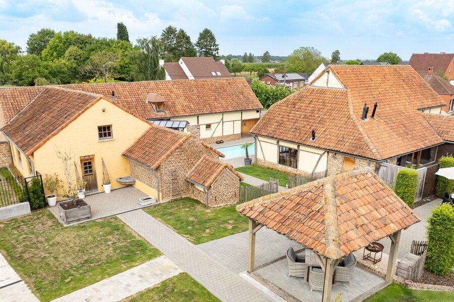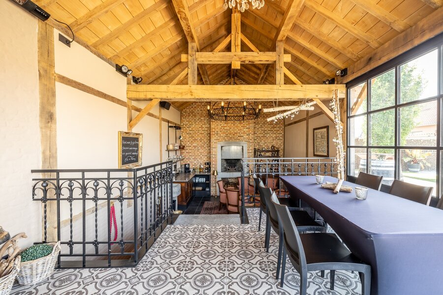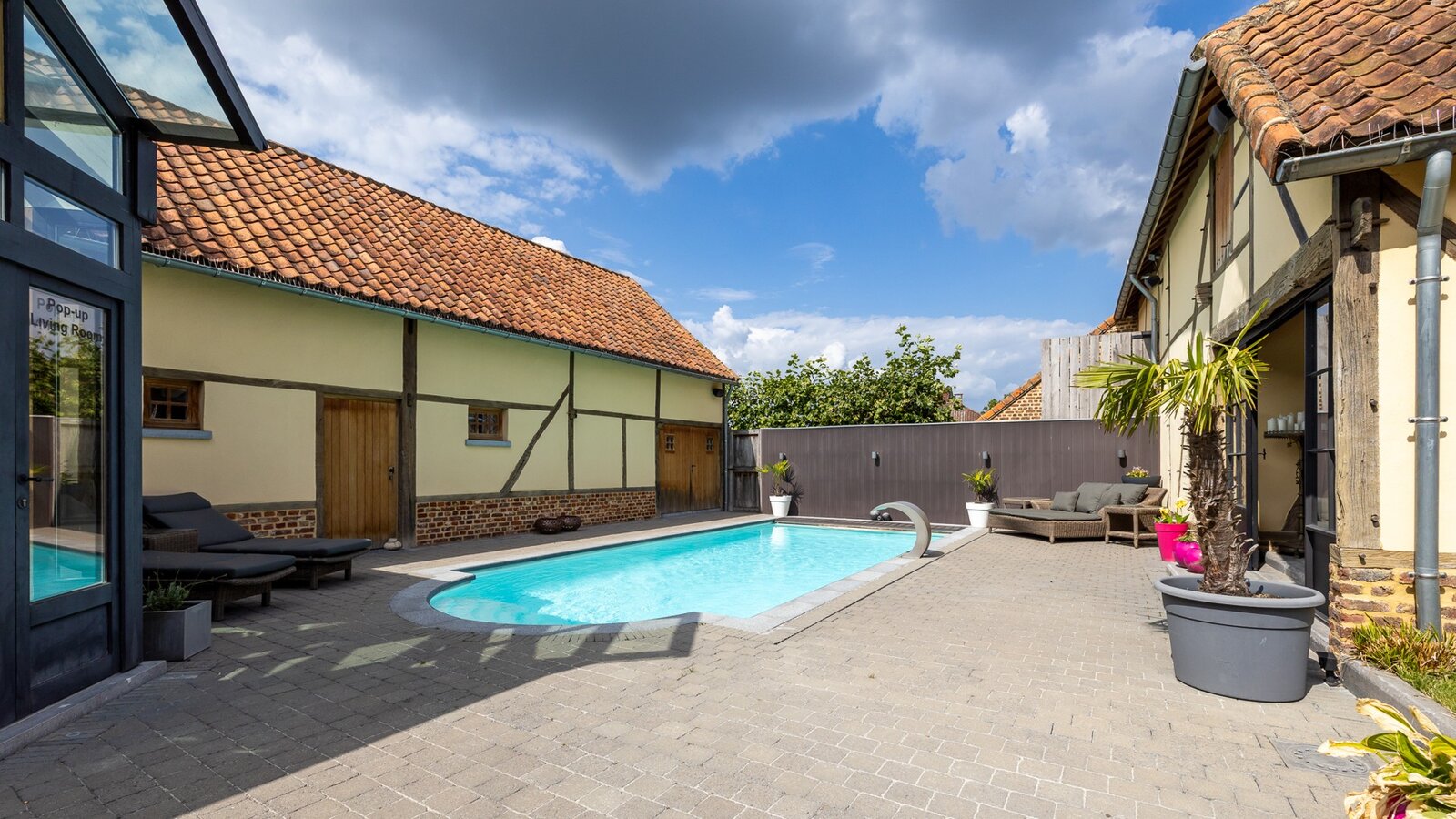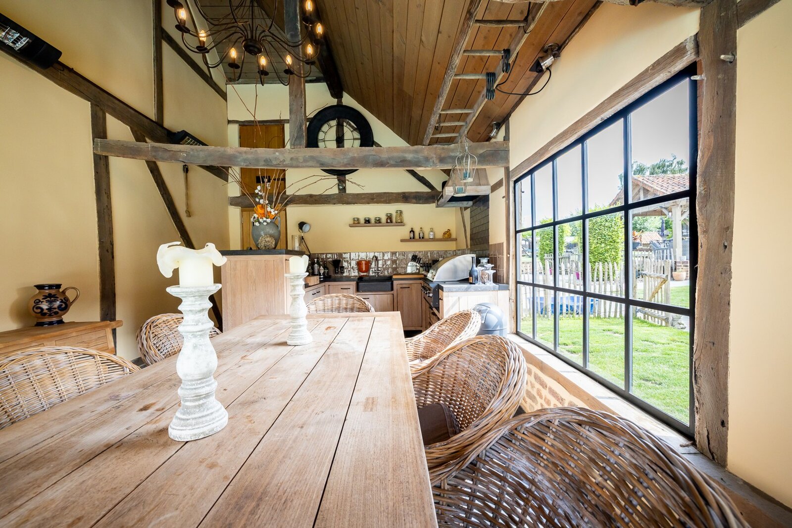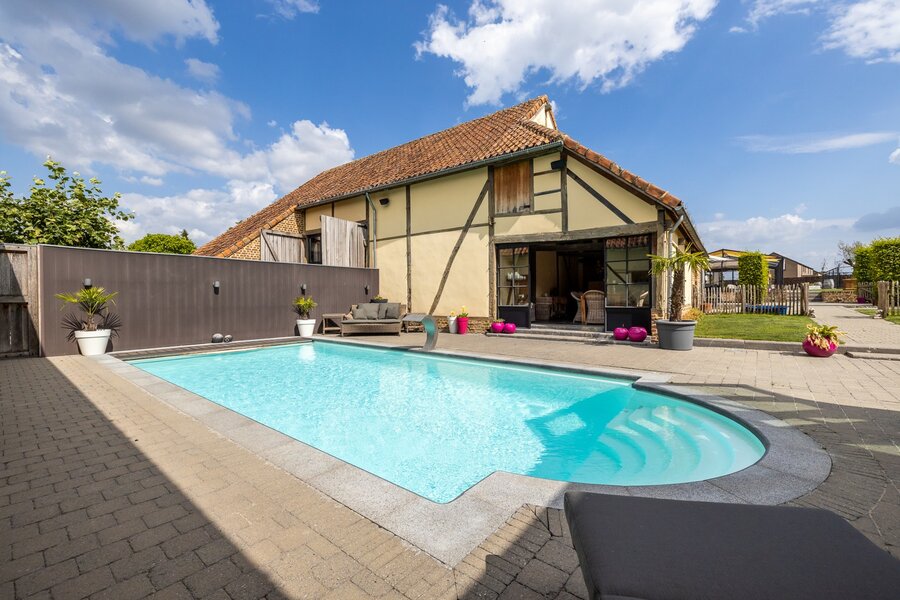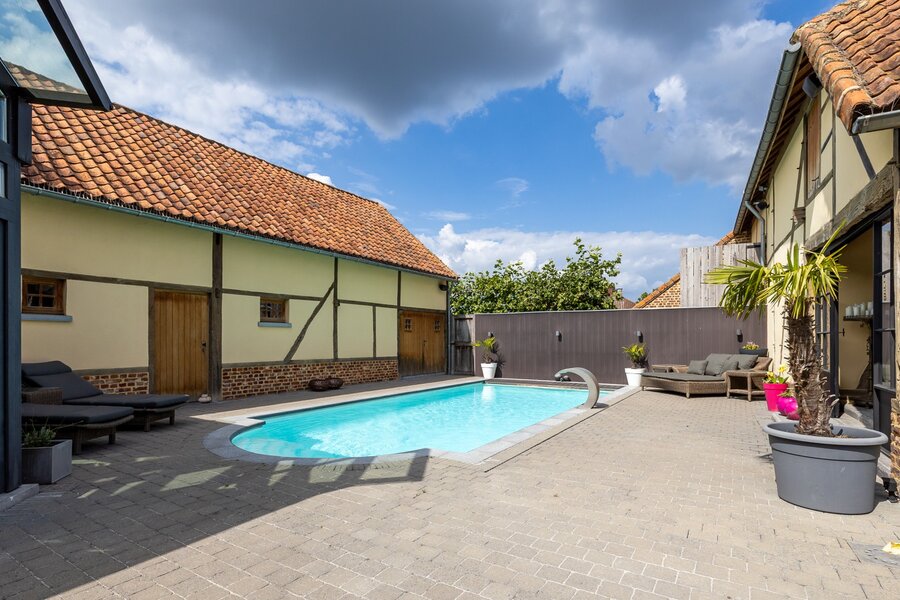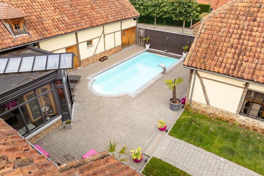 De hoevewoning is afgewerkt met hoogwaardige natuurlijke materialen, met op de binnenkoer een verwarmd zwembad met toegang tot het poolhouse met ingerichte bar en douchemogelijkheden.