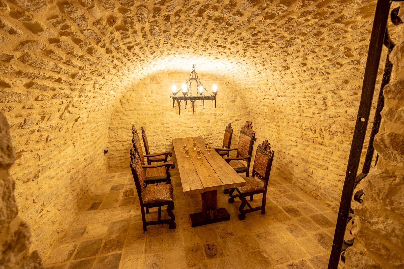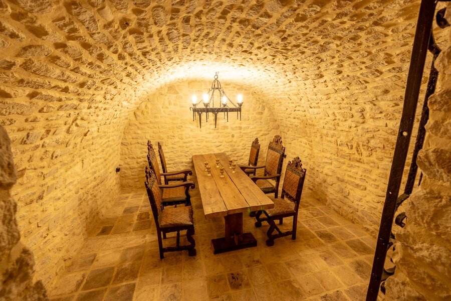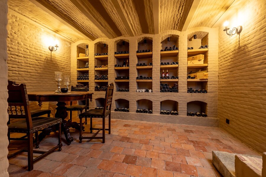 In de ruime tuin vinden we een zeer mooie unieke wijnkelder terug met op het gelijkvloers een mooie degustatieruimte, op -1 de wijnkelder zelf en op -2 een prachtige ridderzaal die tot ieders verbeelding spreekt