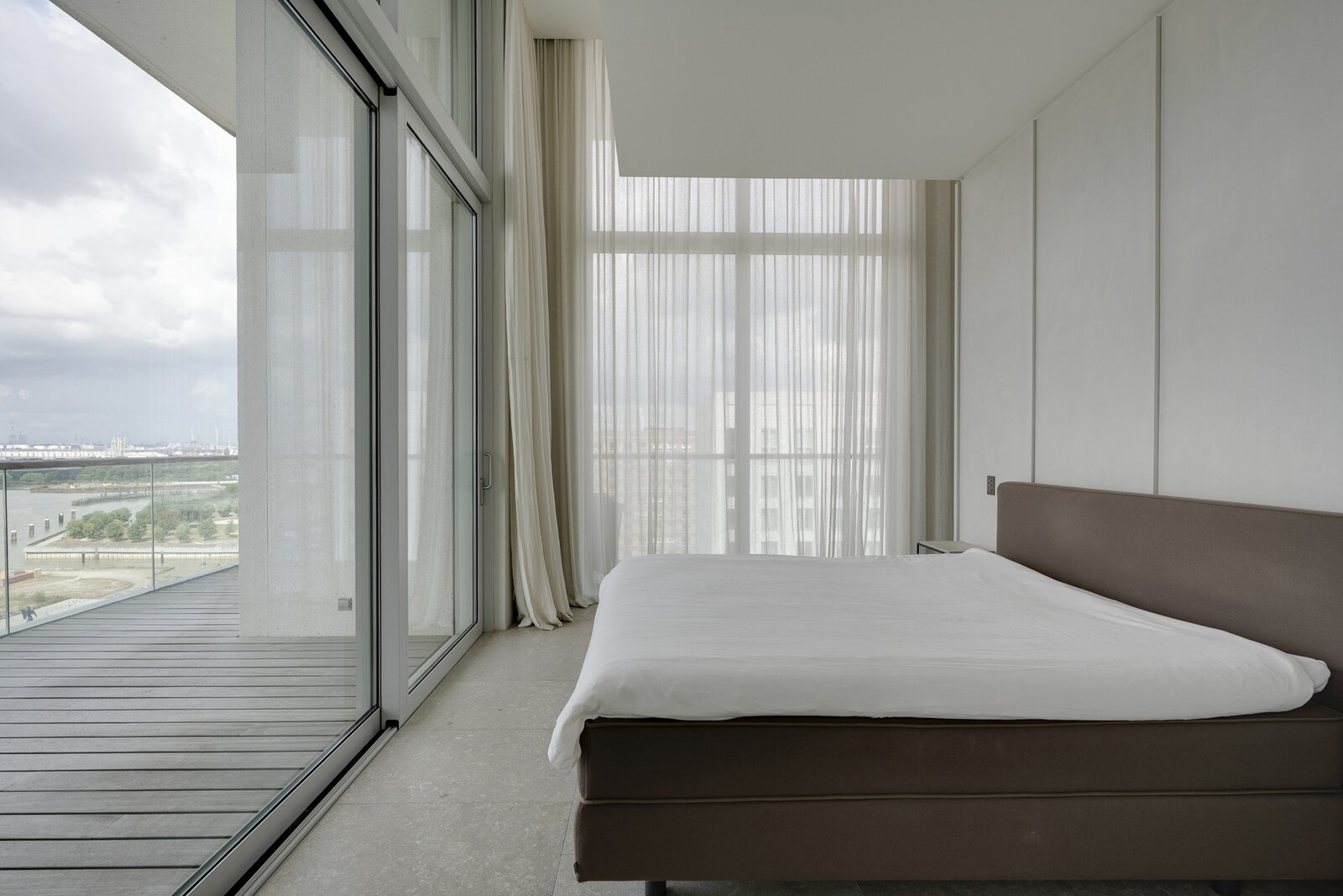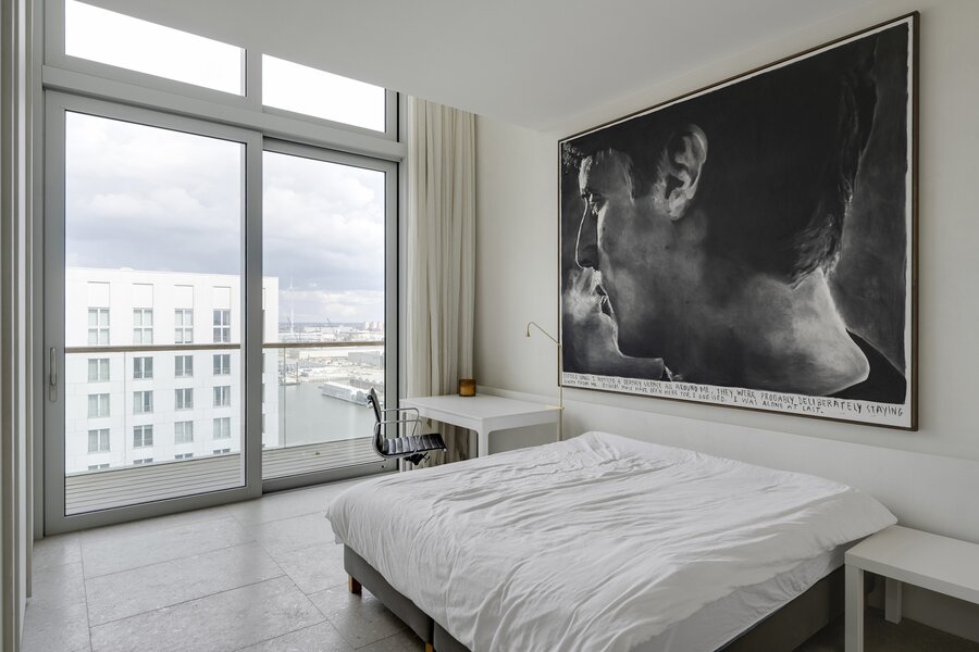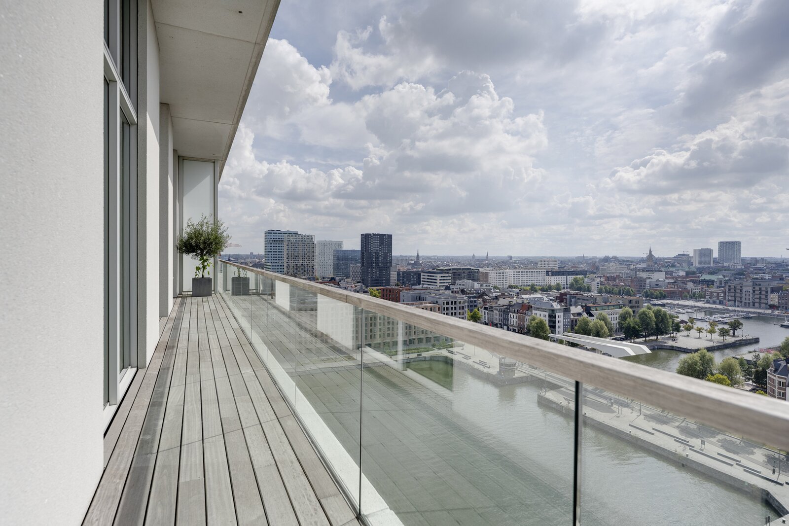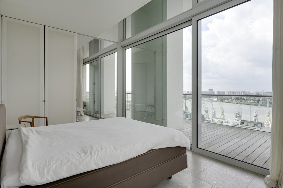 Op de vijftiende verdieping van een door David Chipperfield ontworpen gebouw bevindt zich dit exclusieve penthouse van ca. 240 m², ontworpen door Hans Verstuyft. Met plafonds tot 4,8 meter hoog, panoramische ramen en terrassen langs drie zijden (ca. 100 m²) geniet je hier van een adembenemend uitzicht over de Schelde, de haven en de skyline van Antwerpen. Het zuidwest georiënteerde leefgedeelte baadt in het licht en straalt rust en tijdloze elegantie uit dankzij de keuze voor natuursteen, Amerikaans notenhout en krijtkleurige muren.