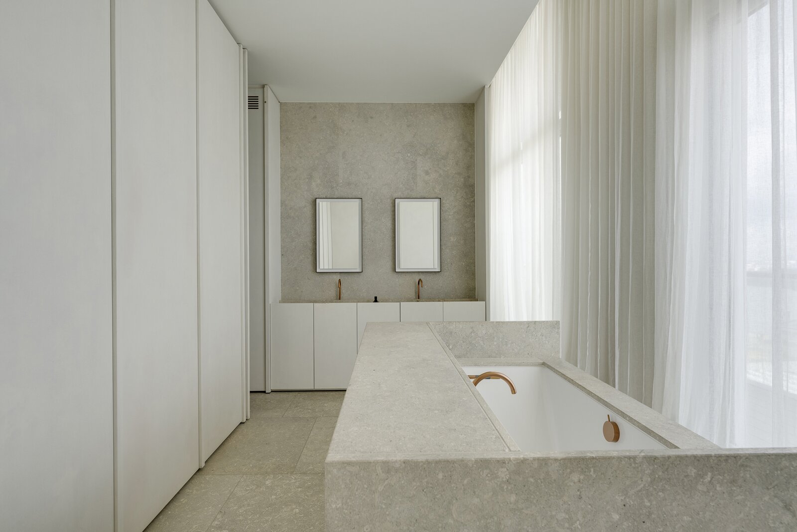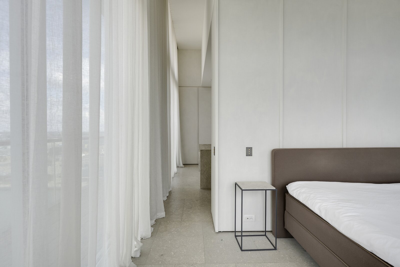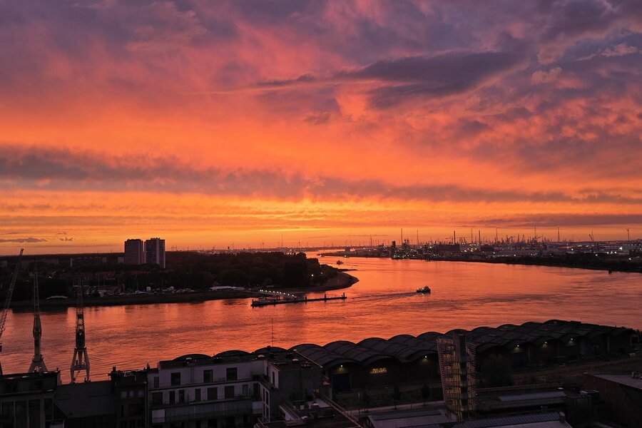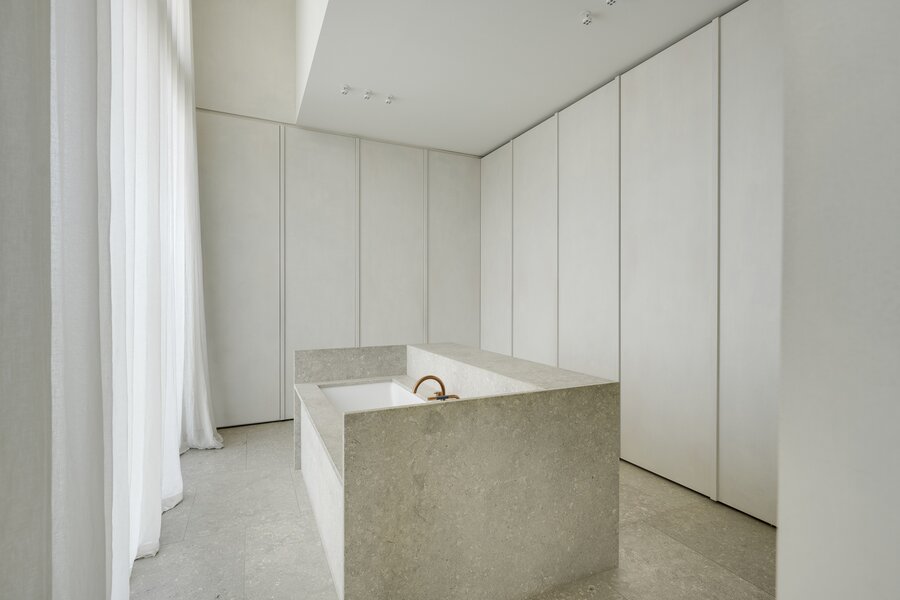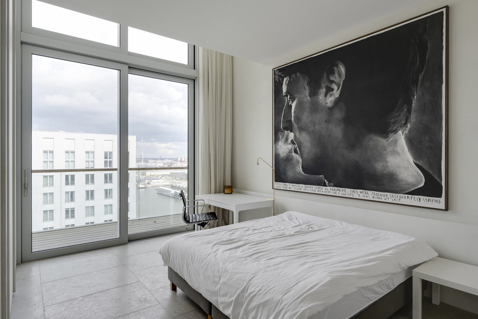 Op de vijftiende verdieping van een door David Chipperfield ontworpen gebouw bevindt zich dit exclusieve penthouse van ca. 240 m², ontworpen door Hans Verstuyft. Met plafonds tot 4,8 meter hoog, panoramische ramen en terrassen langs drie zijden (ca. 100 m²) geniet je hier van een adembenemend uitzicht over de Schelde, de haven en de skyline van Antwerpen. Het zuidwest georiënteerde leefgedeelte baadt in het licht en straalt rust en tijdloze elegantie uit dankzij de keuze voor natuursteen, Amerikaans notenhout en krijtkleurige muren.