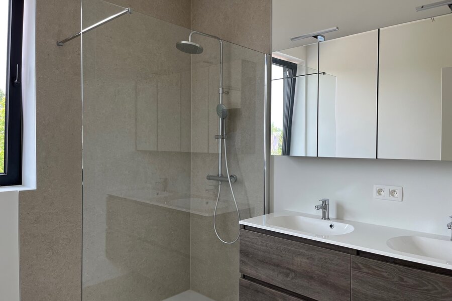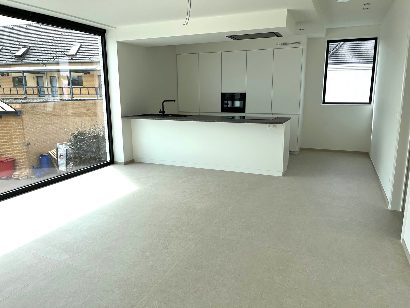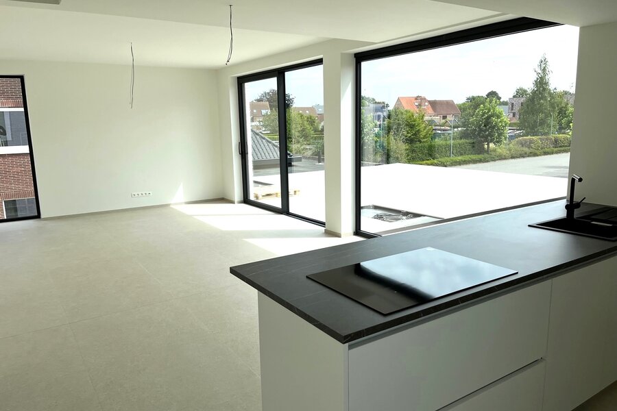 1e verdieping (lift): inkomhal met toegang tot de lichtrijke woon-en eetkamer met open keuken en berging, nachthal, 2 slaapkamers, aparte badkamer, apart toilet.