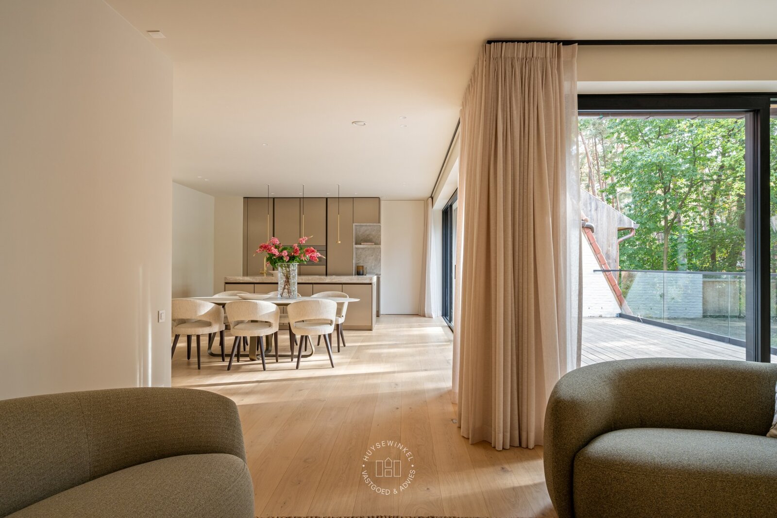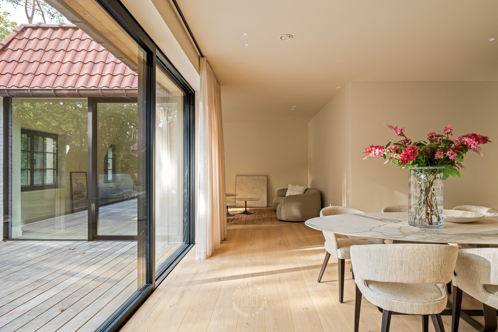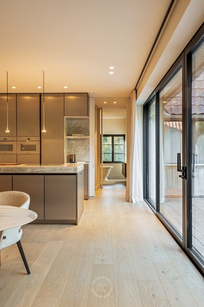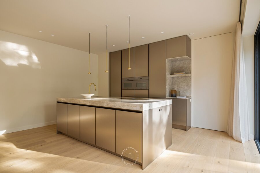 Dit specifieke villa-appartement bevindt zich op de eerste verdieping en beschikt over een bewoonbare oppervlakte van maar liefst 182m². Bij het betreden van het appartement komen we in de open woon- en leefruimte. Door de grote raampartijen zal u meteen kunnen genieten van een prachtig zicht alsook van een aangename lichtinval. De open keuken werd zeer high-end afgewerkt in samenwerking met Siematic. Aansluitend op de keuken vindt u nog een praktische bijkeuken.