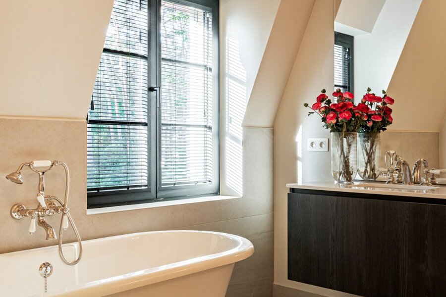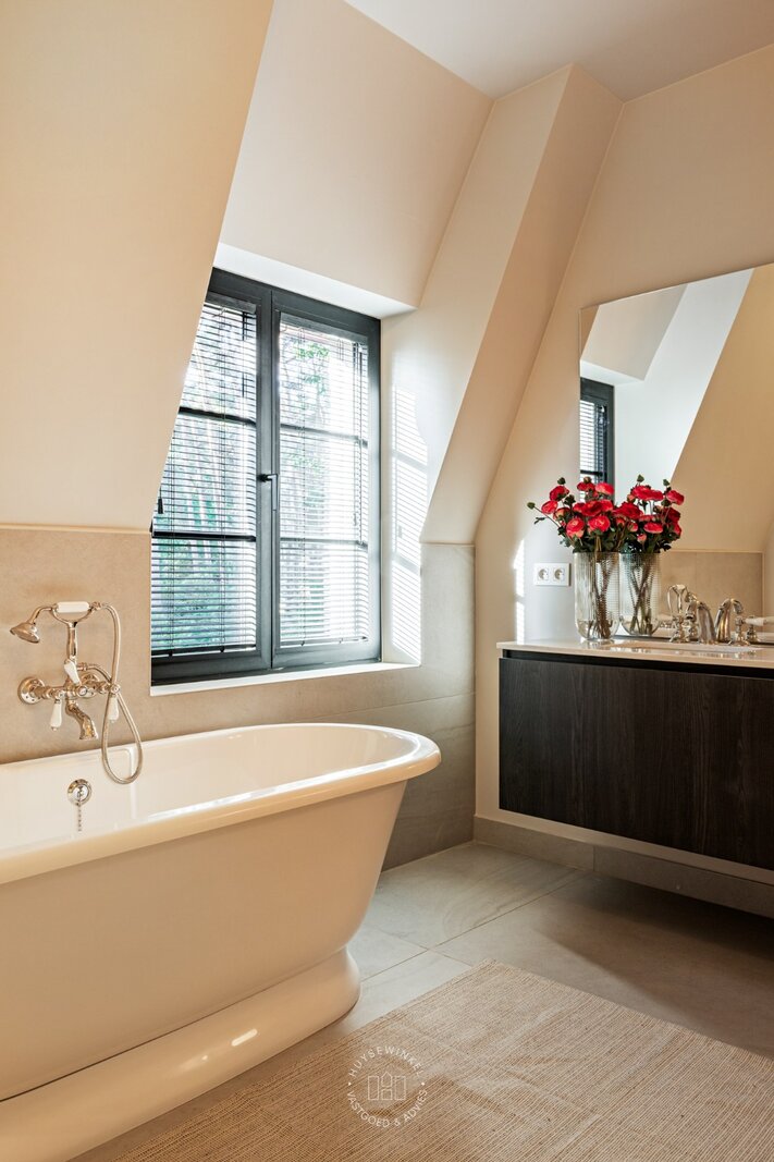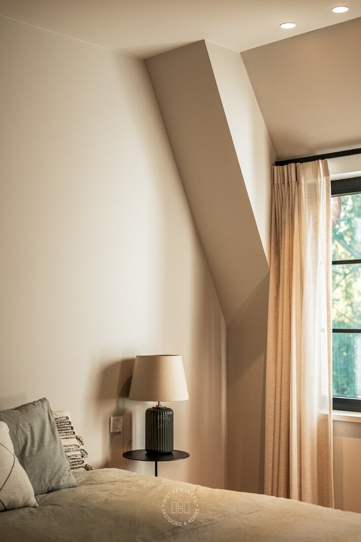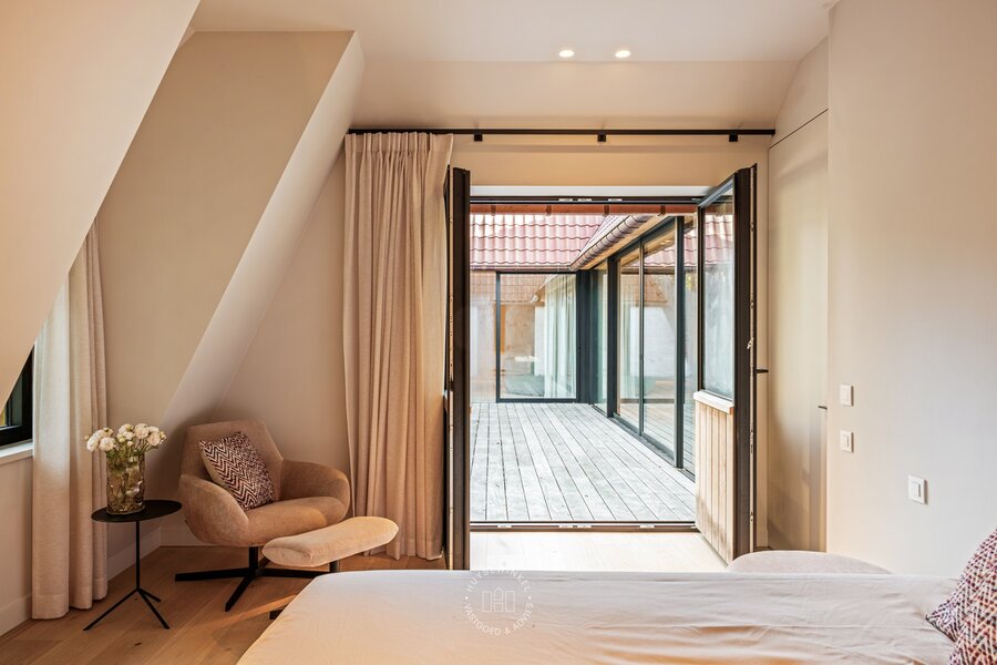 Een centrale sas verbindt de twee ruime slaapkamers en de badkamer met elkaar. De badkamer werd uitgerust met inloopdouche, toilet, ligbad en dubbel lavabomeubel. Het appartement is compleet afgewerkt inclusief schilderwerken, gordijnen en verlichting.
