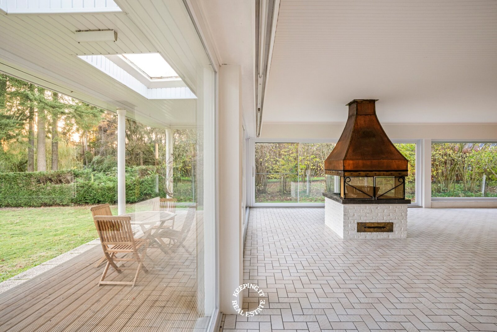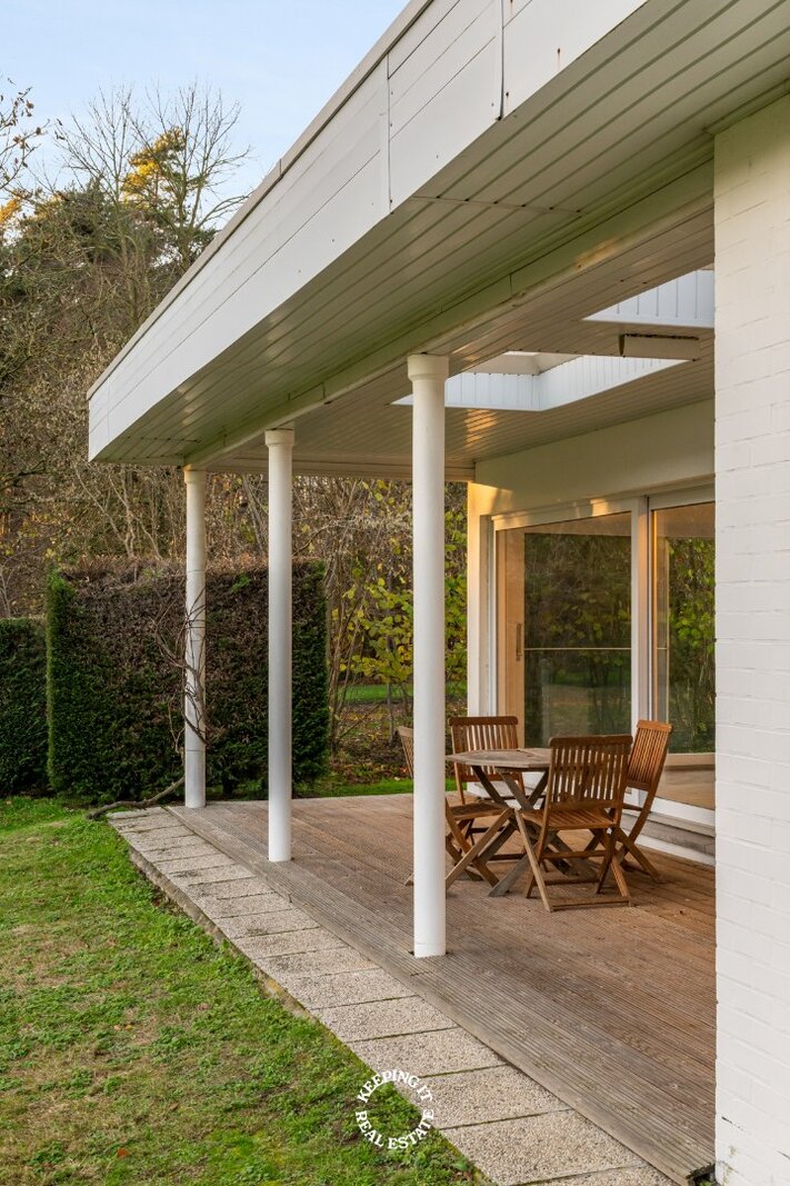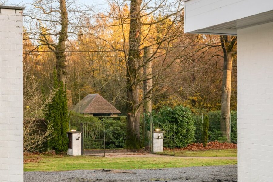In de idyllische luwte van het bos van Hertsberge, op het perfect georiënteerde hoekperceel van de Kasteeldreef en de Sparrendreef, treffen we deze karaktervolle architectenwoning aan. Het betreft een ontwerp van architect A. Degeyter, gebouwd in 1976 en in 1989 met respect voor de originele filosofie verder uitgebreid. Degeyter stond bekend om zijn sobere, tijdloze vormtaal, waarbij licht, ruimtebeleving en harmonie met de omgeving centraal staan, en precies dat voel je in elke lijn van deze woning. De woning werd gebouwd op een prachtig lichtrijk perceel van 4780 m² en werd schitterend geïntegreerd in zijn bosrijke context. Dankzij de optimale oriëntatie baadt de tuin de hele dag in het licht, terwijl de mature groenaanplanting rust en privacy garandeert. Het hoekperceel vormt een van de meest gegeerde locaties in het bos.