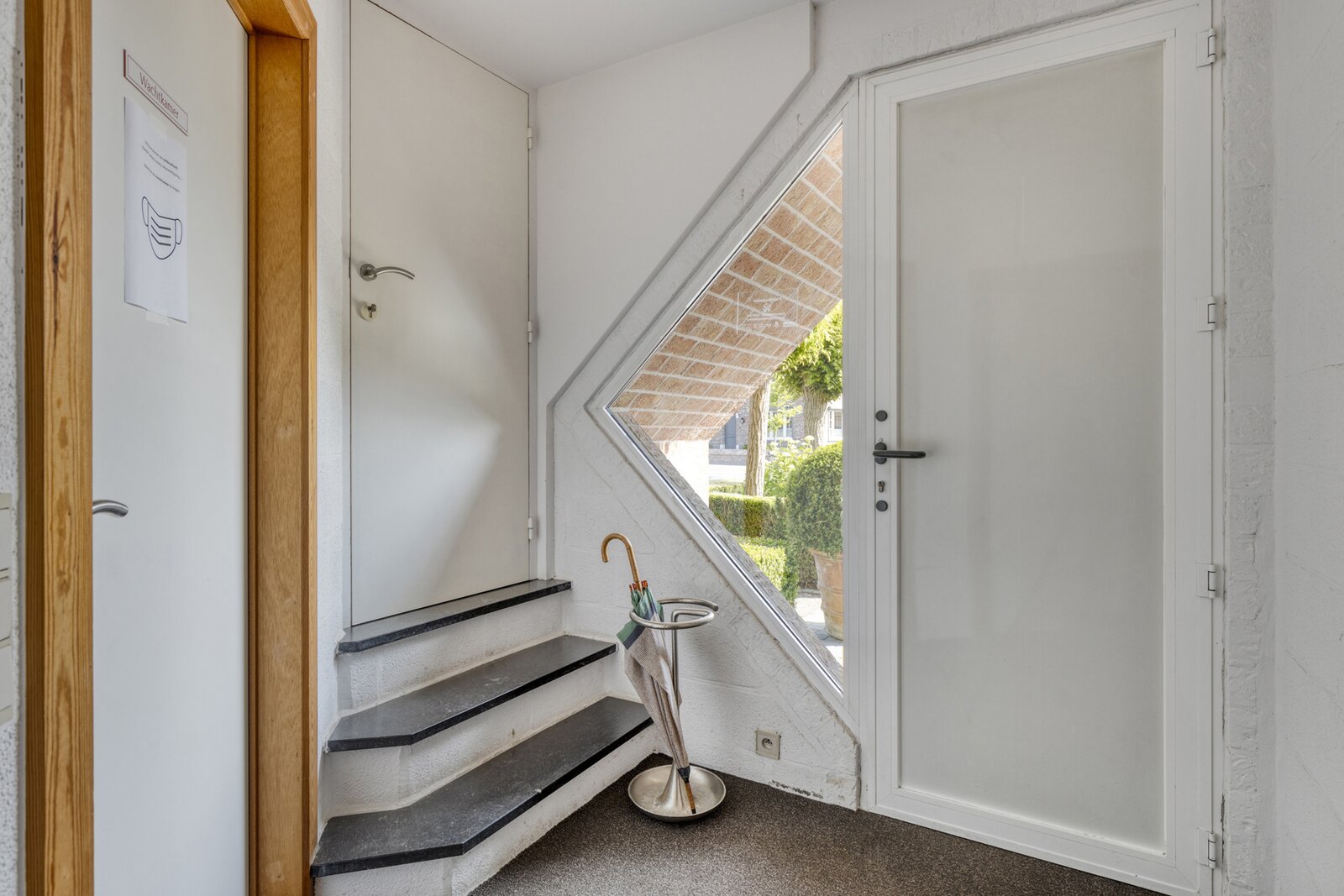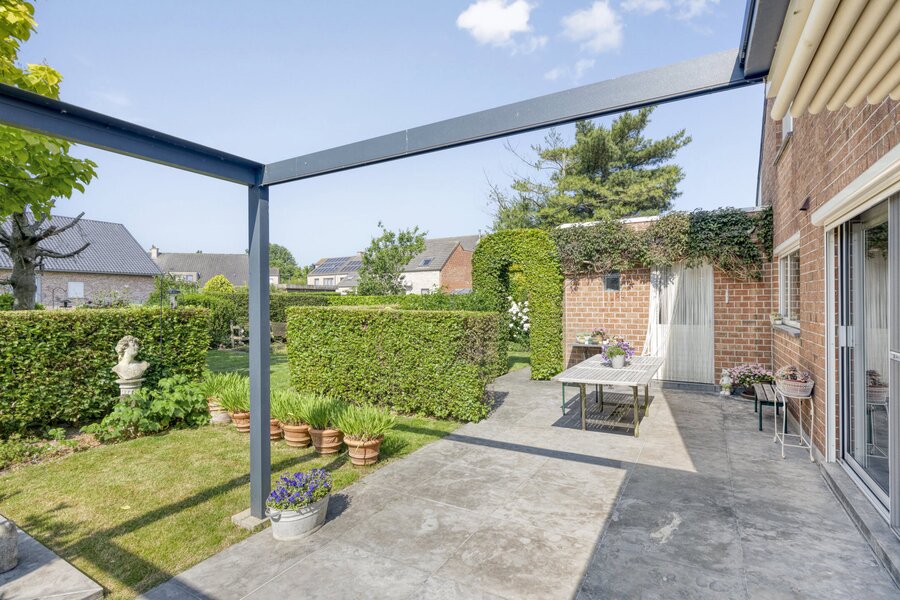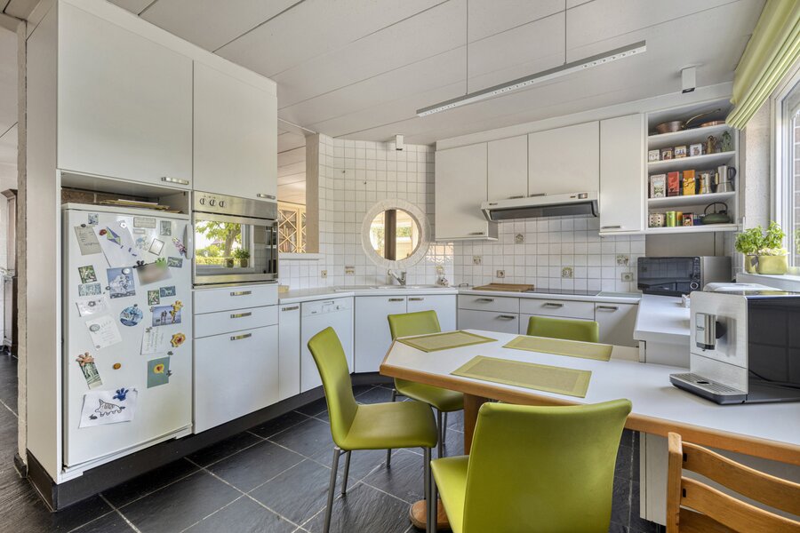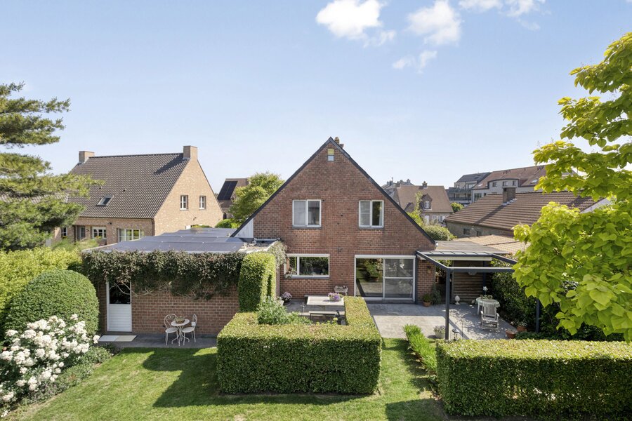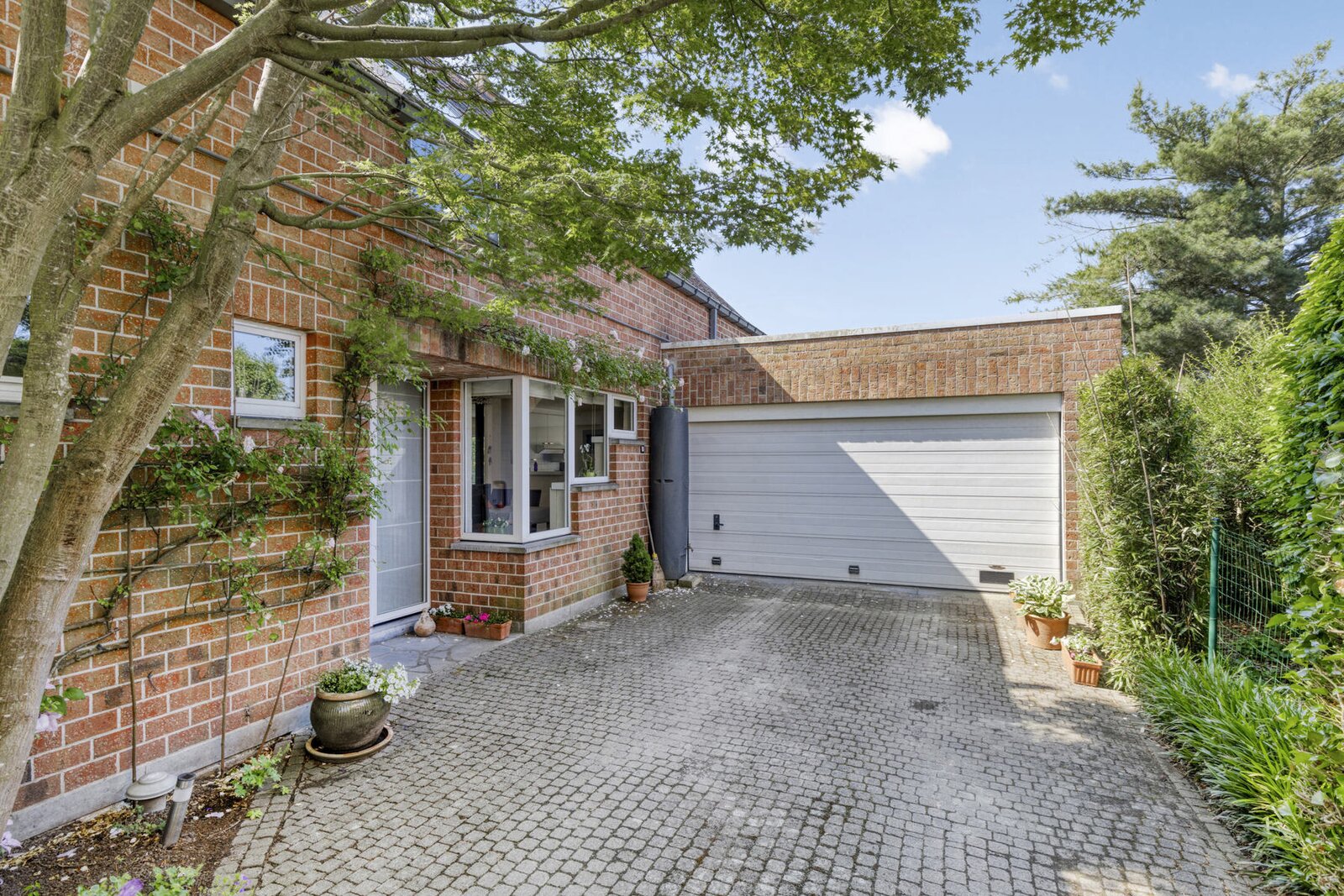 La maison dispose d’un hall d’entrée séparé pour la partie privée. Vous y découvrirez un vaste séjour lumineux avec de grandes baies vitrées offrant une vue imprenable sur le jardin orienté plein sud. Ce jardin, joliment aménagé, comprend un étang et plusieurs coins détente – un véritable havre de paix. La cuisine ouverte, entièrement équipée, est parfaitement agencée pour un confort optimal. Au rez-de-chaussée, vous trouverez également une grande buanderie ainsi qu’un double garage avec portes automatiques.