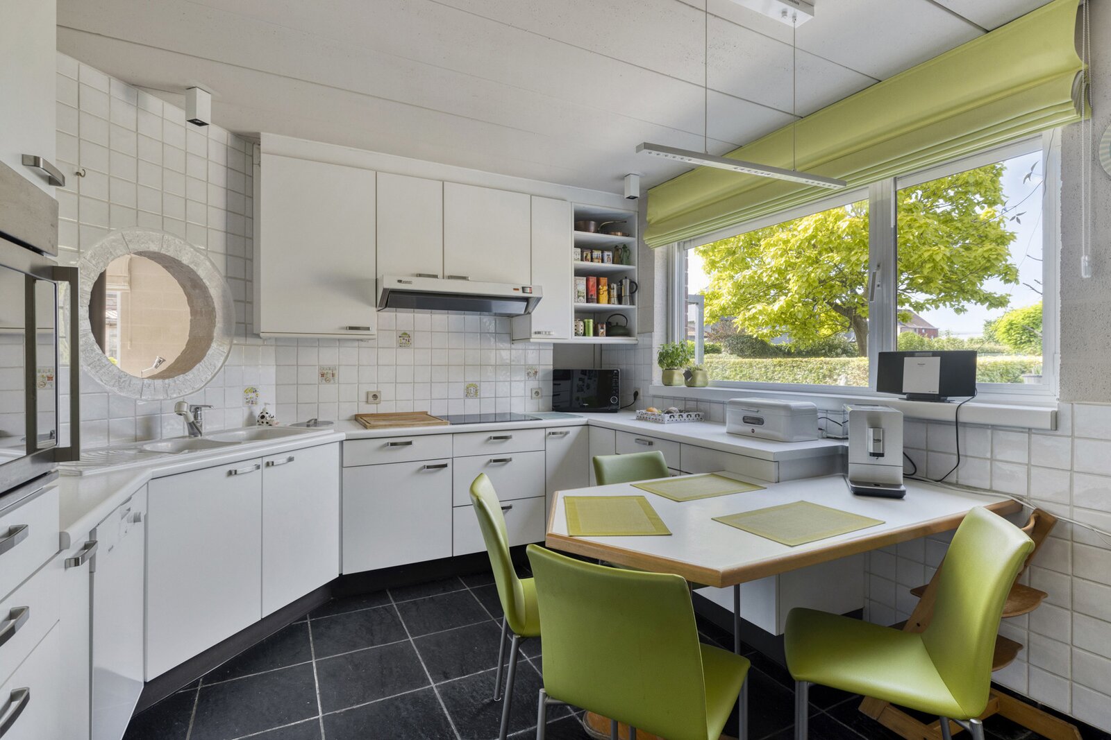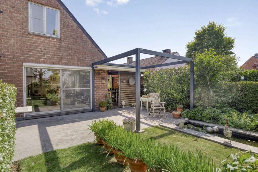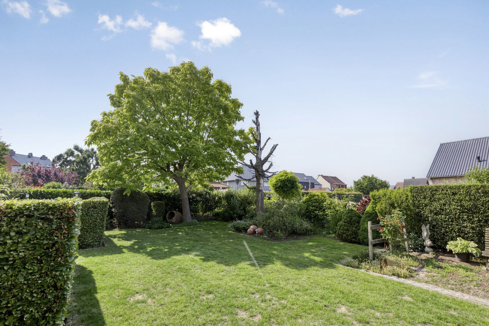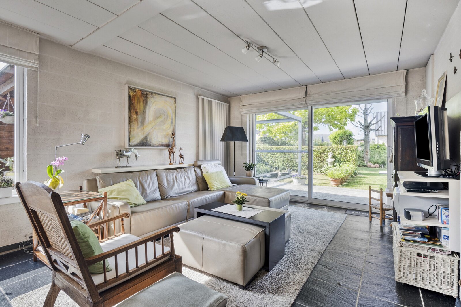 La maison dispose d’un hall d’entrée séparé pour la partie privée. Vous y découvrirez un vaste séjour lumineux avec de grandes baies vitrées offrant une vue imprenable sur le jardin orienté plein sud. Ce jardin, joliment aménagé, comprend un étang et plusieurs coins détente – un véritable havre de paix. La cuisine ouverte, entièrement équipée, est parfaitement agencée pour un confort optimal. Au rez-de-chaussée, vous trouverez également une grande buanderie ainsi qu’un double garage avec portes automatiques.