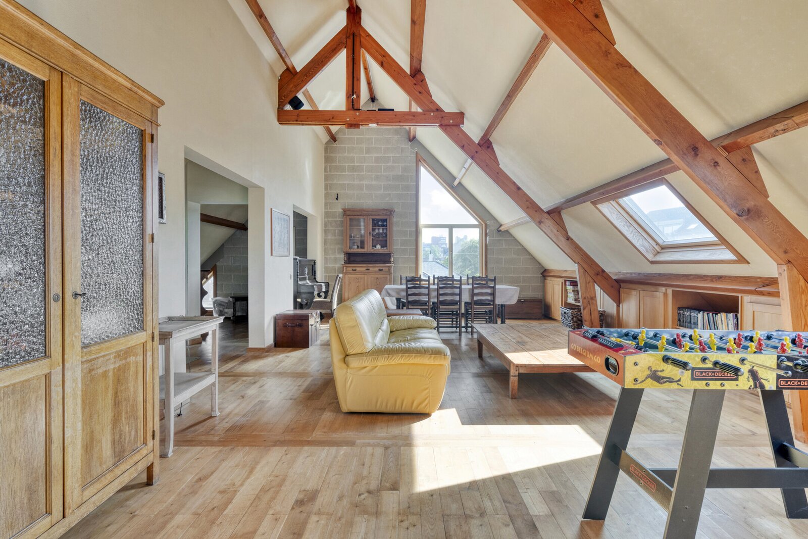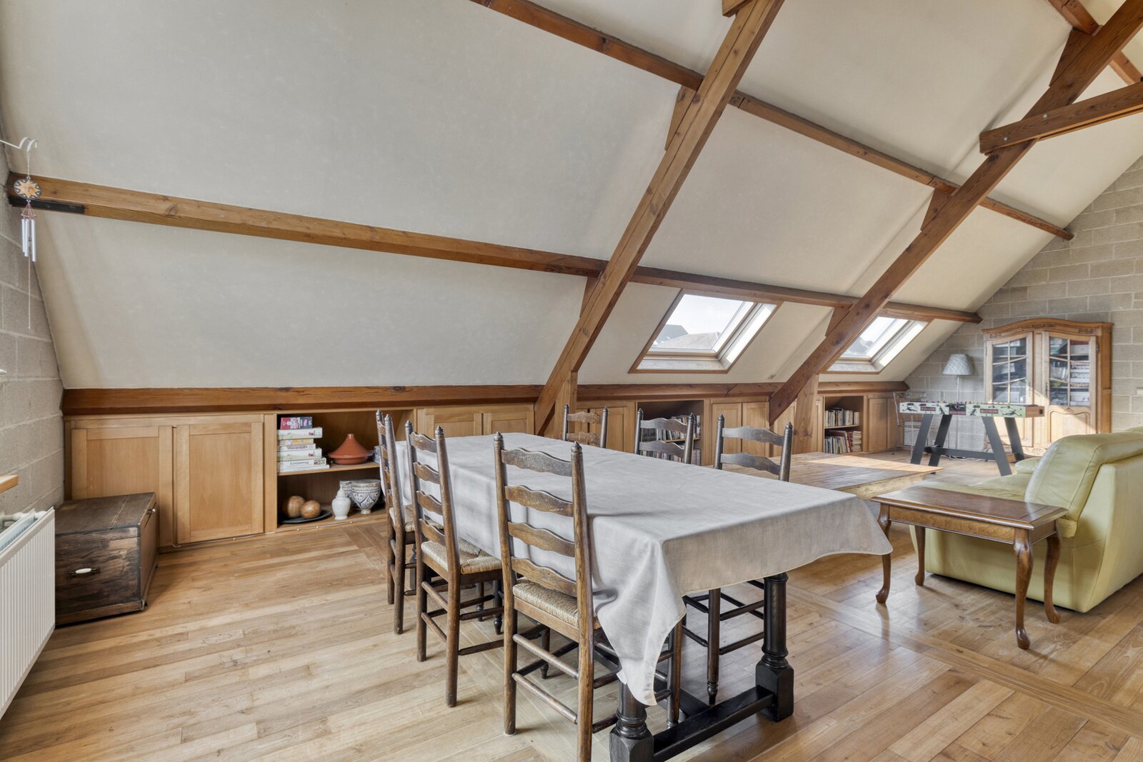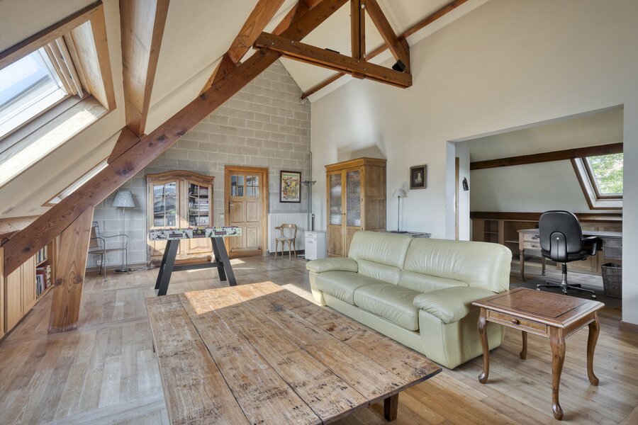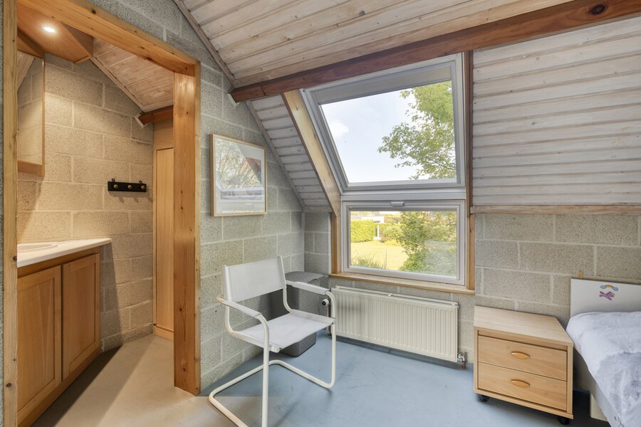À l’étage, la maison comprend quatre chambres spacieuses et une salle de bains équipée d’une baignoire et d’une douche. Atout supplémentaire : un espace polyvalent de pas moins de 65 m², idéal comme studio, salle de loisirs ou salle de réunion grâce à sa connexion directe avec le cabinet.