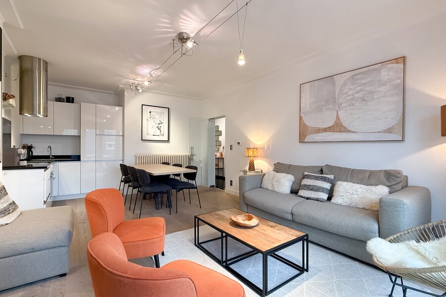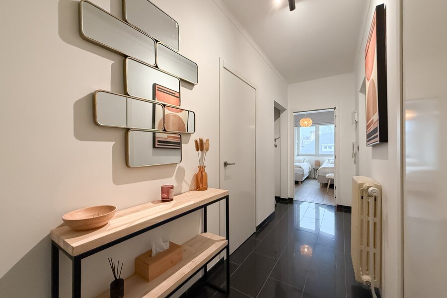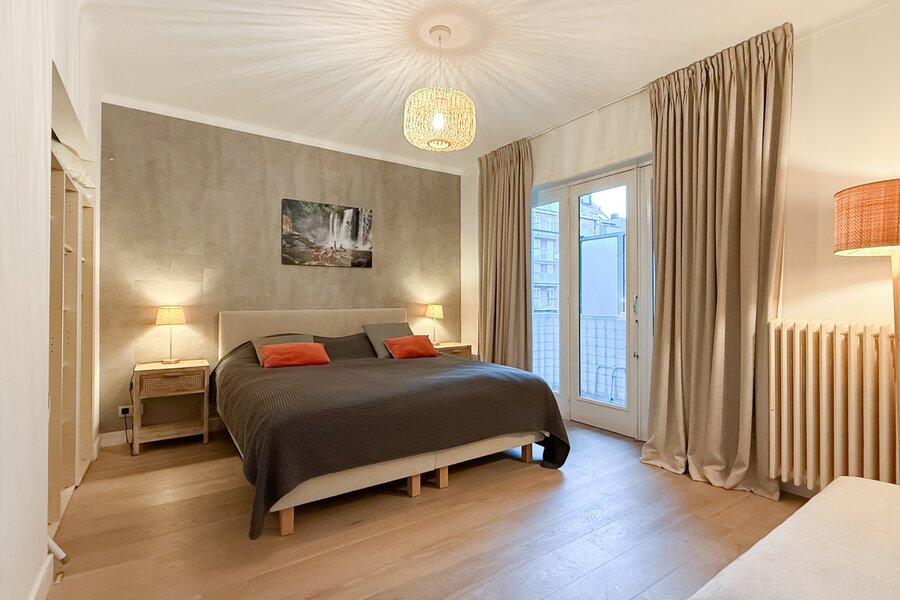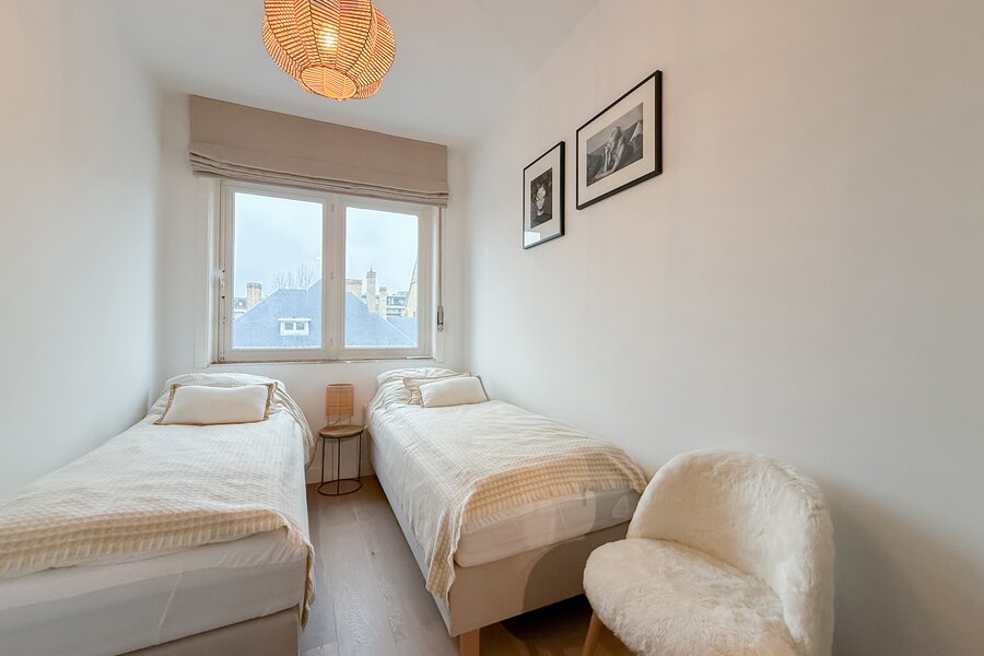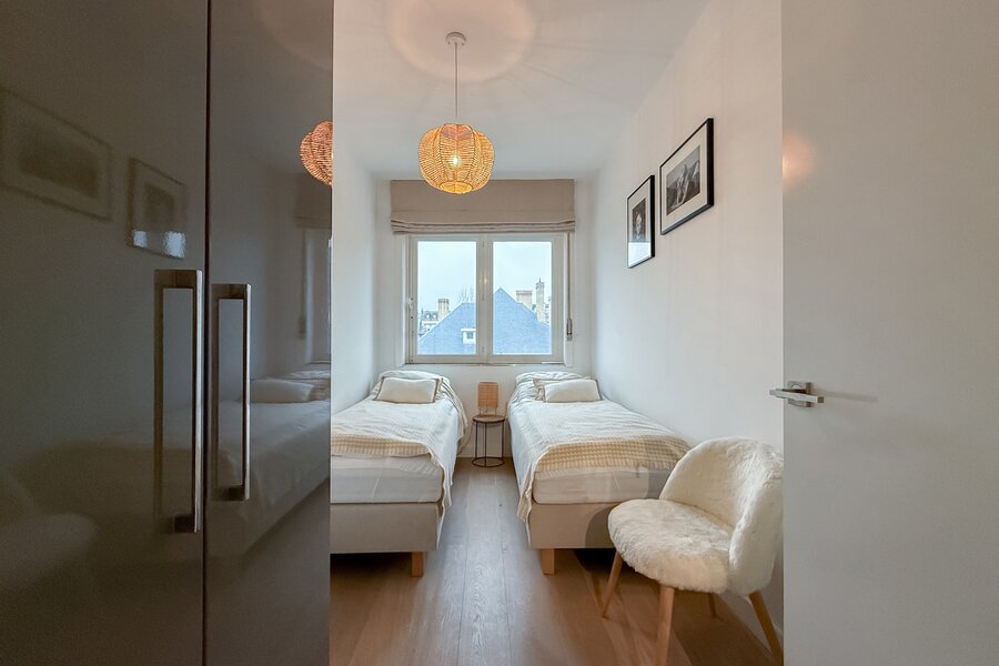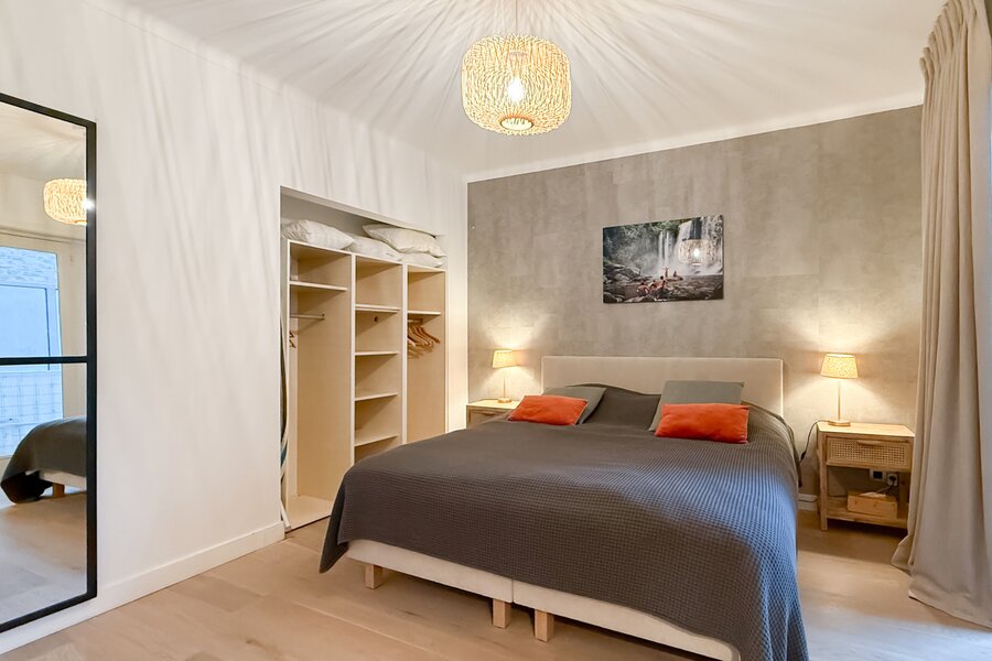 L’appartement comprend deux chambres, dont une spacieuse suite parentale à l’arrière avec accès à une seconde terrasse. La deuxième chambre est située à l’avant.