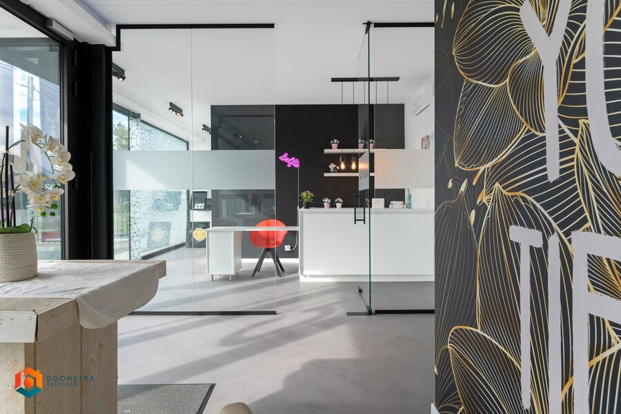 We betreden deze luxueuze villa via een ruime, lichtrijke inkomhal met gastentoilet. Het gelijkvloers heeft momenteel gedeeltelijk een professionele invulling. Enerzijds werd de ruimte ingericht als schoonheidsinstituut met een ontvangstruimte en twee behandelkamers, anderzijds vindt u er ook een toonzaal, kantoor- en opslagruimtes. Het betreft een multifunctionele verdieping die beschikt over alle nodige sanitaire voorzieningen en die dankzij de flexibele indeling en de aanwezigheid van een extra inkomhal eenvoudig herbestemd kan worden naar een andere (professionele) invulling. Belangrijk is dat een dergelijke professionele invulling enkel is toegestaan als nevenbestemming, met een maximale vloeroppervlakte van 93 m² die kan aangewend worden als toonzaal en bureelruimte. Aansluitend is er een inpandige garage, te bereiken langs de achterzijde van het pand.