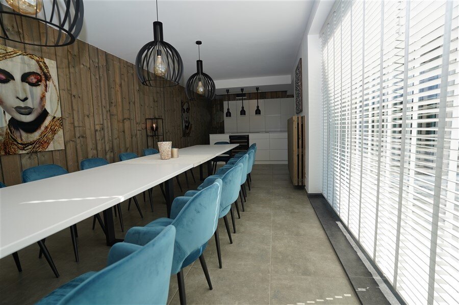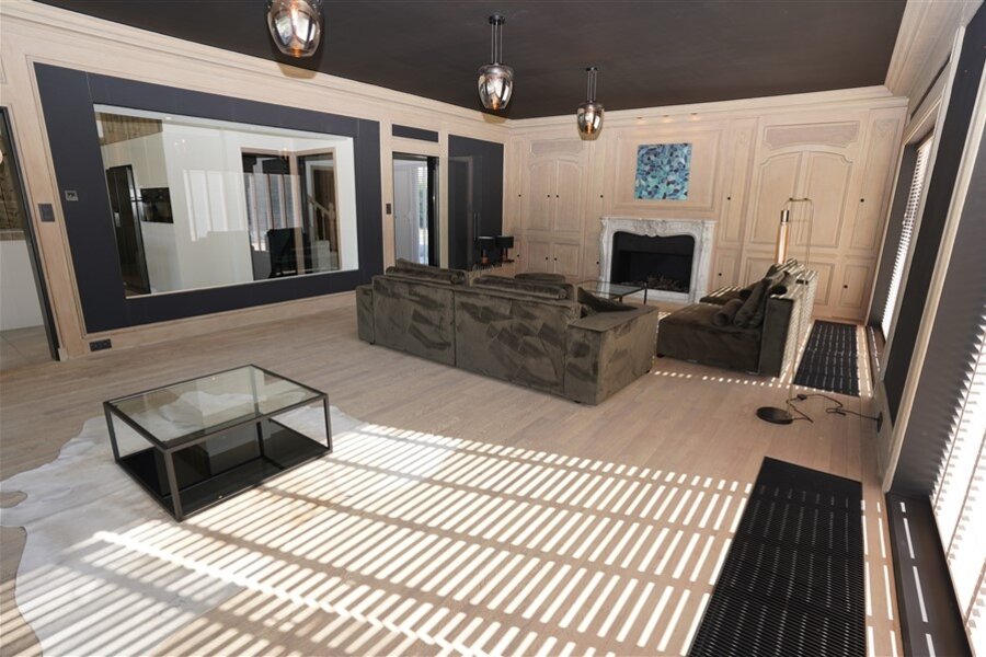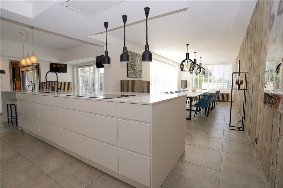 Rez-de-chaussée : Entrée (toilettes et vestiaire) - grand espace de vie de 65 m2 orienté vers le jardin avec cheminée - cuisine équipée blanche lumineuse avec grand îlot de travail - salle à manger avec table XL de qualité - bar de piscine aménagé