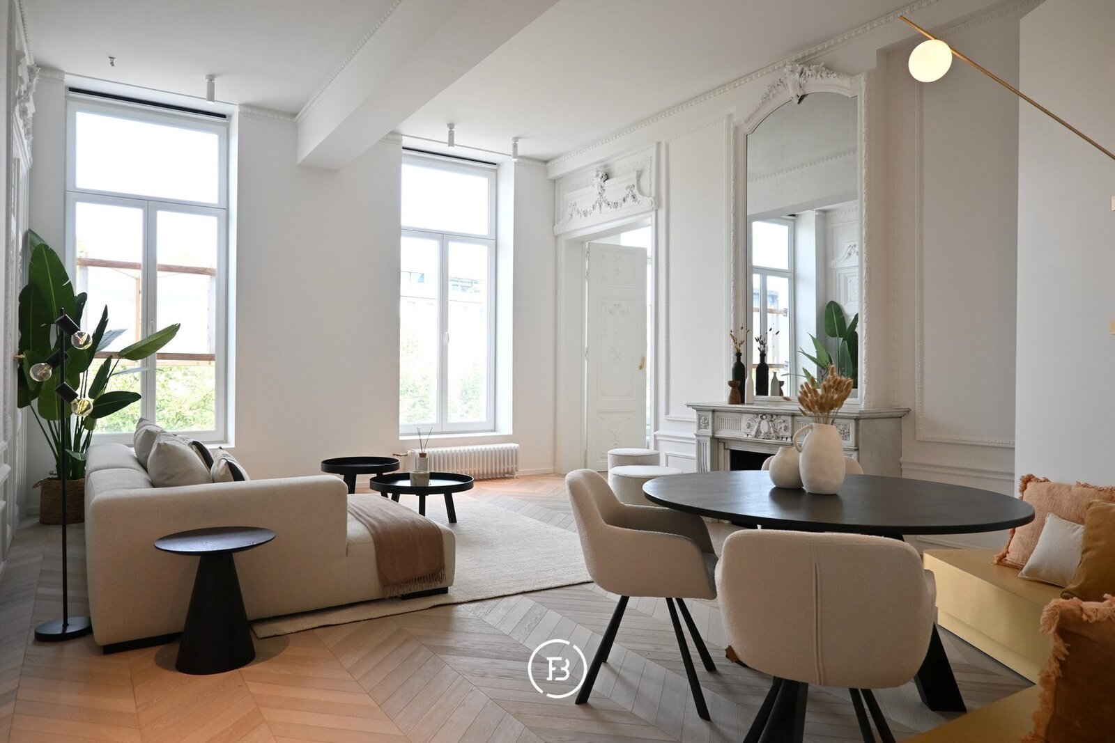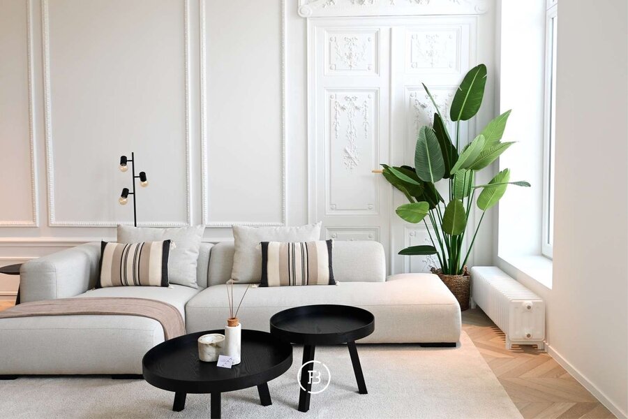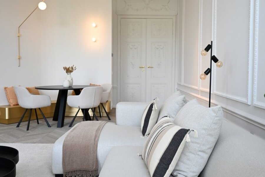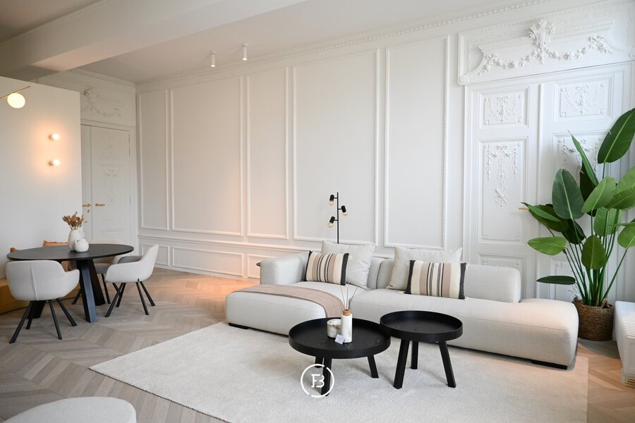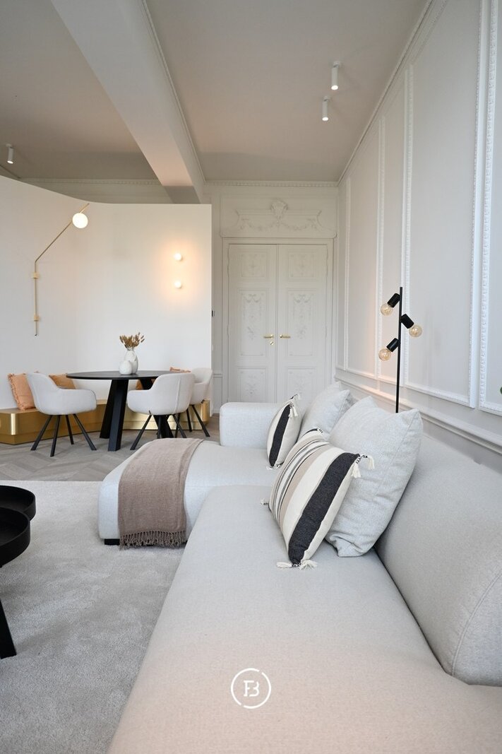 Vous entrez dans l'appartement par un espace de vie spacieux et lumineux avec un coin salon confortable et une salle à manger. Les nombreuses fenêtres et les hauts plafonds créent une sensation d'espace et de lumière.