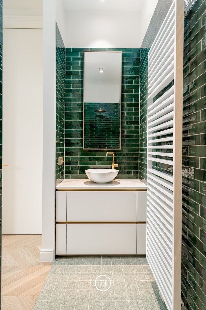 Par des portes authentiques, vous accédez à la cuisine équipée de modernes appareils Miele. L'appartement compte deux chambres, dont une avec salle de bains attenante avec lavabo et douche. La deuxième salle de bains se trouve dans le couloir et est équipée d'un lavabo et d'une baignoire. En outre, le couloir abrite des toilettes séparées et une buanderie spacieuse.
