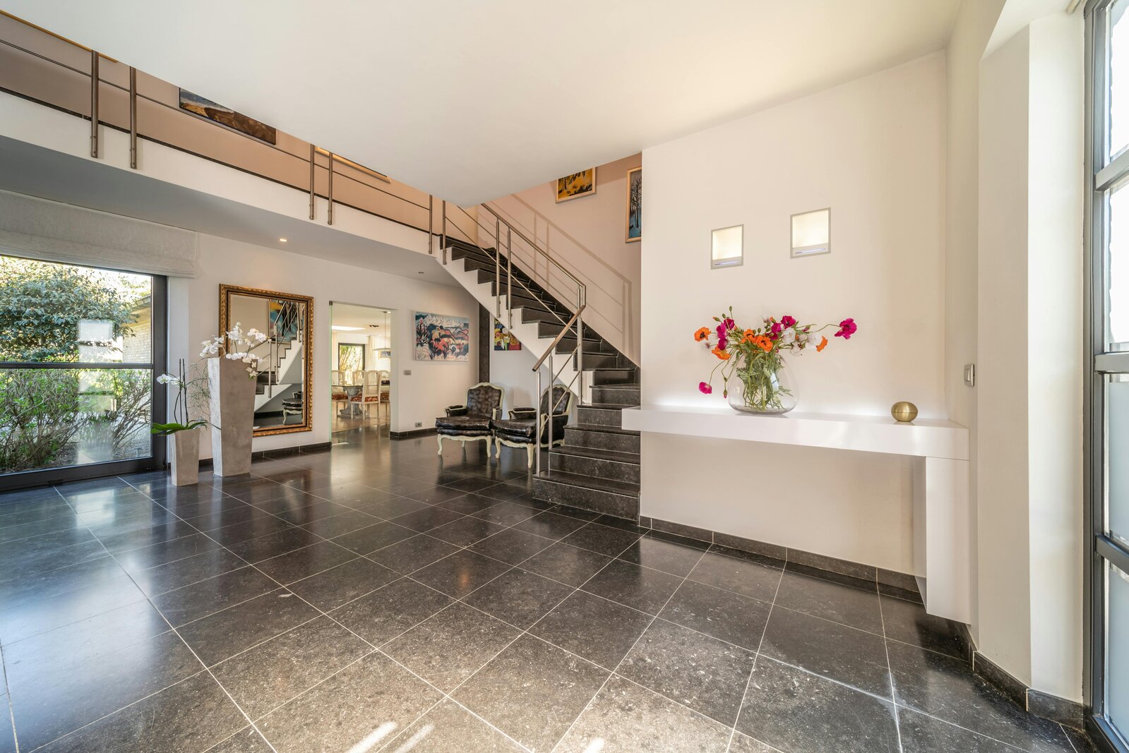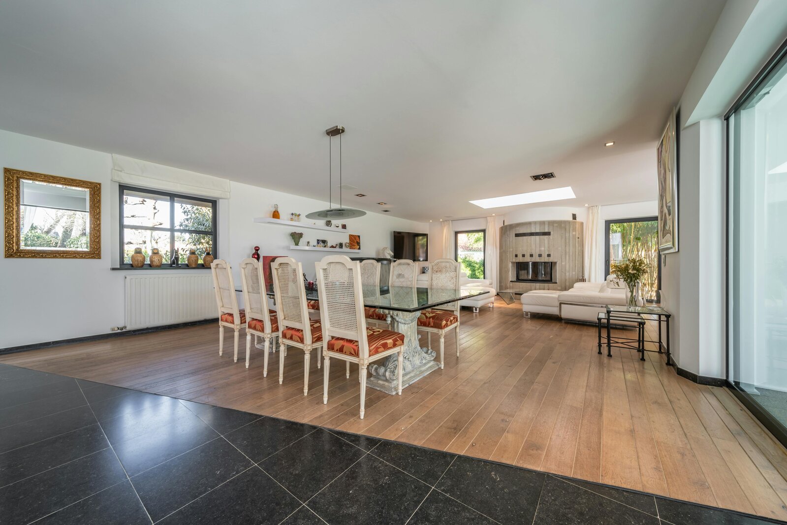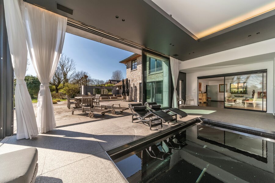 - salon spacieux avec cheminée et bar Depuis cet espace de vie, on accède à la piscine intérieure ultramoderne (sans chlore) avec tous les détails (jet stream, domotique, lucarne, installation antibuée intégrée, rideaux automatiques et même écran intégré avec projecteur). Il y a un sauna infrarouge avec douche à l'arrière ;
