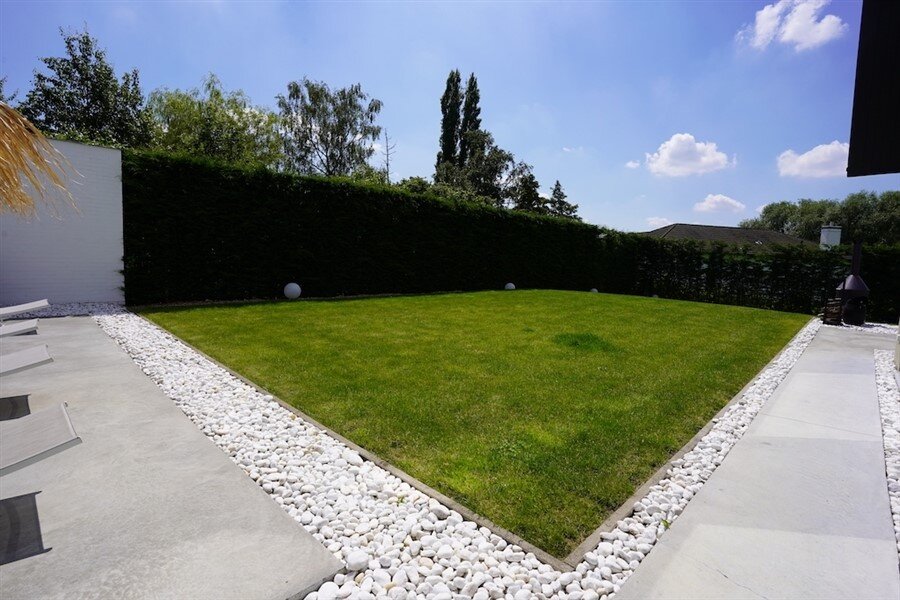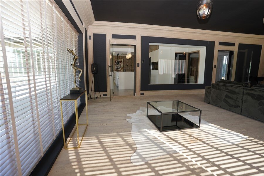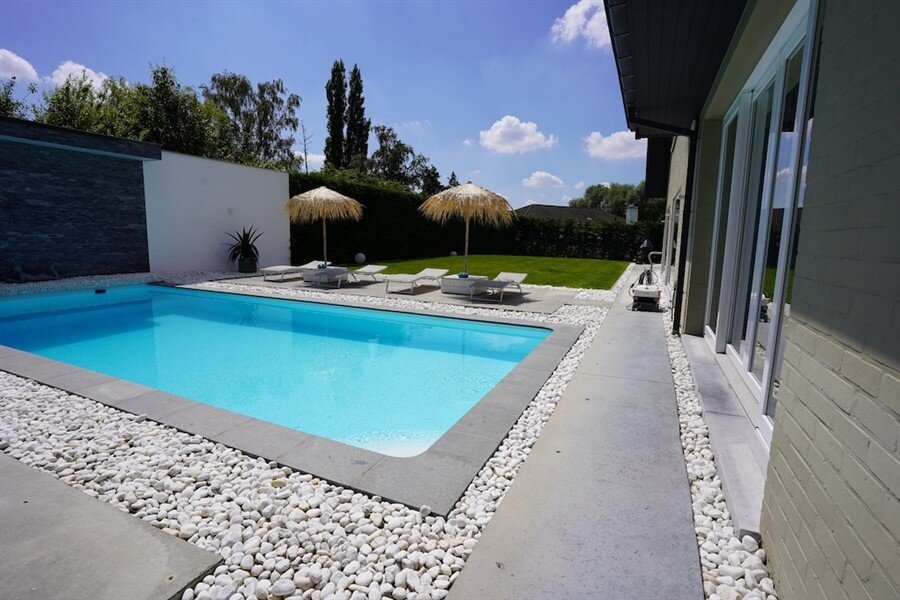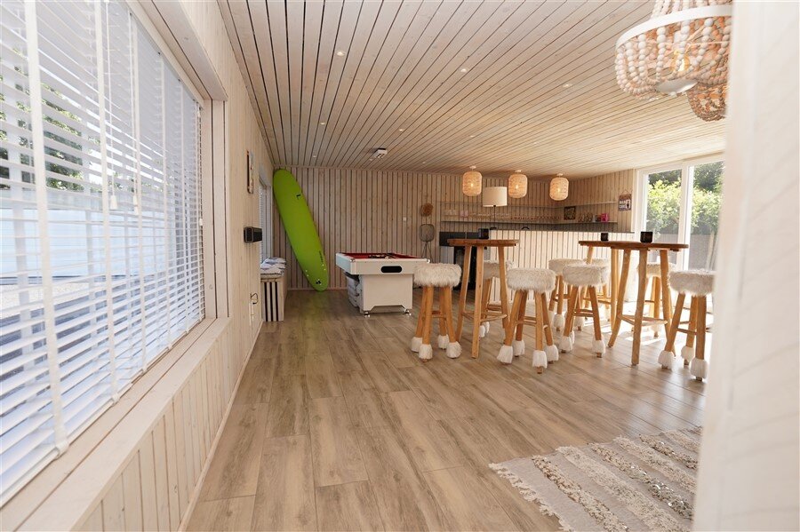 Rez-de-chaussée : Entrée (toilettes et vestiaire) - grand espace de vie de 65 m2 orienté vers le jardin avec cheminée - cuisine équipée blanche lumineuse avec grand îlot de travail - salle à manger avec table XL de qualité - bar de piscine aménagé