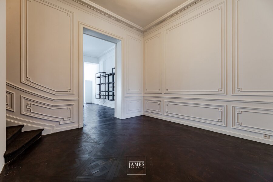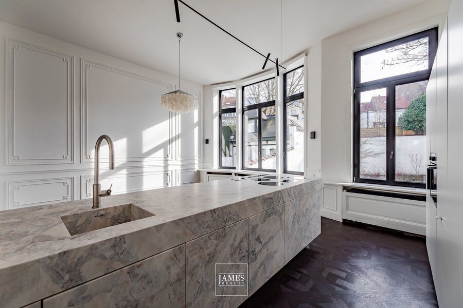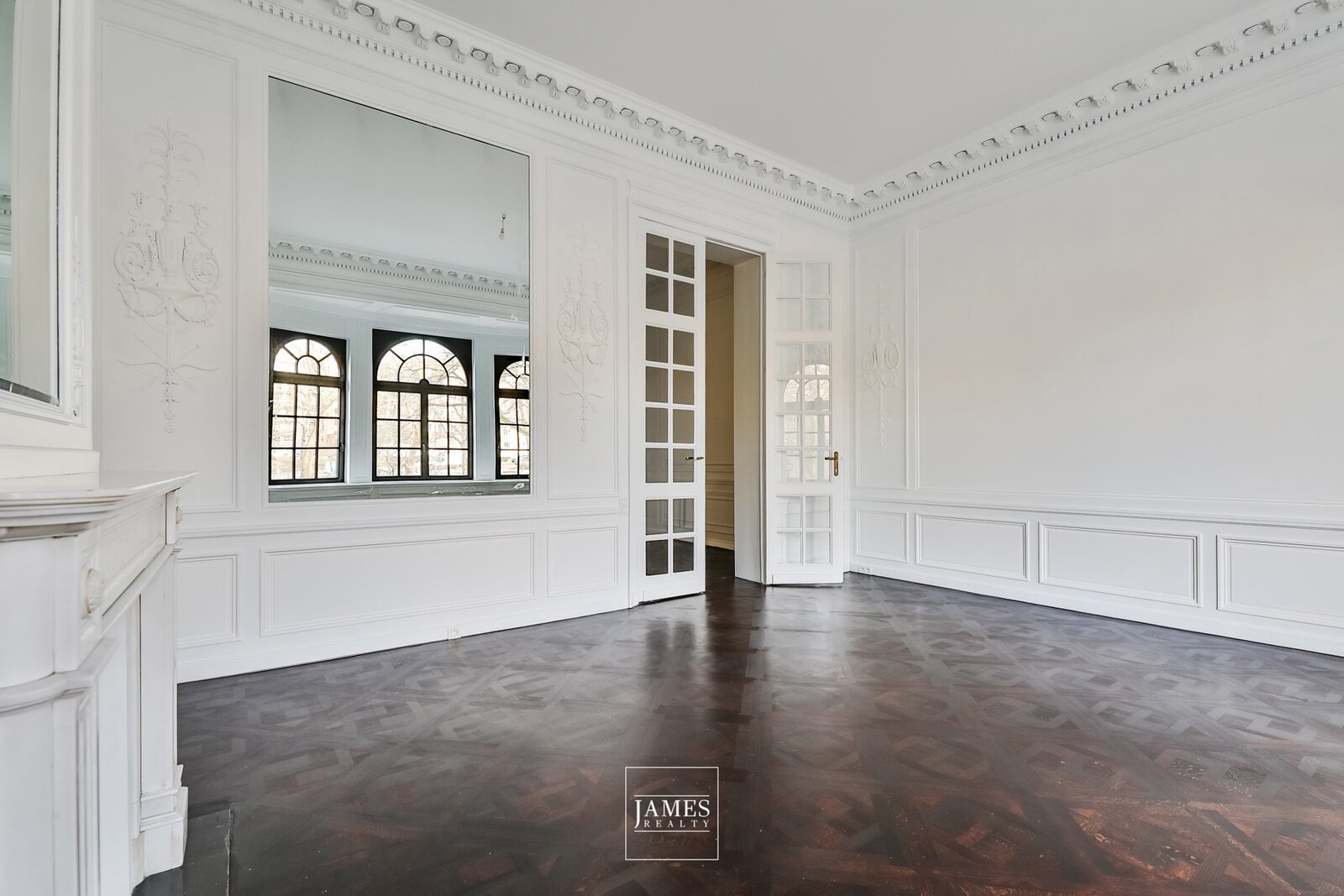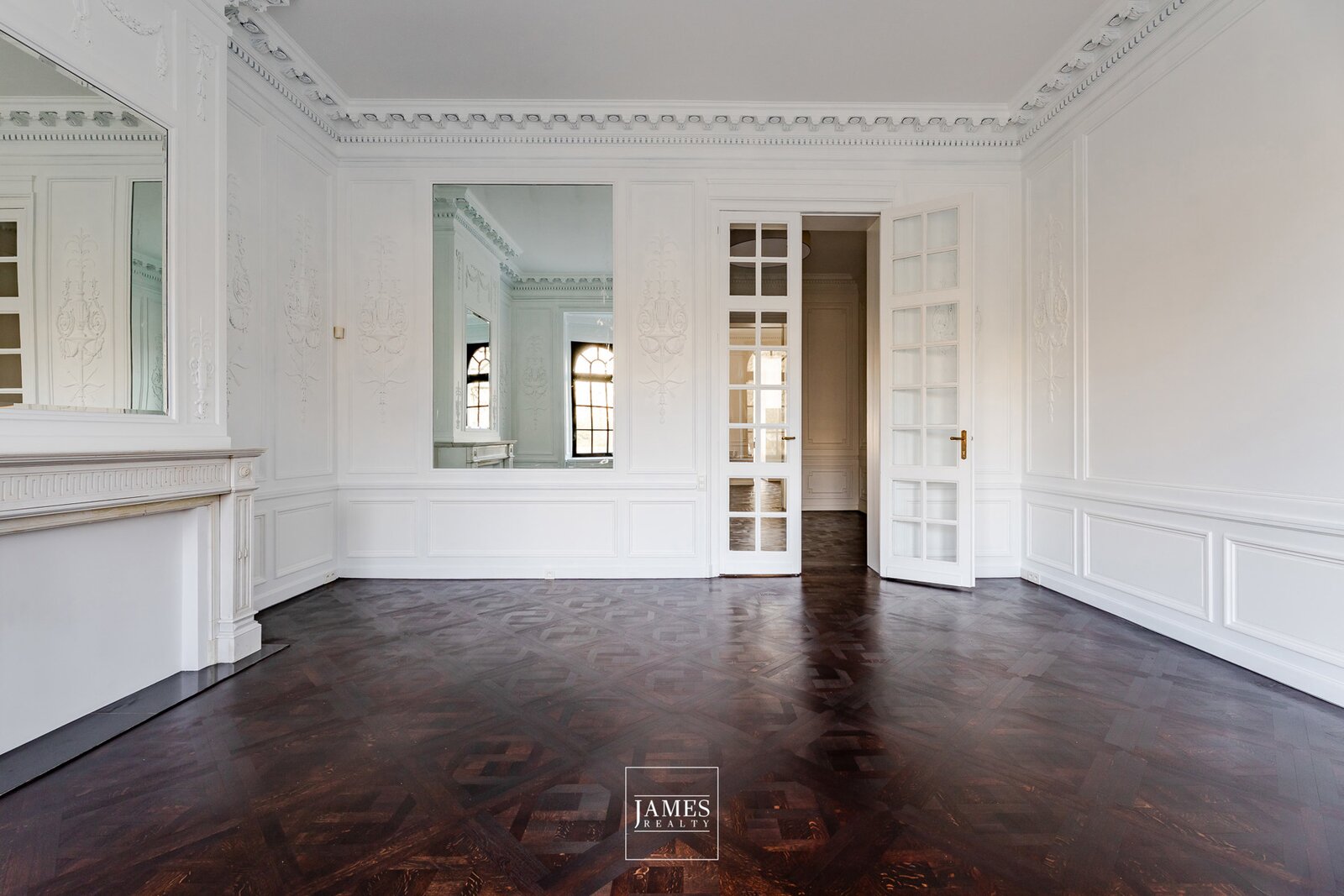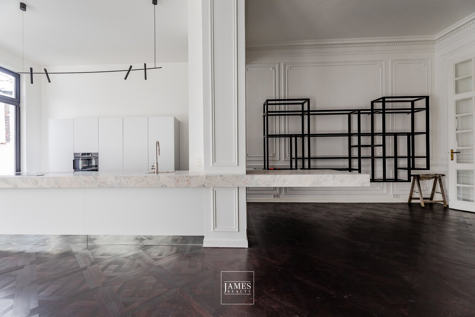 Très bien située dans une rue élégante des étangs d'Ixelles, ravissante maison de maître de style Beaux-Arts (architecte Georges Cochaux) intégralement rénovée il y a un an (après une rénovation complète par 3ème bureau il y a une vingtaine d'années) tout en conservant ses éléments d'origine de qualité tels que parquets en chêne, hauts plafonds moulurés, manteaux de cheminée en marbre etc).