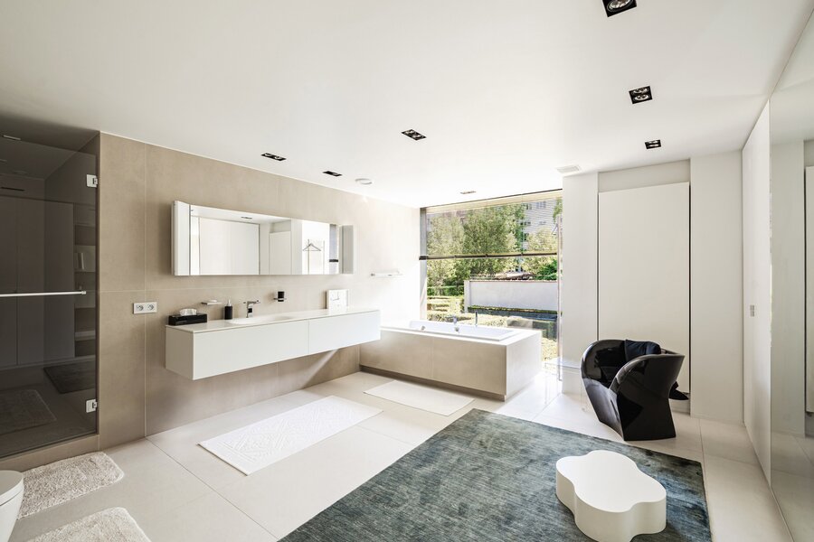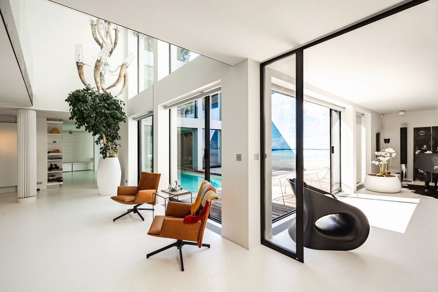 Alliant lignes épurées et finitions haut de gamme, cet ensemble unique se compose d'un hall d'entrée desservant d'un côté de vastes réceptions baignées de lumière grâce à de larges baies vitrés s'ouvrant sur une terrasse intimiste agrémentée d'une piscine et d'un espace wellness, véritable havre de paix. De l'autre côté, un deuxième salon avec son insert au gaz vous mènera à la cuisine conçue par Siematic. A l'étage la partie nuit offre une spacieuse suite parentale avec dressing intégré et salle de bain complète attenante avec vue sur le patio intérieur et deux autres chambres avec salle de bain en suite. Un espace attenant/indépendant de ± 200 m² avec entrée privative propose un espace de vie avec cuisine, un home cinéma et un espace poyvalent (bureau) ainsi qu' une chambre avec salle de bain en suite.