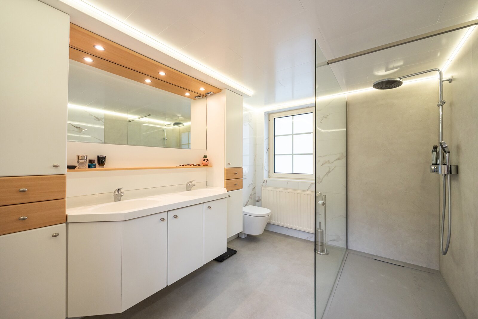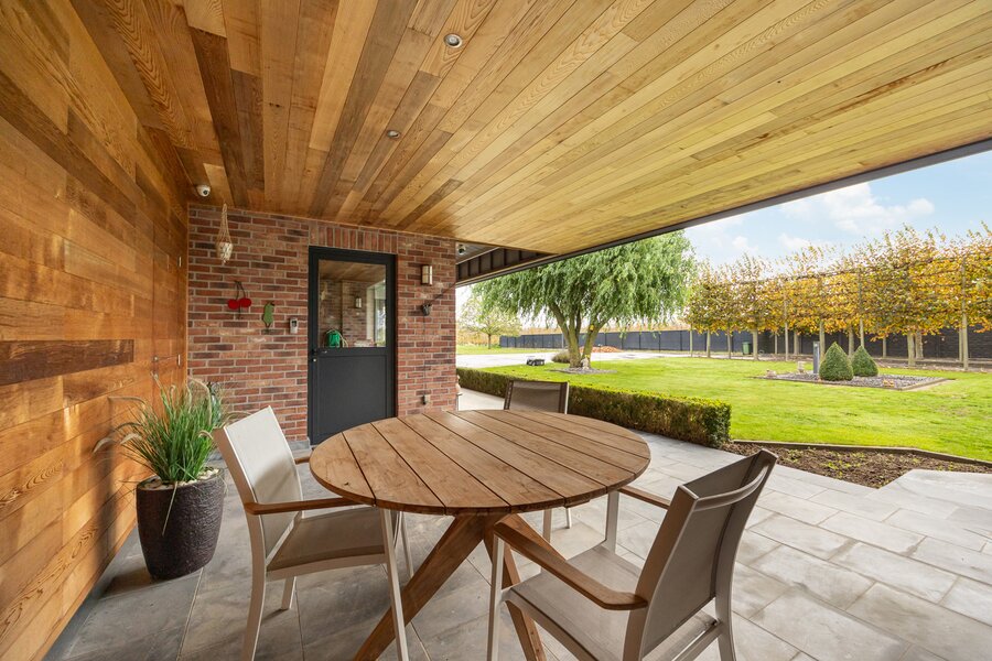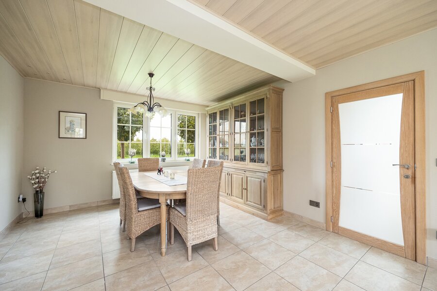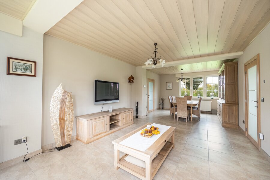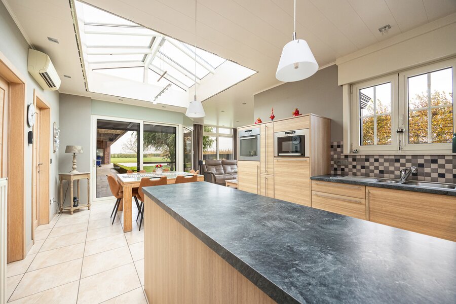 Binnenin vind je een aangename leefruimte met een warme, open sfeer. De keuken werd vernieuwd in 2007 en is volledig uitgerust met kwaliteitsvolle toestellen. Aansluitend bevindt zich een gezellige veranda, eveneens geplaatst in 2007, die overgaat in een overdekt terras waar het heerlijk vertoeven is in elk seizoen. De badkamers werden in 2025 volledig vernieuwd en stralen hedendaagse elegantie uit. De woning beschikt verder over drie ruime slaapkamers, dubbele beglazing (vervangen in 2000 en 2007), een energiezuinig EPC-label C en een recente mazoutketel uit 2006.