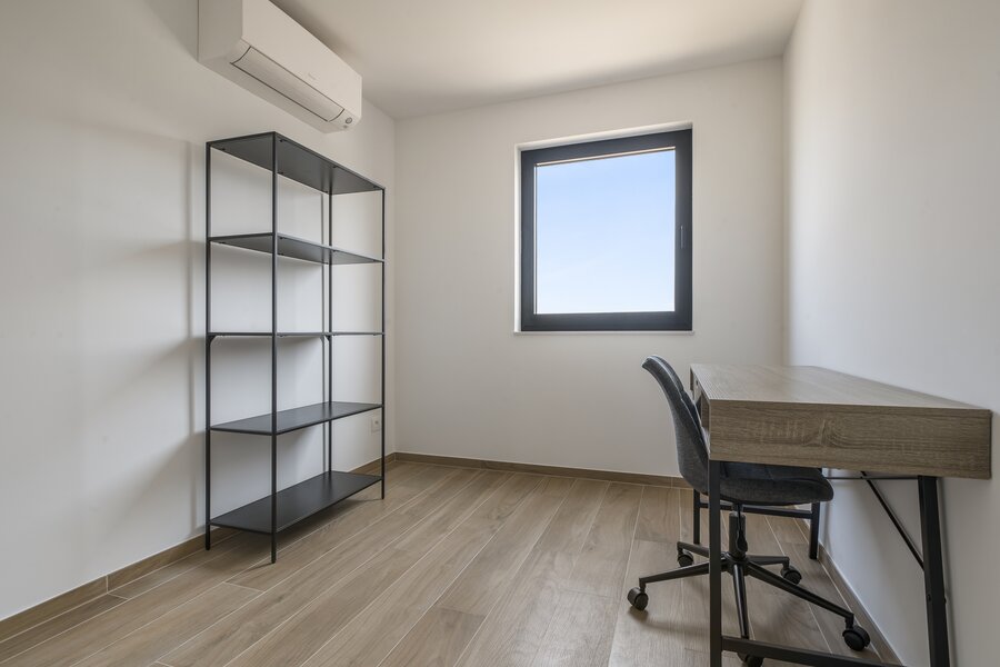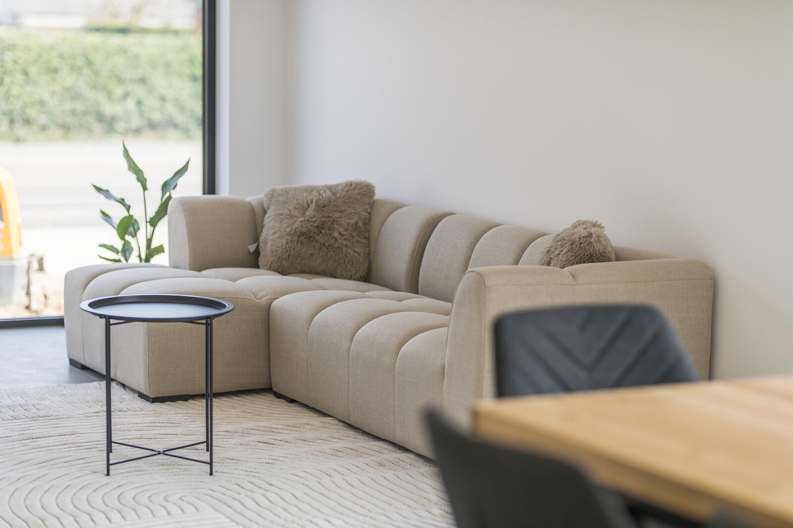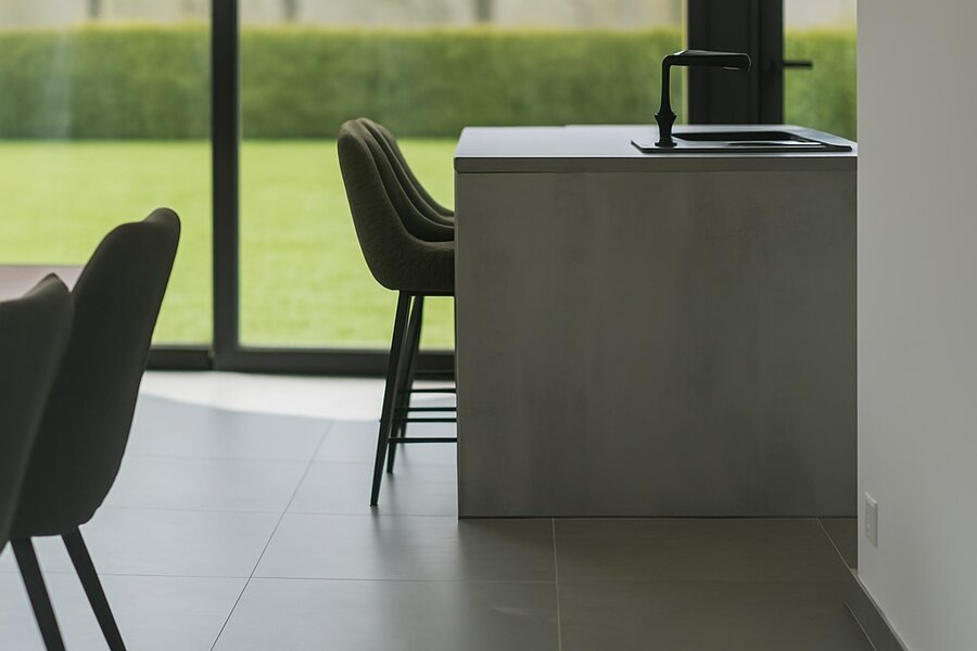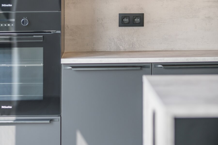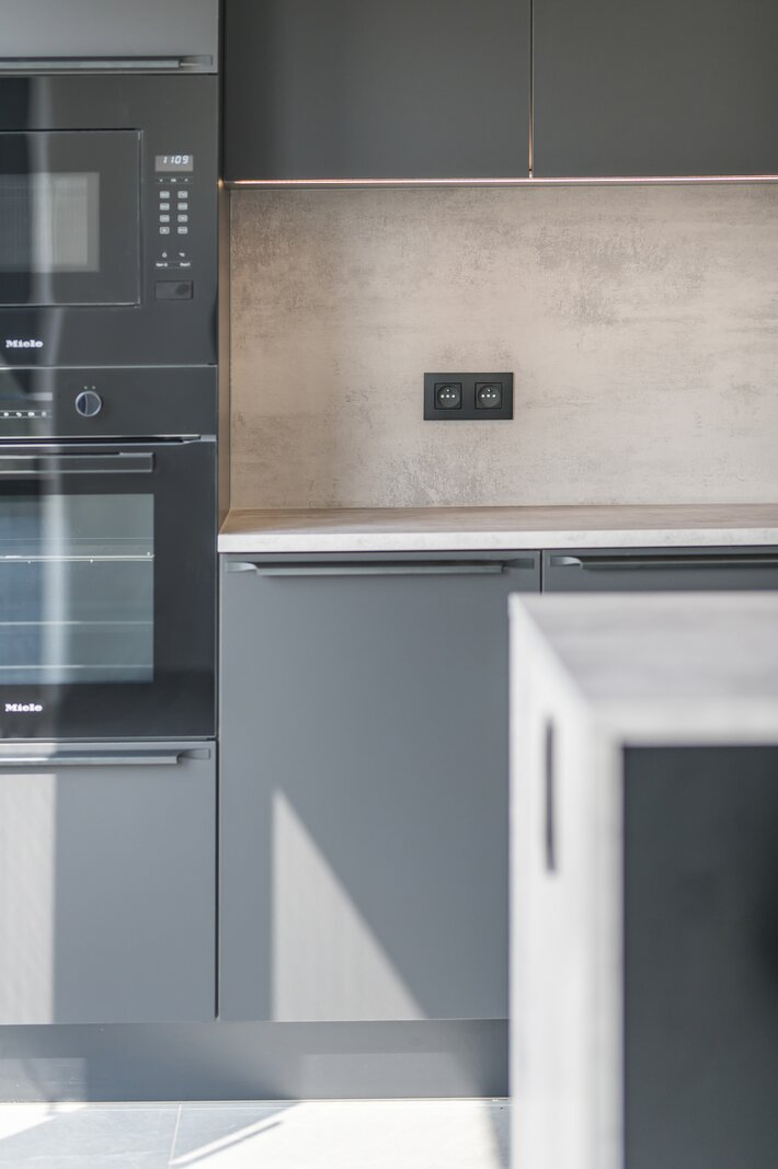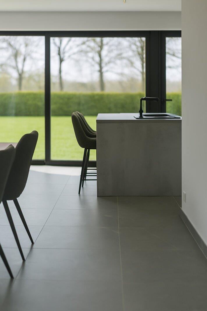La pièce de vie ouverte communique avec la cuisine de qualité dotée d’un îlot convivial. À côté se trouve un espace de rangement pratique.