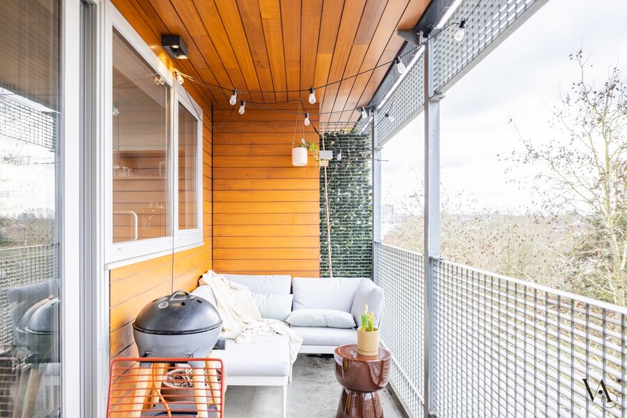 Via de trap bereik je de derde verdieping, de leefverdieping. Deze verwelkomt je met een gastentoilet en een ruime berging, waarna je binnenkomt in de prachtige open leefruimte. Grote raampartijen zorgen voor een overvloed aan natuurlijk licht en creëren een warme, uitnodigende sfeer. De leefruimte sluit naadloos aan op de eetplaats en de moderne, volledig ingerichte keuken met strakke afwerking en kwalitatieve toestellen.