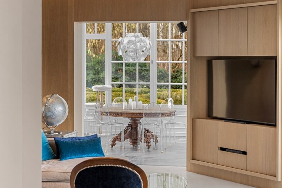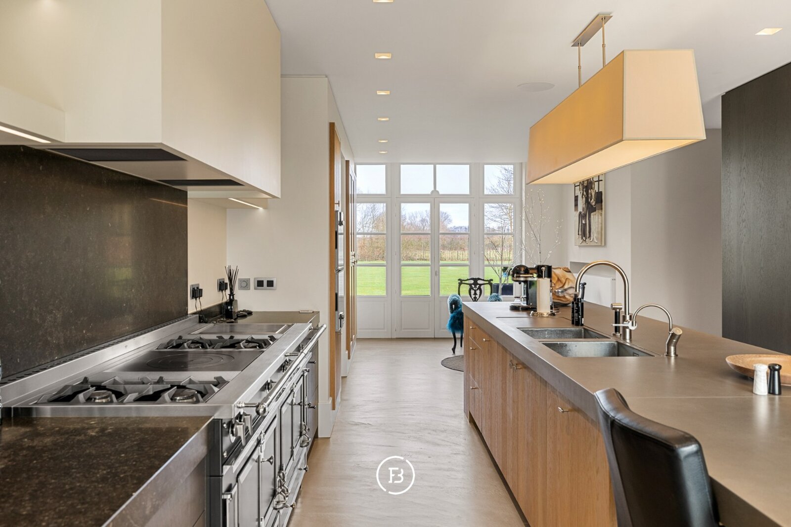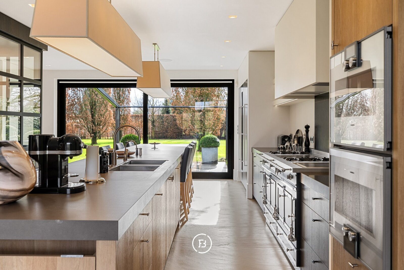 La cuisine sur mesure, équipée d'appareils de qualité tels qu'une cuisinière à gaz LA CORNUE, des doubles fours et des équipements modernes supplémentaires, est le cœur de la maison. Un îlot de cuisine qui se prolonge dans une grande salle à manger et l'accès à deux terrasses - l'une avec vue sur la piscine et l'autre idéale pour un petit-déjeuner ensoleillé - complètent l'ensemble.