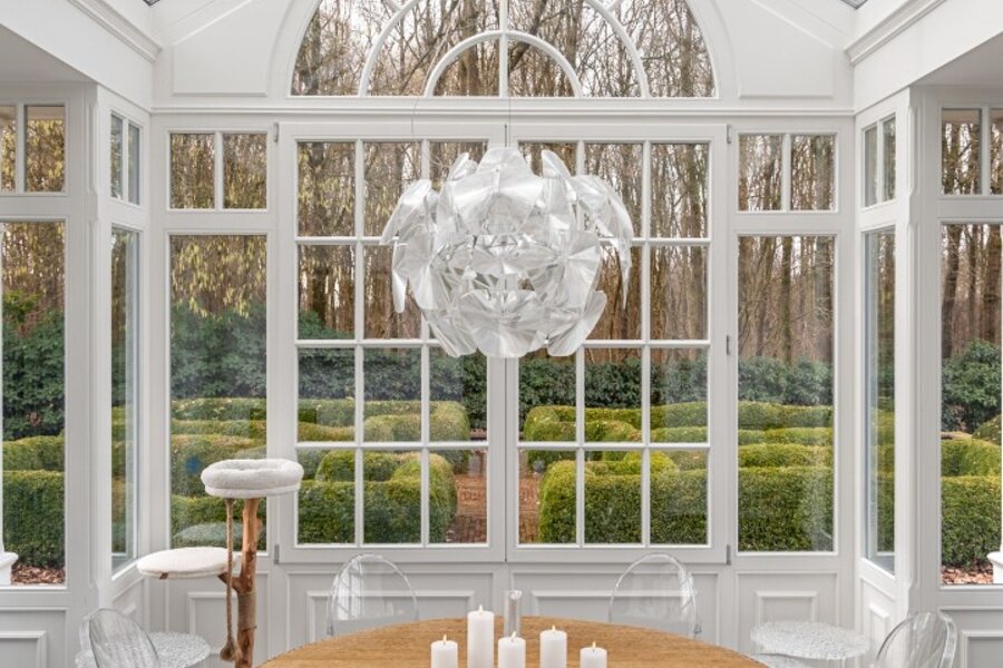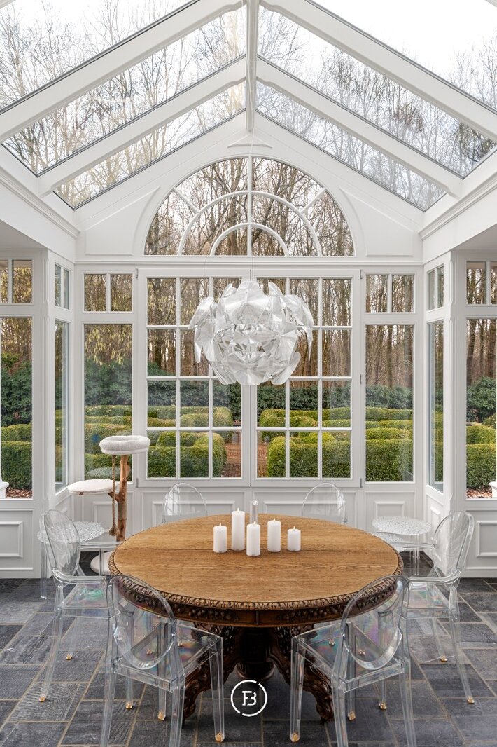 La propriété dispose de deux espaces de vie uniques : l'un avec une cheminée à gaz moderne et de grandes fenêtres, et un second avec une vue panoramique sur le jardin et un accès direct à l'orangerie pleine de charme.