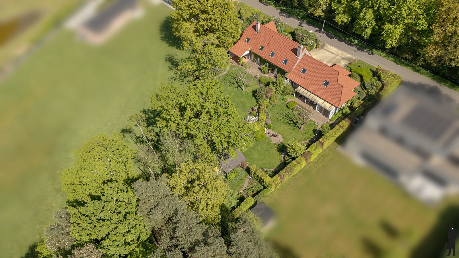 De woning biedt vooraan buitenparking voor 5 à 6 wagens. Aan de beide zijden van de woning bevinden zich groenstructuren en rechts een oostgeoriënteerd ochtendterras. Beide vleugels beschikken over ruime (overdekte) terrassen. Deze terrassen geven uit op een diepe, landelijke en private natuurtuin, ideaal georiënteerd op het Westen. U vindt er naast (groenblijvende en bloeiende) heesters zoals hortensia's, rododendrons ook imposante eikenbomen, Wilde wingerd, krentenboompjes, plataanbomen en krulwilg. Achteraan is er een denbosgedeelte.