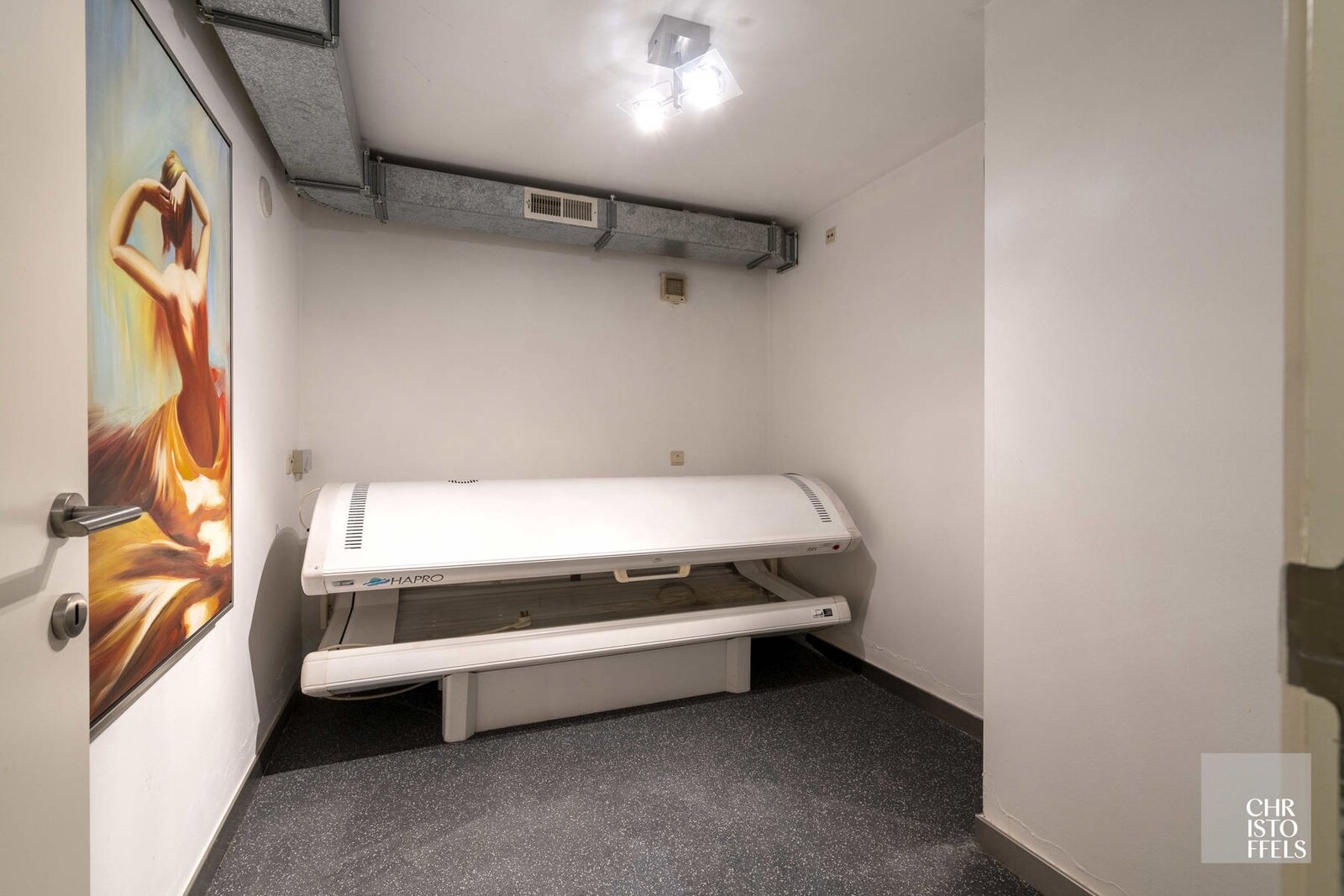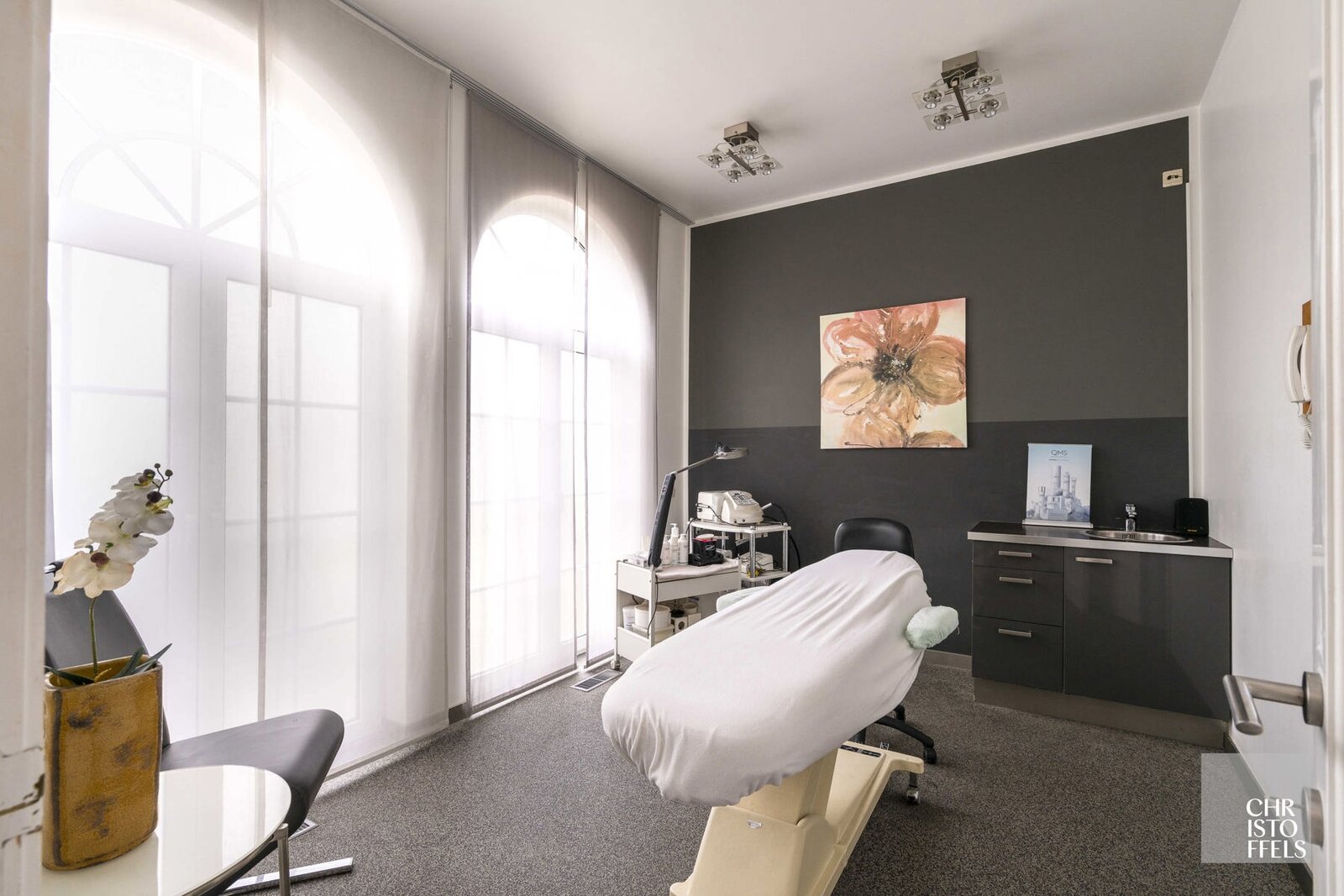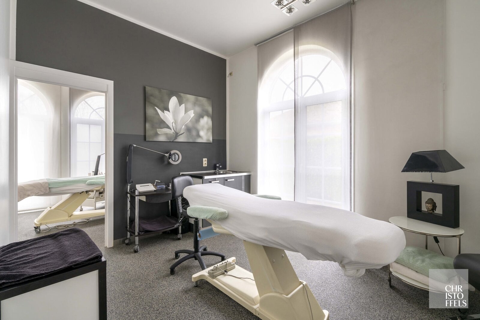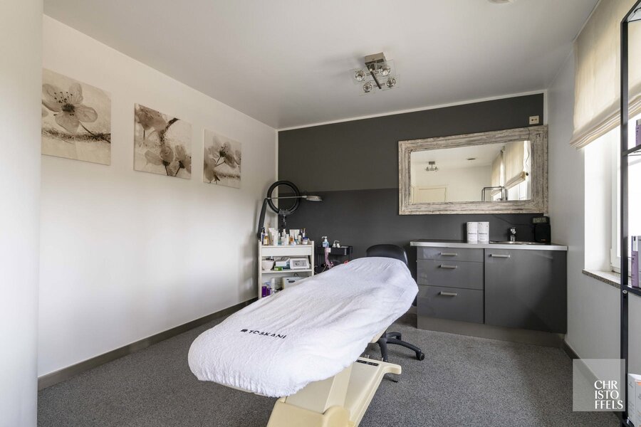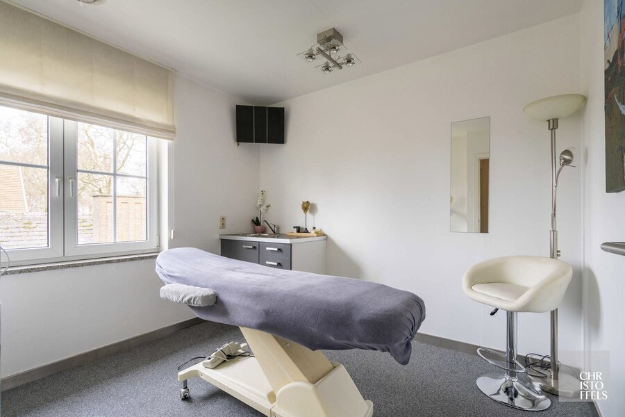 Het praktijk gedeelte heeft op het gelijkvloers een ontvangst - wachtruimte, twee behandelkamers en een douche ruimte. Via een interne trap is er toegang naar 3 extra behandelruimtes op de verdieping. Alle ruimtes zijn voorzien van wateraansluiting en een enkele wastafel. Verder is het salon ook voorzien van een warmtepomp. Vanuit de parktijk is er ook toegang naar de kelder verdieping onder de volledige woning waar er ruimte is voor opslag, een ontspanningsruimte en technische ruimtes.